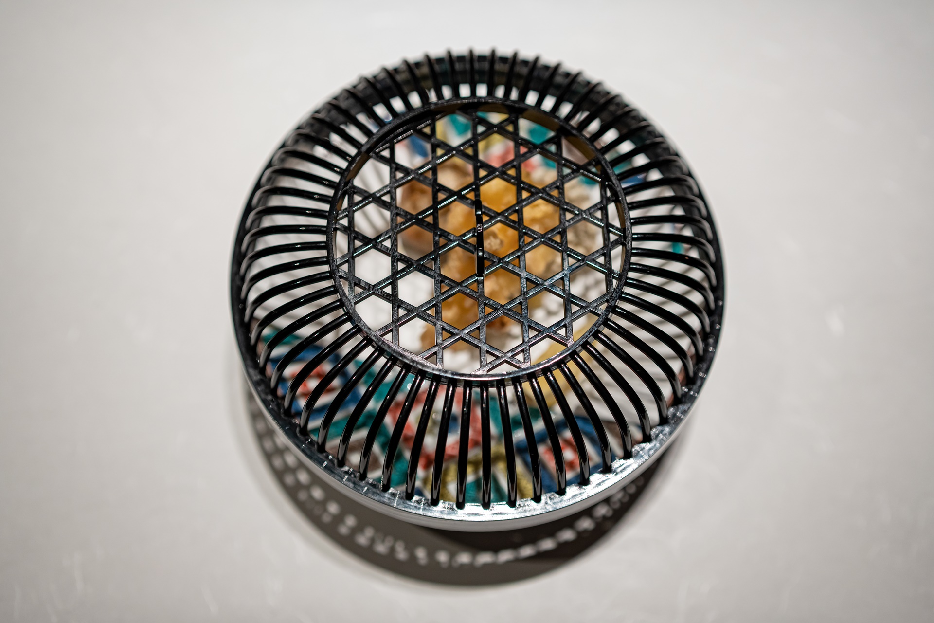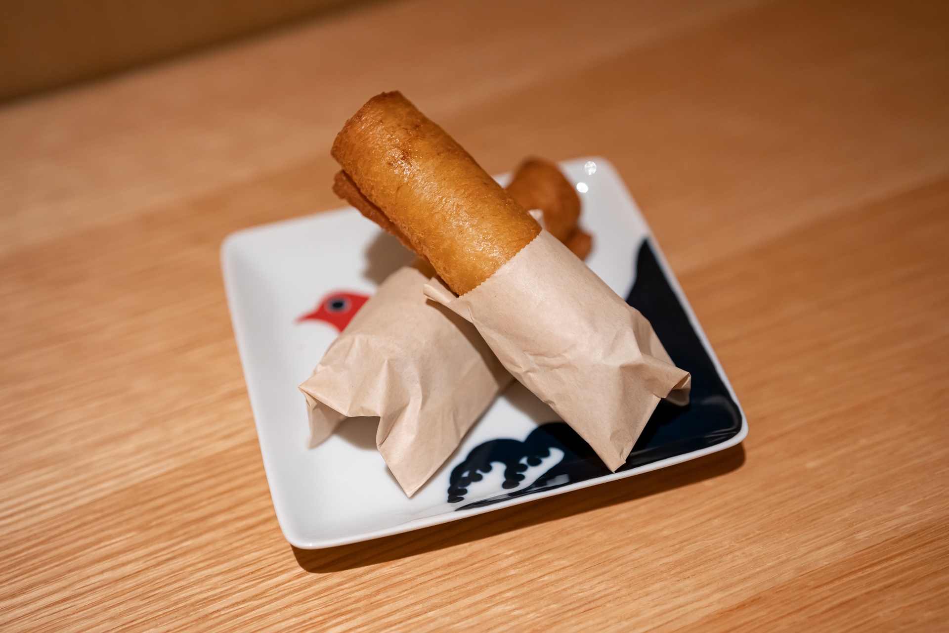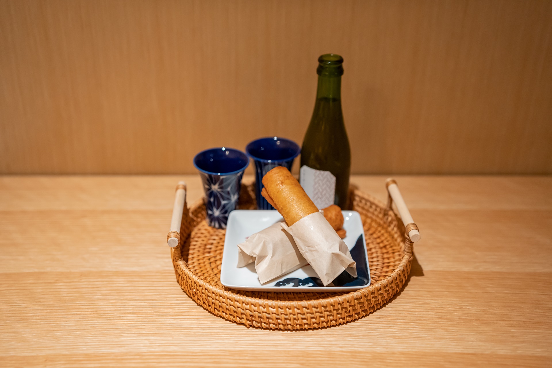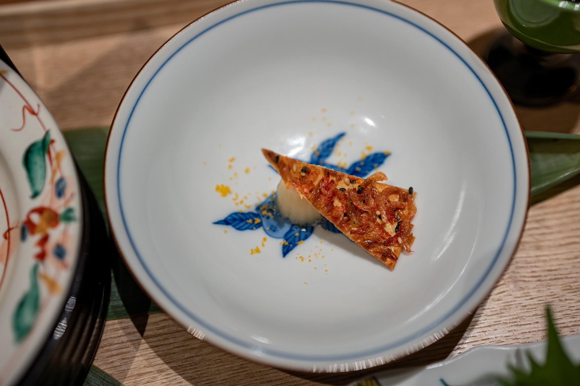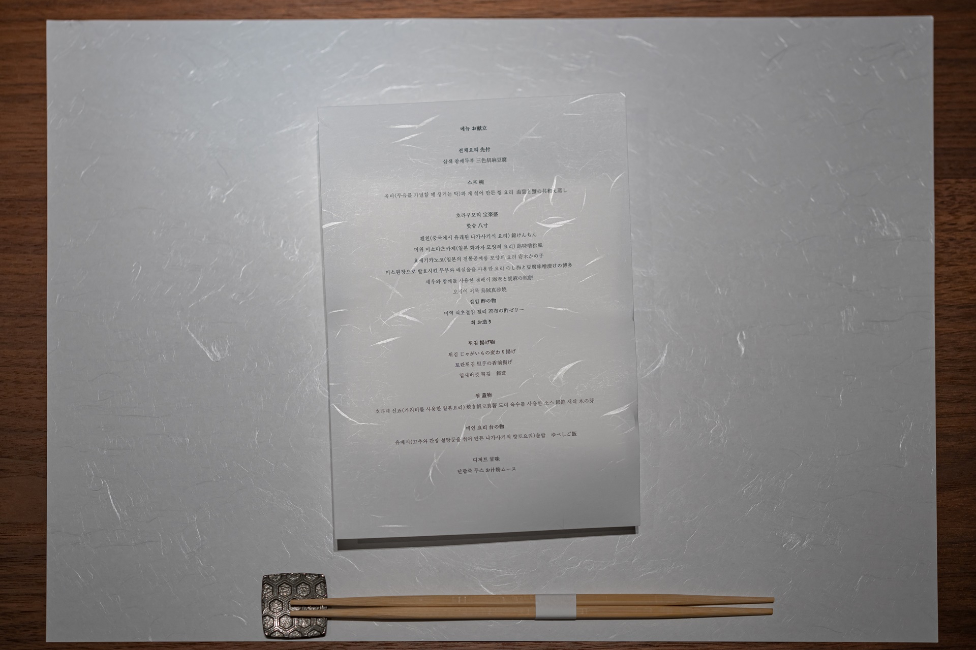 종이 뒤에는 운젠 온천 센베이가 있고 온천 센베이가 반으로 갈라지며 그 뒤에 숨겨져 있던 요리가 나옵니다.