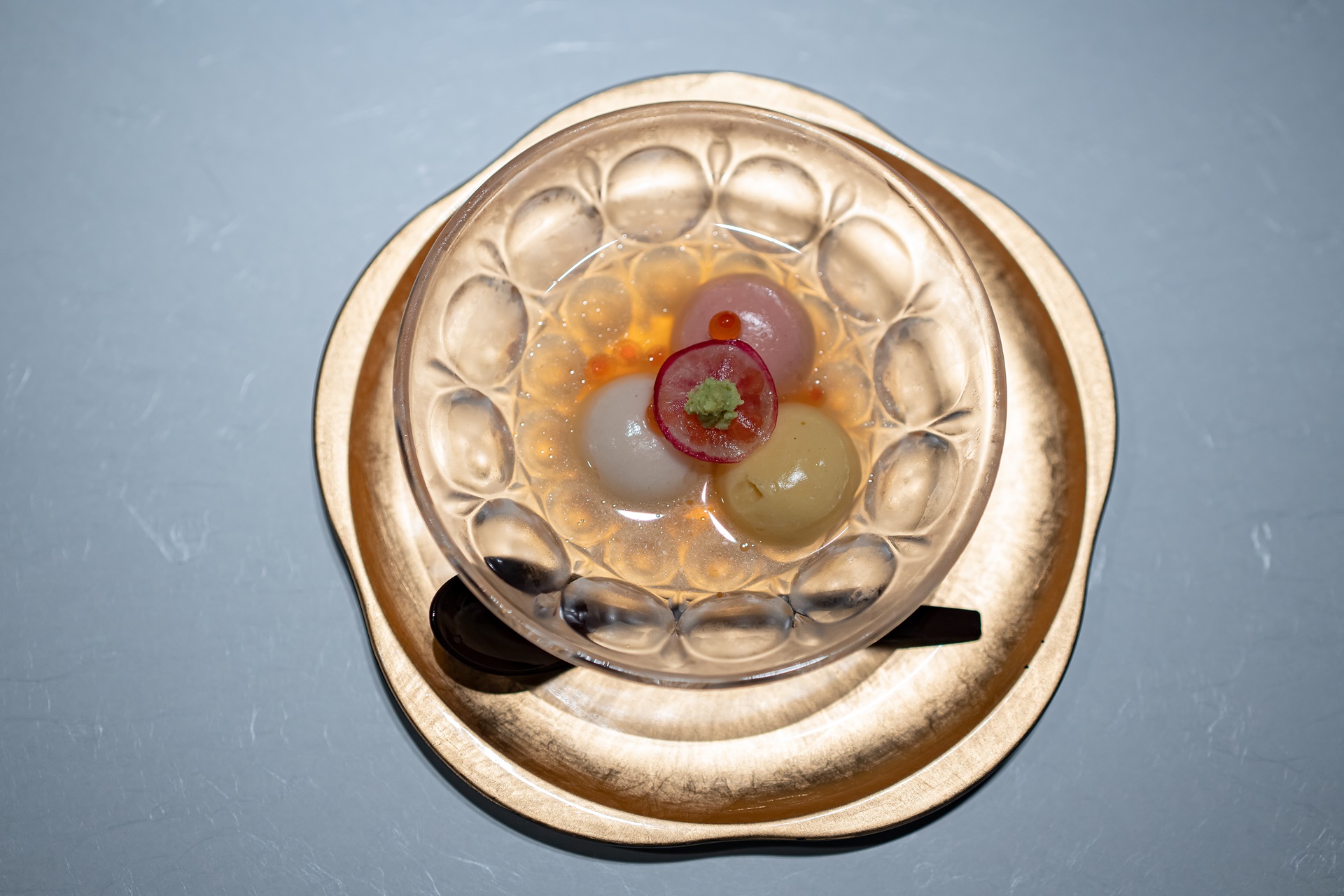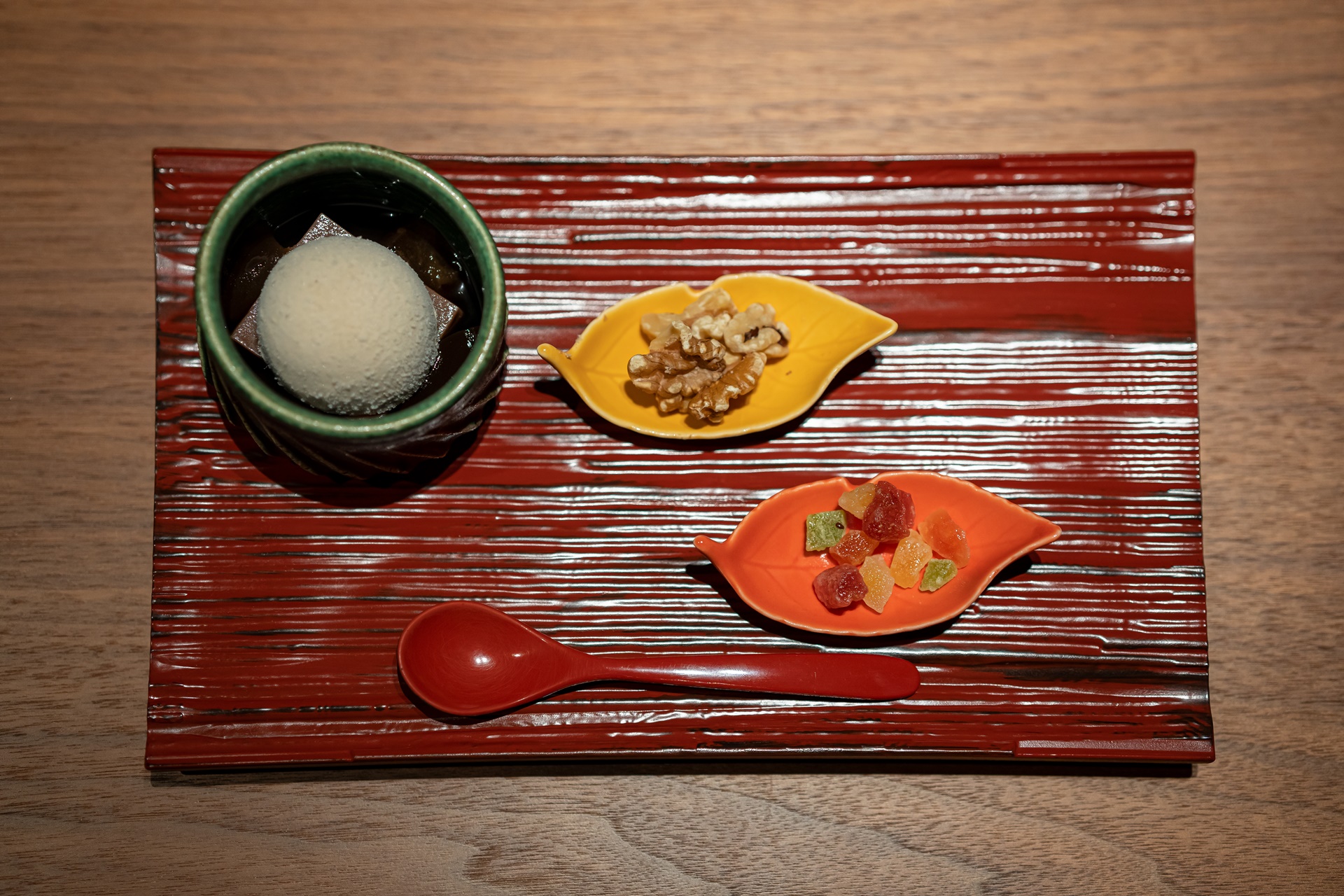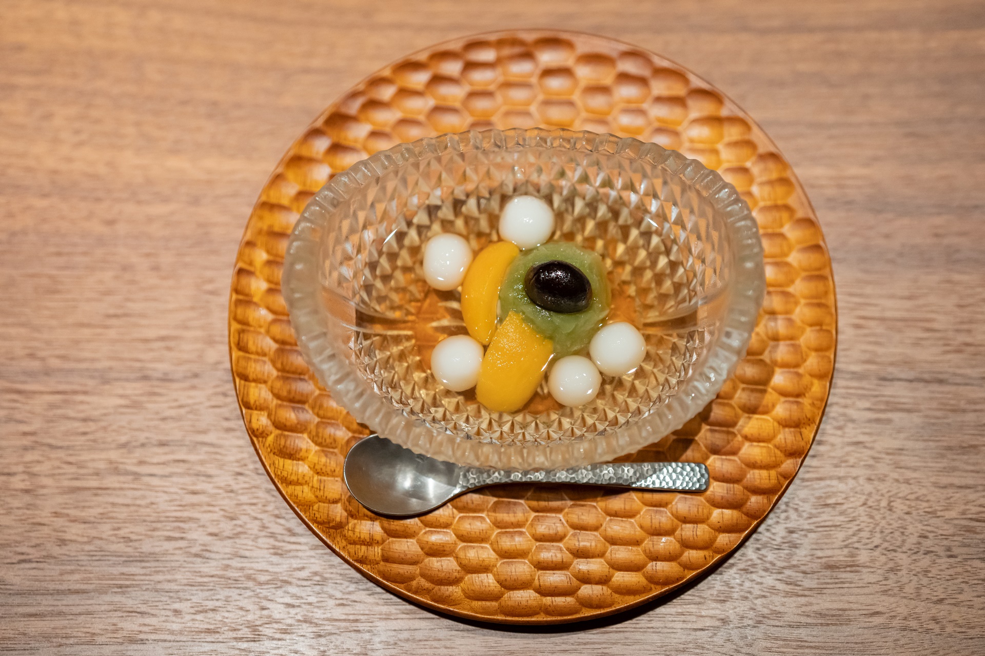 간자라시는 시원한 흑당 물에 단고(떡)과 과일을 넣어 먹는 나가사키의 요리로 호시노 리조트 카이 운젠의 간자라시에는 나가사키에서 많이 나는 과일 비파도 들어 있었습니다.