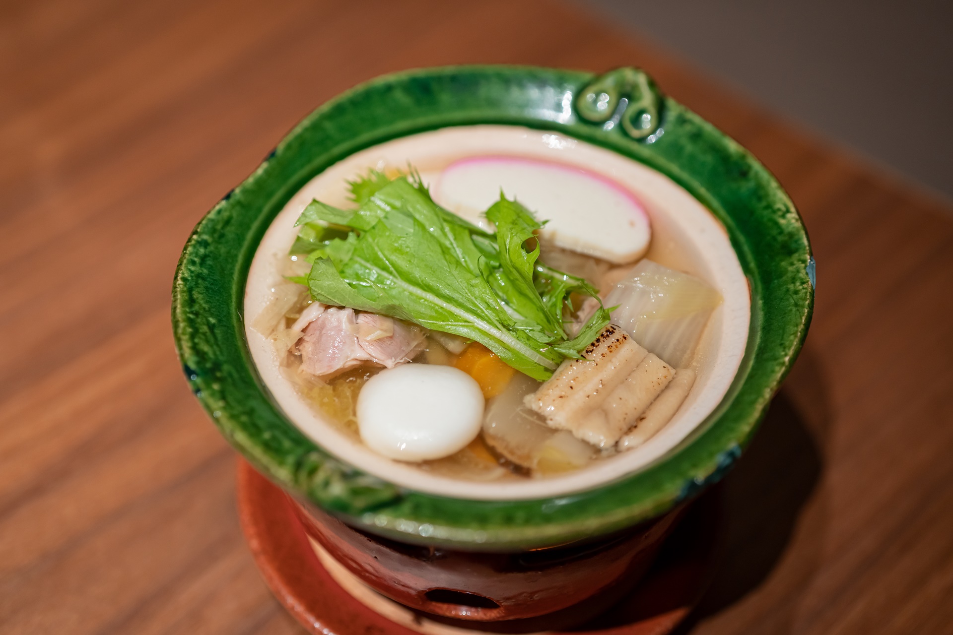 시마바라의 농민들이 먹던 향토요리로 닭고기 육수에 아나고 야채, 떡이 들어가며 푹 퍼진 떡국 같은 느낌입니다.