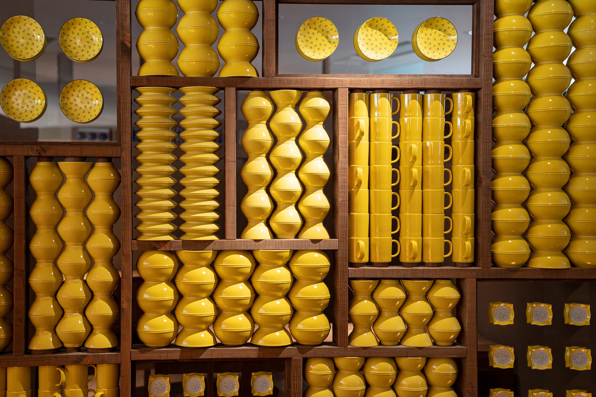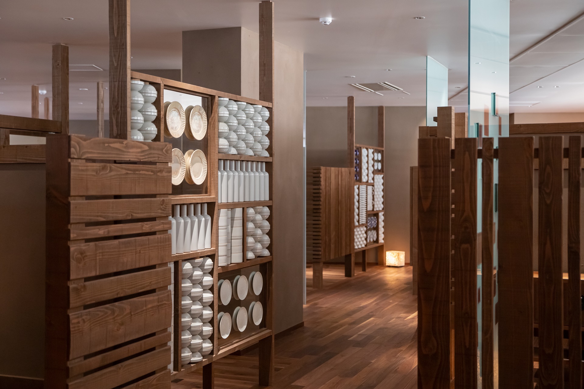 호시노 리조트 카이 운젠의 식사는 다양한 색의 나가사키 도자기로 꾸며둔 1층의 식당에서 먹습니다.