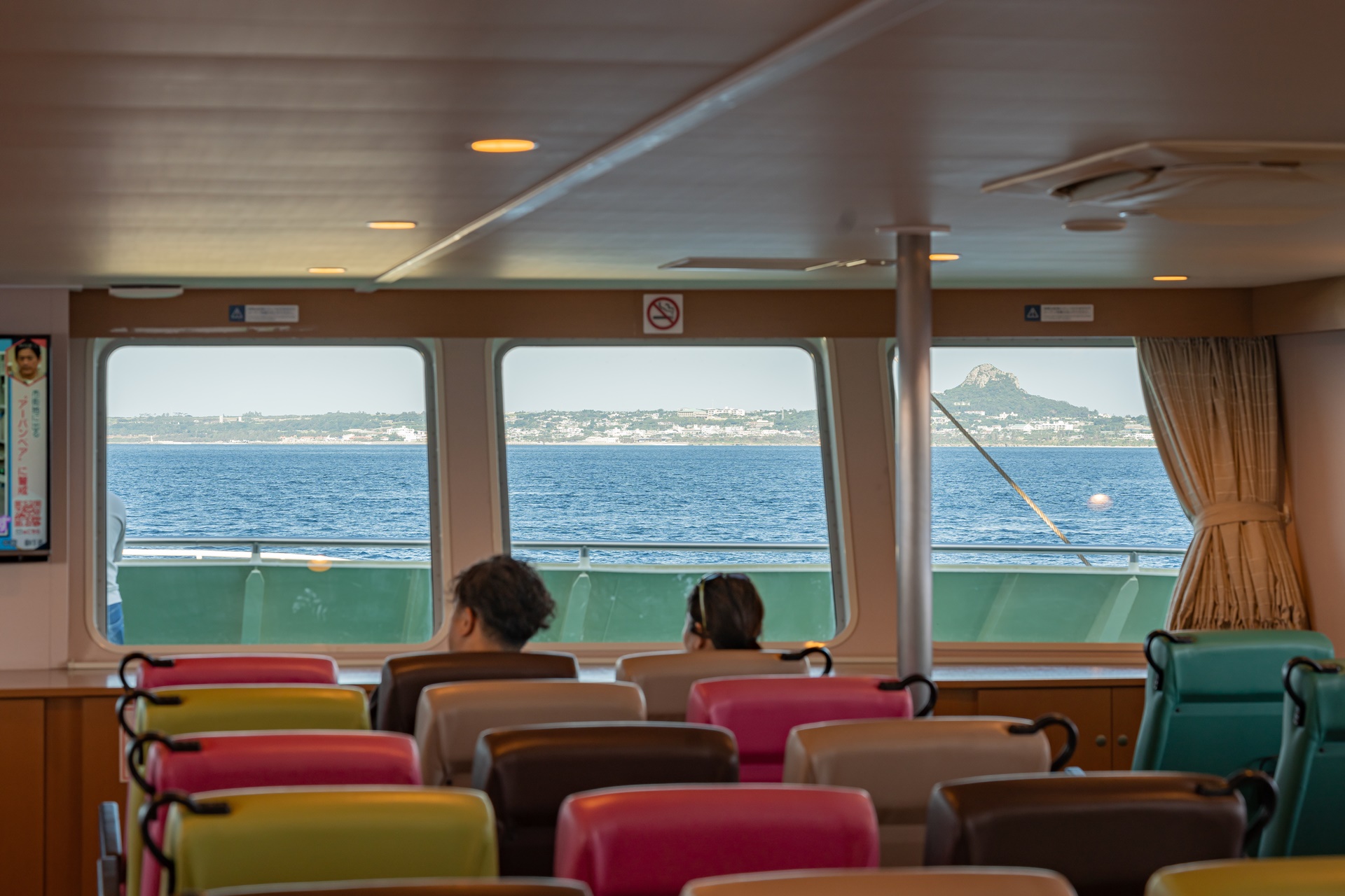 페리는 출발하여 세소코섬과 세소코 대교를 지나 이에섬으로 향합니다.