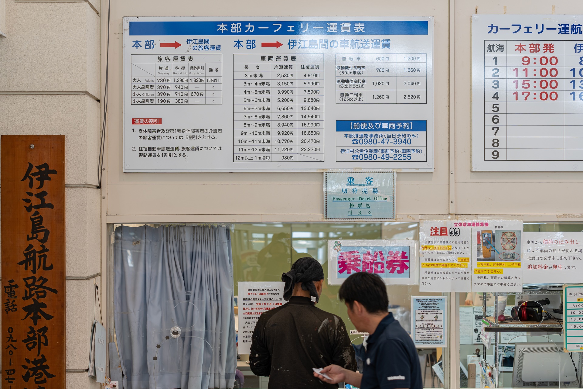 이에지마항에 페리가 한 대 더 정박하고 있으며 성수기(봄~가을) 사이에는 운항횟수가 늘어 두대가 왕복으로 다니고 있는 것 같습니다. 전 가을에서 겨울로 넘어가는 비수기에 찾아갔으며 이 기간에는 하루 4회 왕복 운항을 하고 있었습니다.