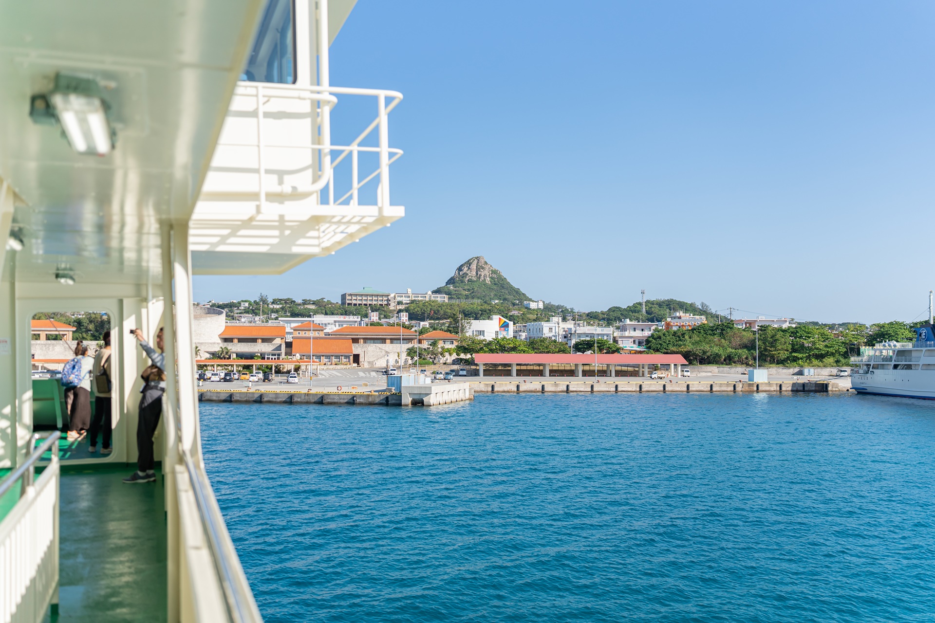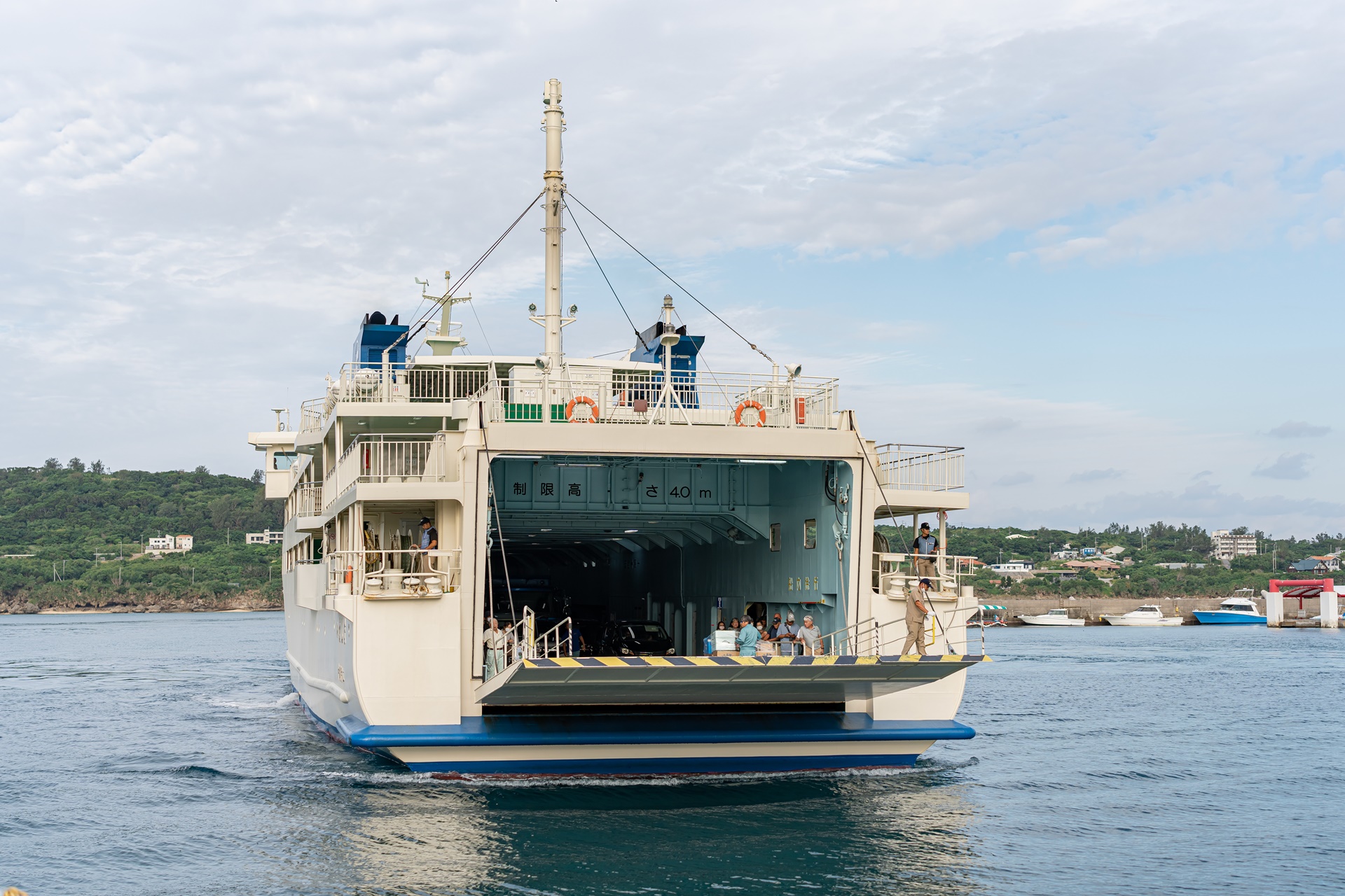이에섬 페리가 모토부 항구에 도착하였습니다.