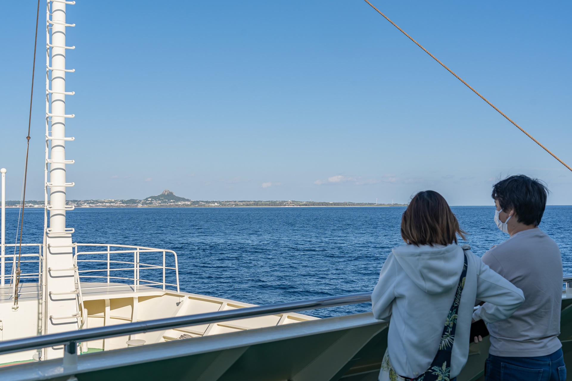 페리는 출발하여 세소코섬과 세소코 대교를 지나 이에섬으로 향합니다.