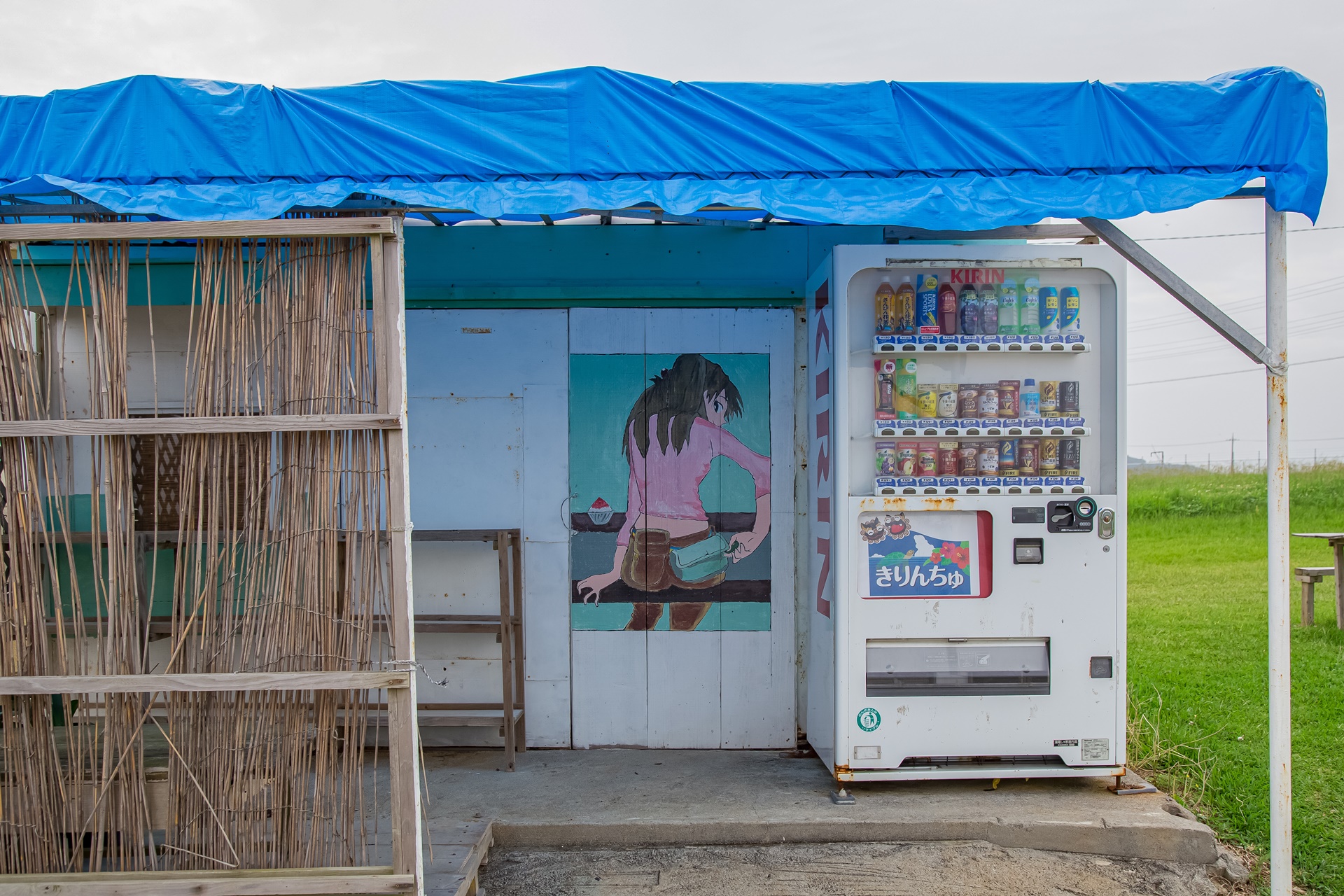 전망대 주차장 옆에는 작은 상점이 있는데 이곳의 주인이 지브리 애니메이션을 좋아하는 것 같습니다. 이에 섬을 찾을 때 마다 이곳의 벽 한 편에는 지브리 애니메이션의 그림이 그려져 있었고 종종 바뀌며 그림도 아주 잘그려져 있었습니다. 10년전 쯤에는 지브리 애니메이션 붉은 돼지 그림이 그려져 있었고 지금은 마녀배달부 키키의 그림이 그려져 있습니다. 마치 와지의 언덕에서 보이는 바다의 풍경이 지브리 애니메이션 속의 한 장면과 같아서 그런 것 같습니다.