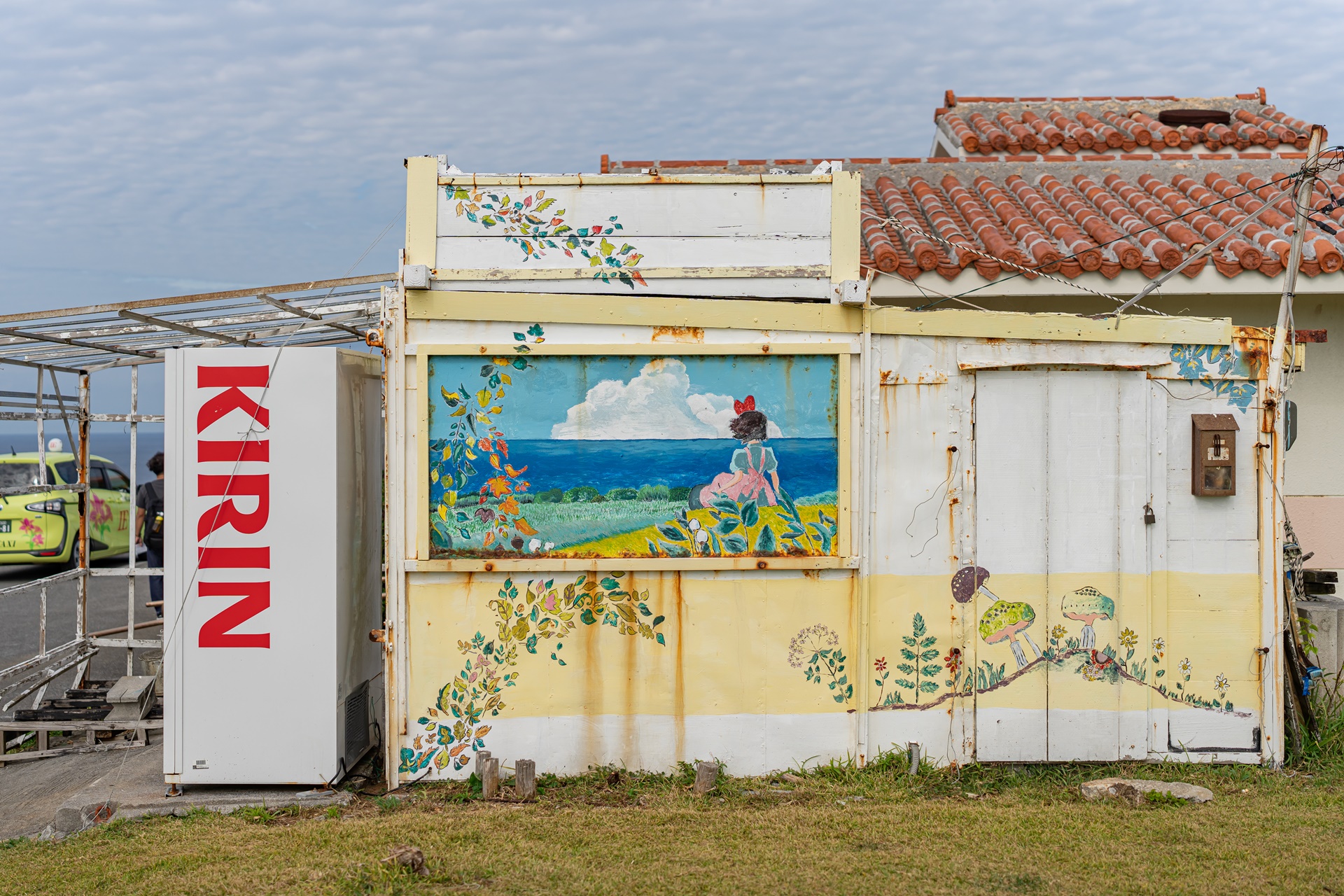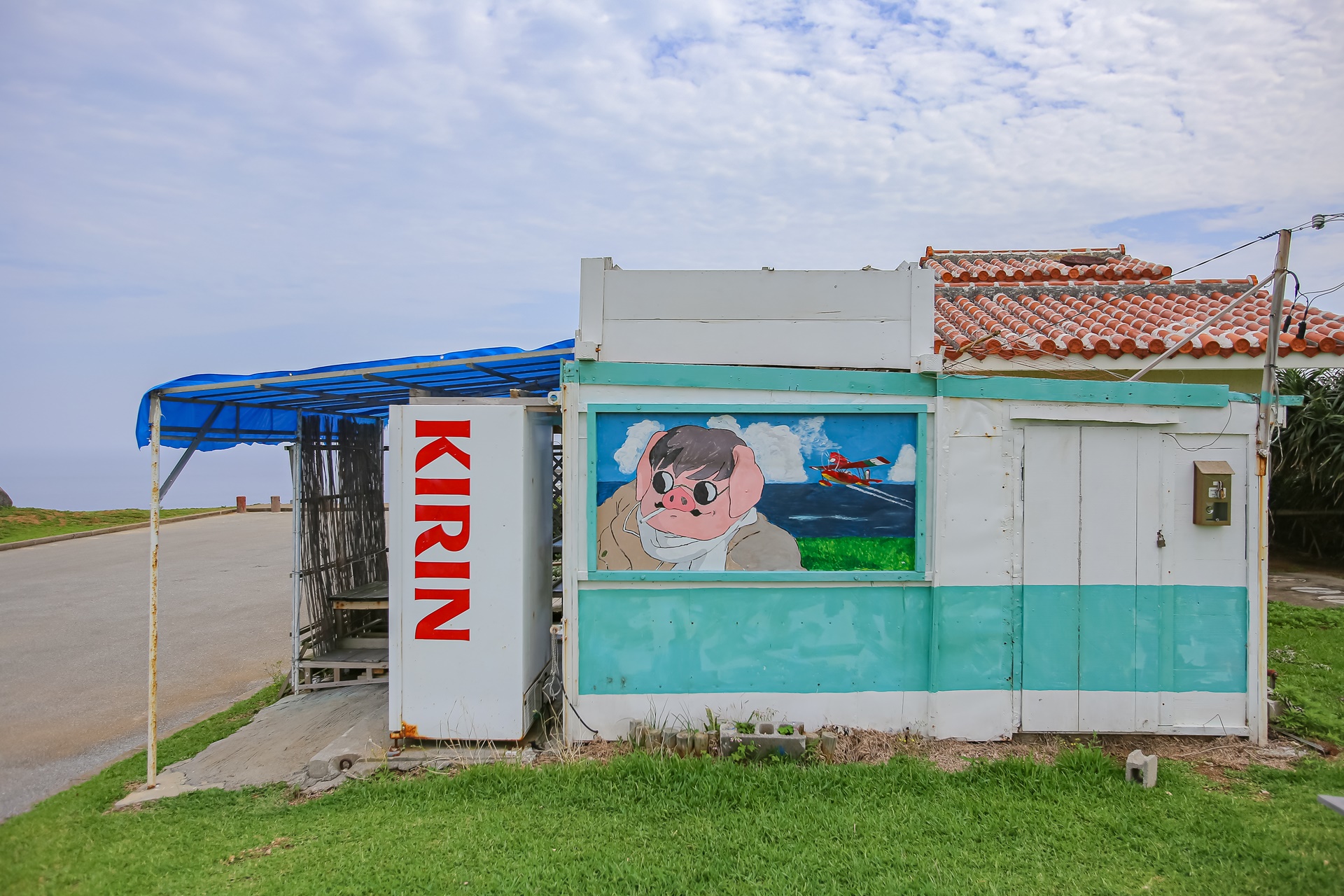 전망대 주차장 옆에는 작은 상점이 있는데 이곳의 주인이 지브리 애니메이션을 좋아하는 것 같습니다. 이에 섬을 찾을 때 마다 이곳의 벽 한 편에는 지브리 애니메이션의 그림이 그려져 있었고 종종 바뀌며 그림도 아주 잘그려져 있었습니다. 10년전 쯤에는 지브리 애니메이션 붉은 돼지 그림이 그려져 있었고 지금은 마녀배달부 키키의 그림이 그려져 있습니다. 마치 와지의 언덕에서 보이는 바다의 풍경이 지브리 애니메이션 속의 한 장면과 같아서 그런 것 같습니다.