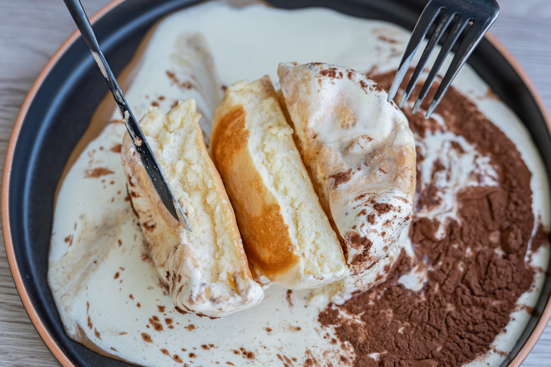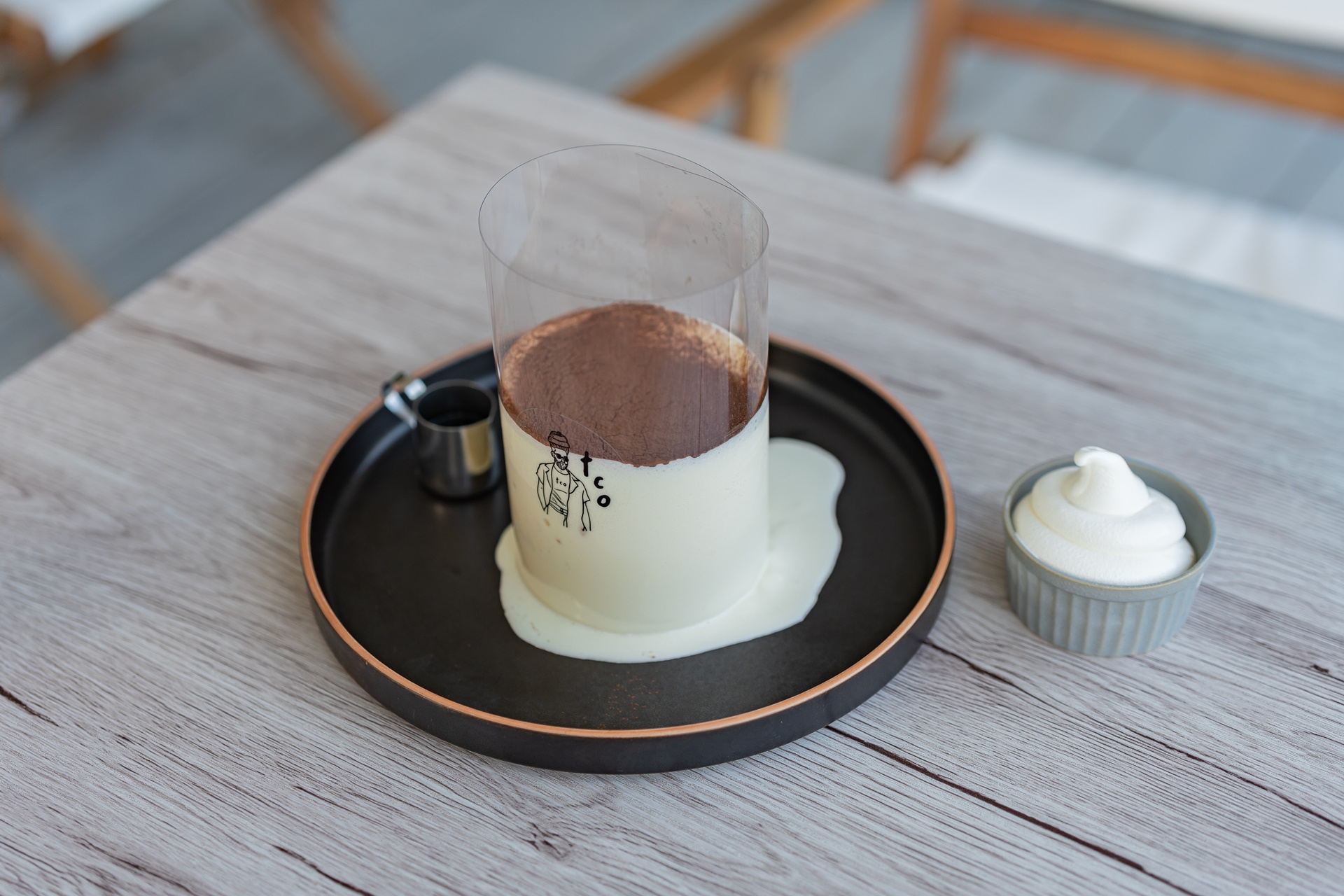 통을 살짝 올려서 티라미스 크림과 함께 펜케이크를 즐깁니다.