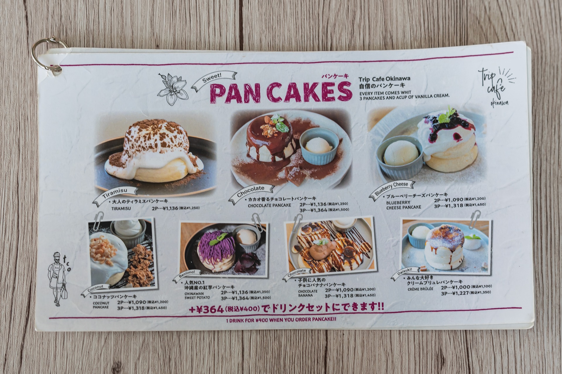 촉촉하고 부드러운 펜케이크, 맛도 좋고 재미도 있는 트립 카페 오키나와의 메뉴입니다.