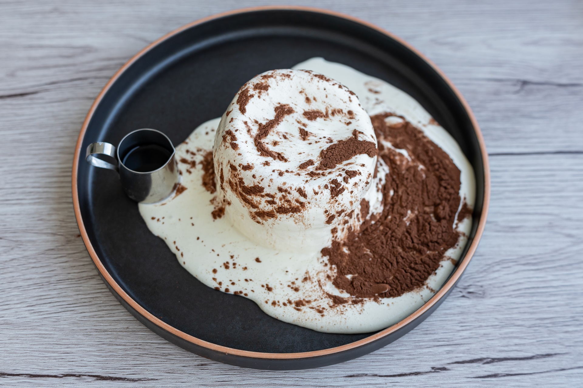 통을 살짝 올려서 티라미스 크림과 함께 펜케이크를 즐깁니다.