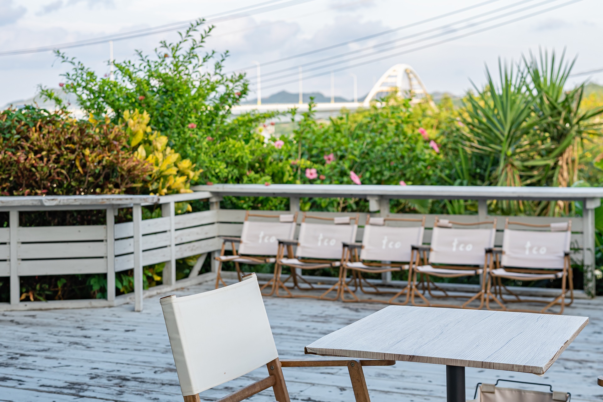 세소코 대교 주변의 풍경을 감상할 수 있는 트립 카페 오키나와 세소코의 야외 자리