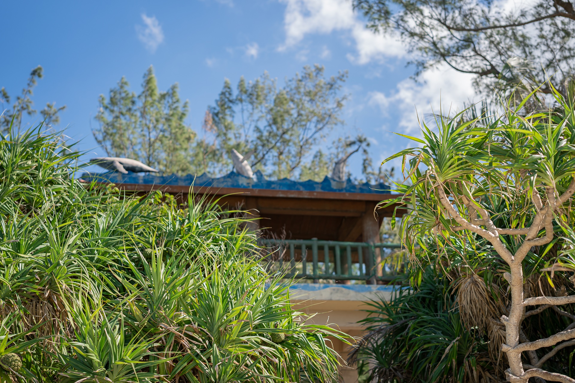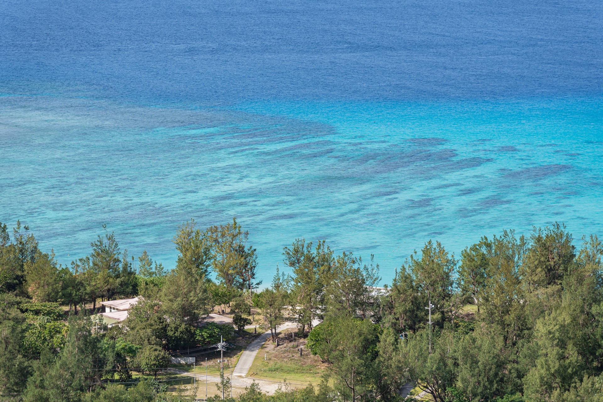울타리 너머로 오키나와의 푸른 바다가 보이기 시작합니다.