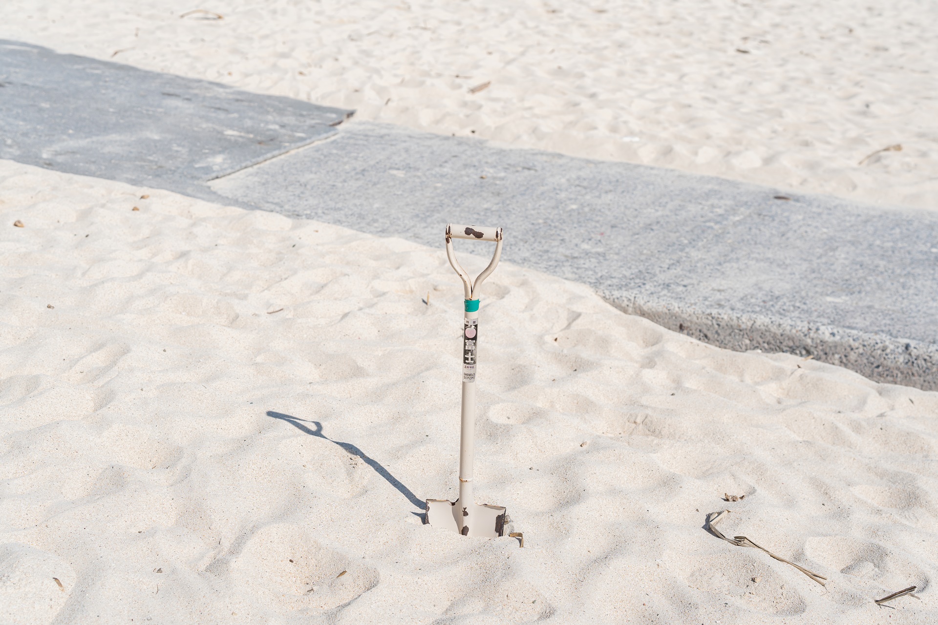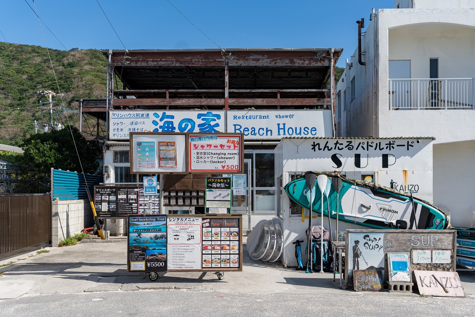 해변 입구에는 다양한 마린 스포츠 숍과 상점들이 모여 있었습니다.