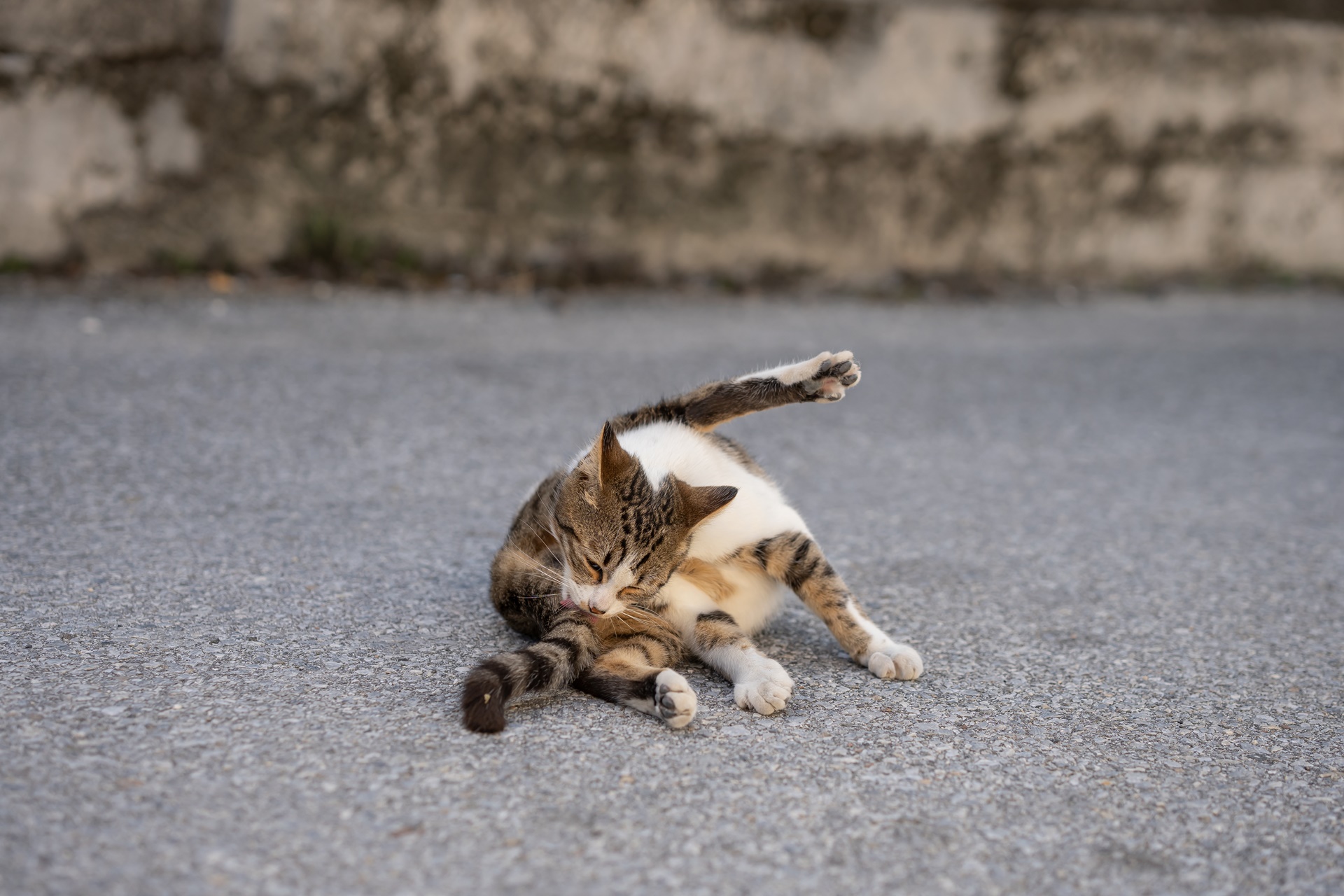 아크로 바탁한 자세로 그루밍을 하고 있는 반 고등어 무늬 고양이