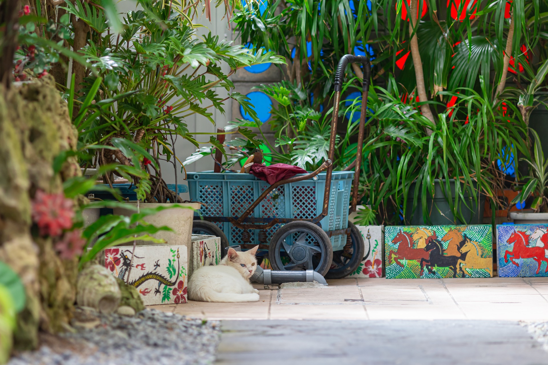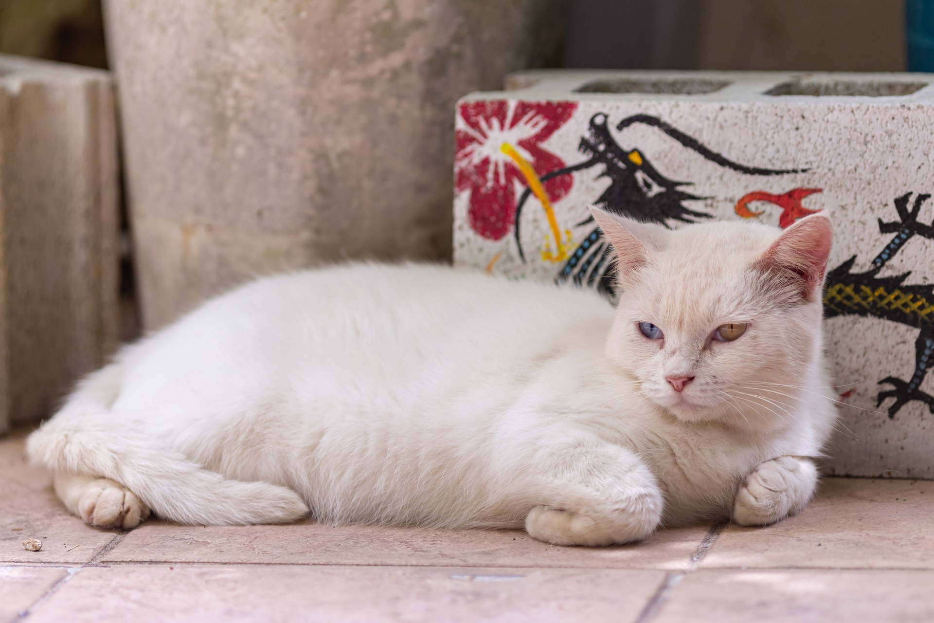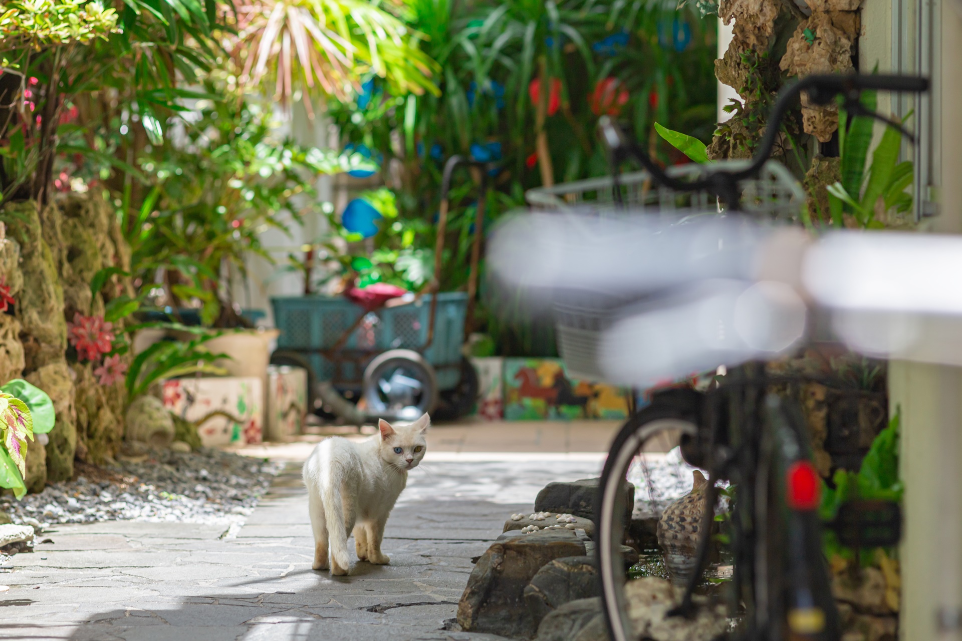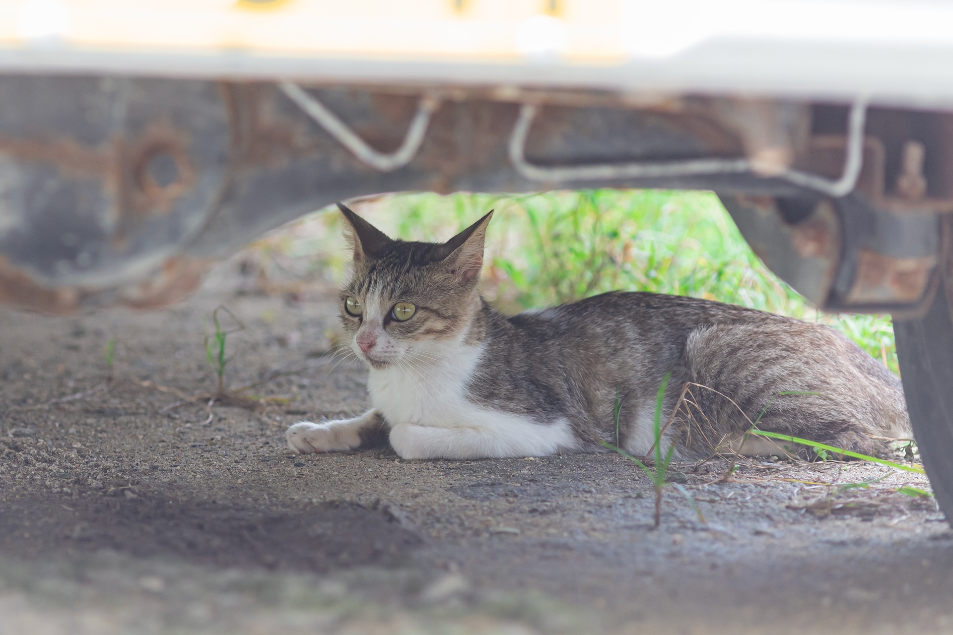 뜨거운 햇살의 오키나와에서는 자동차 아래나 지붕 아래 그늘을 찾아보면 고양이를 만날 수 있는 확률이 높아집니다.