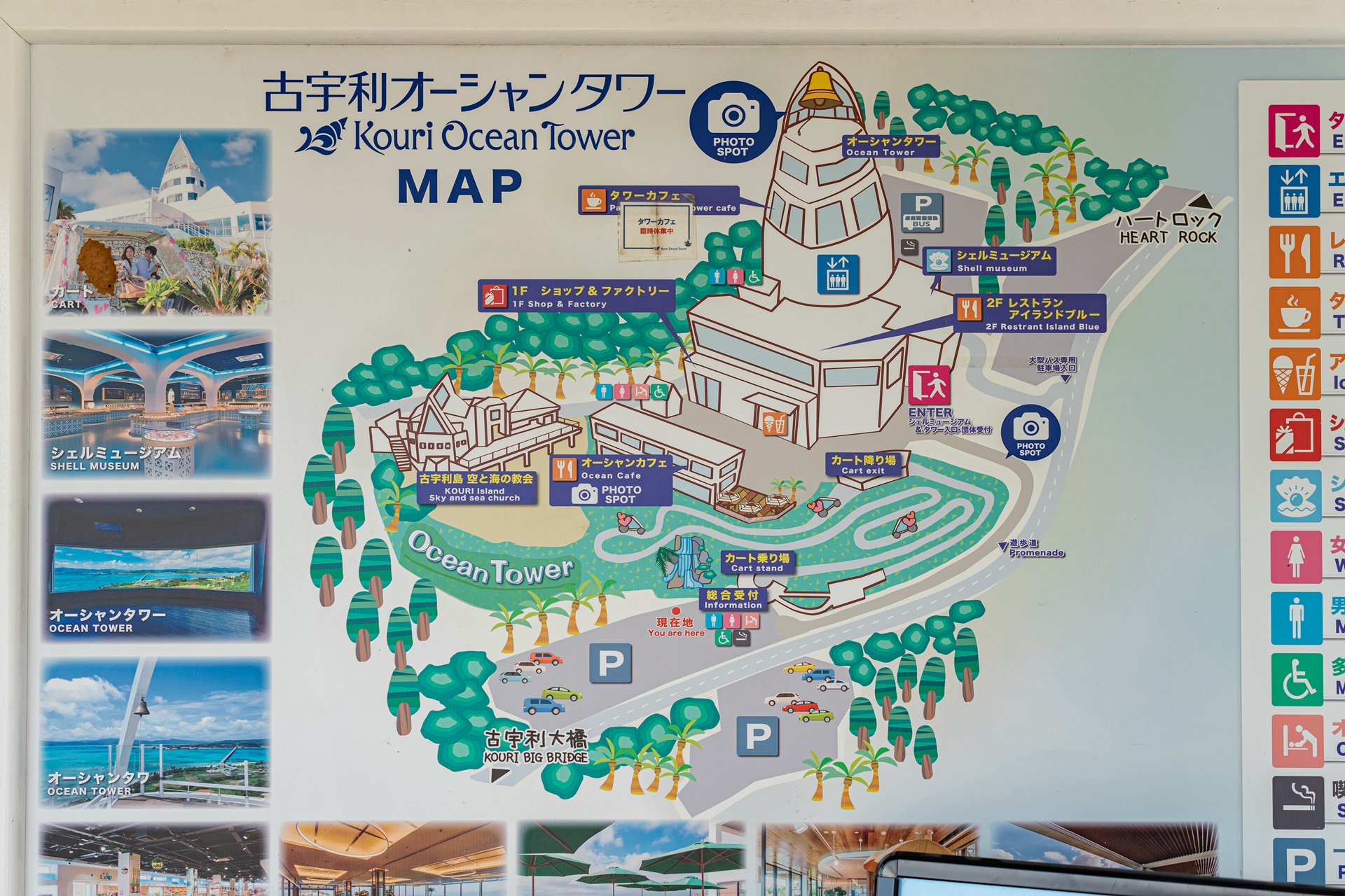 고우리 오션 타워의 주차장은 여러 곳이 있으며 그 중 하나는 고우리지마 주변의 풍경을 멋지게 감상할 수 있습니다.