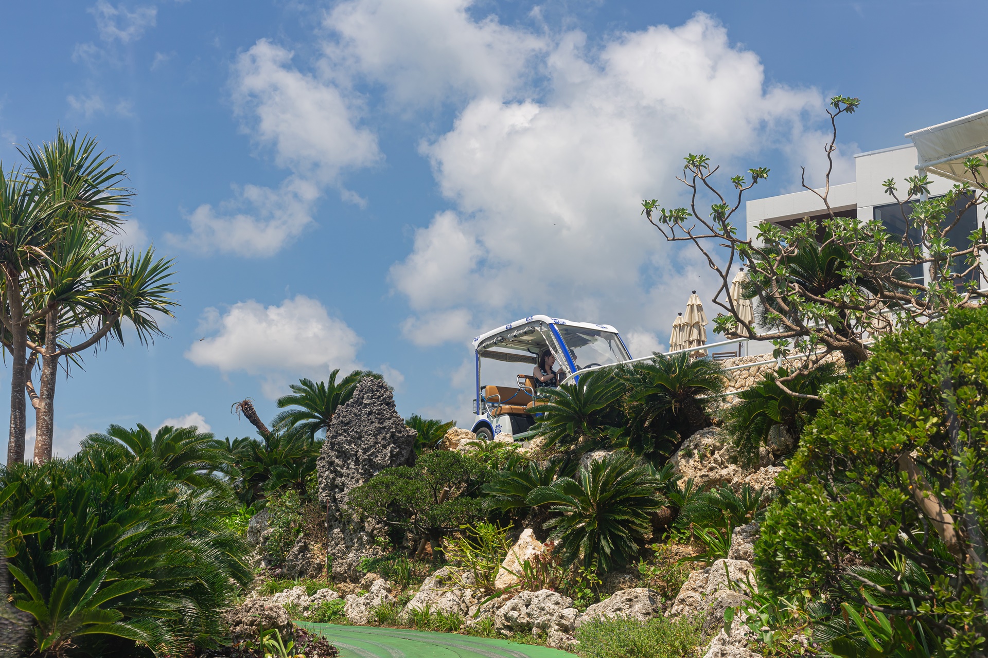 카트를 타고 언덕을 오르며 주변의 풍경이 넓게 펼쳐집니다.