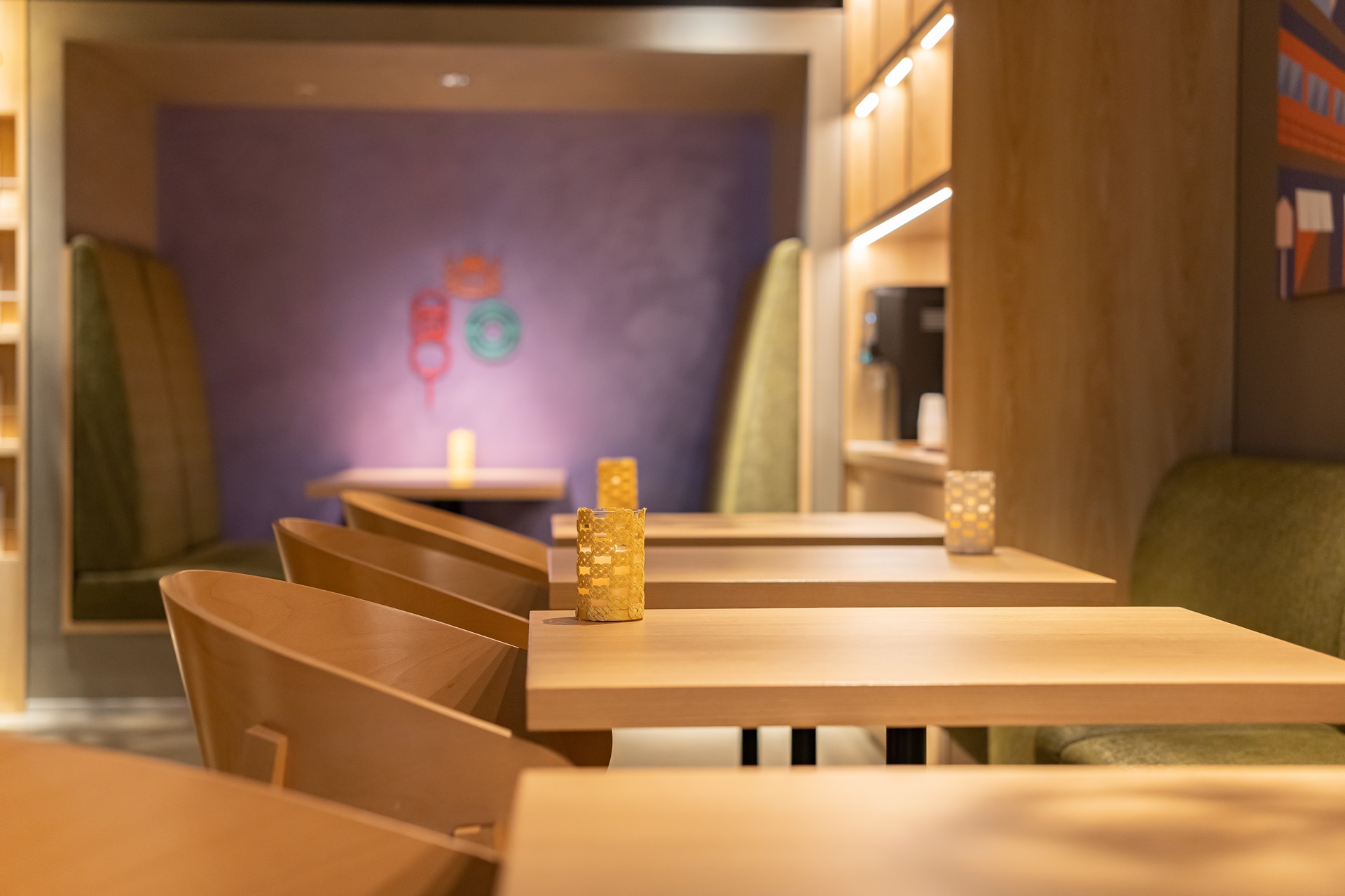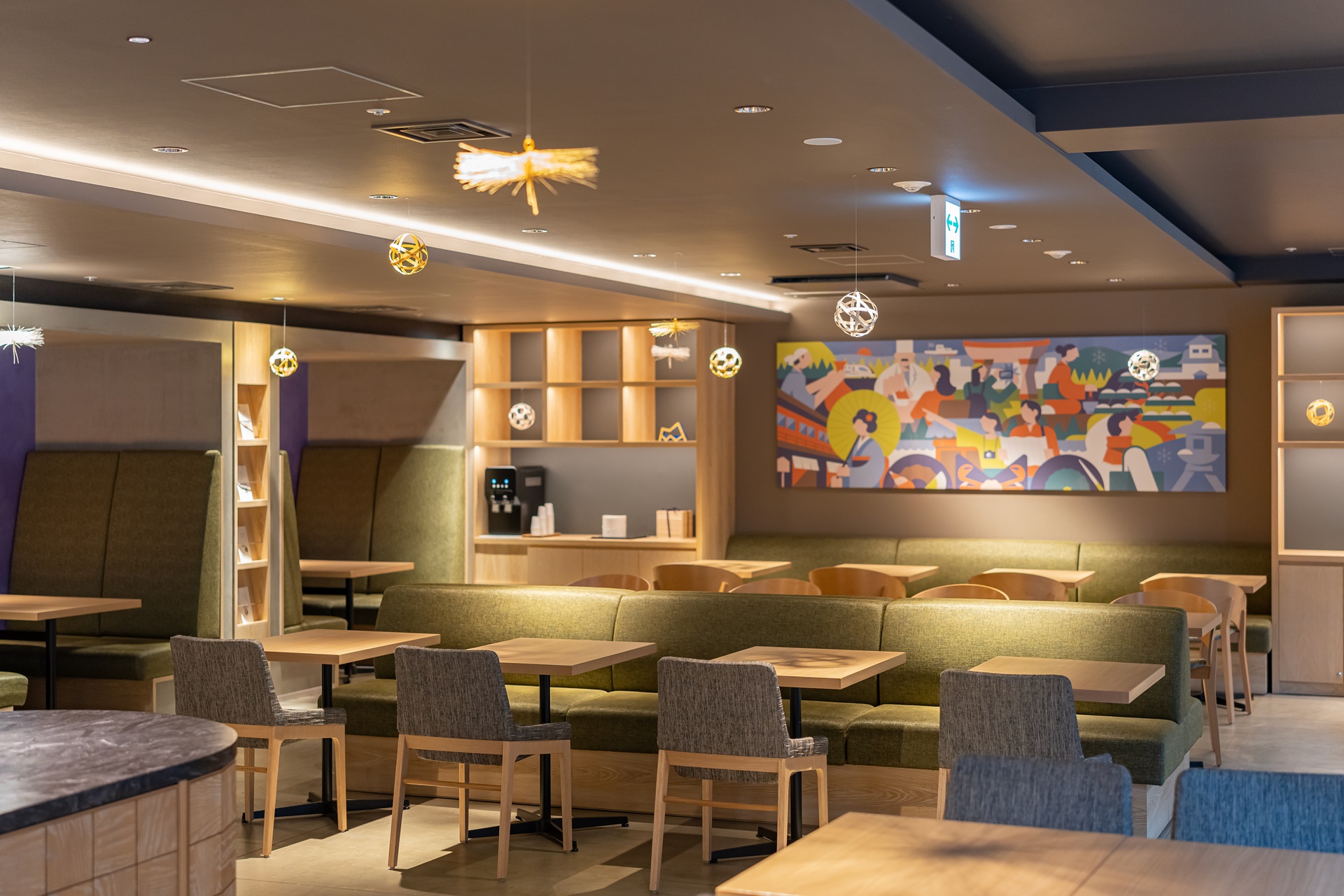 입구를 들어서면 가가 하치만 오키아가리를 본뜬 구타니야키 아트가 맞이 합니다. 로비 공간이 넓으며 한편은 카페 겸 레스토랑으로 이용할 수 있습니다.