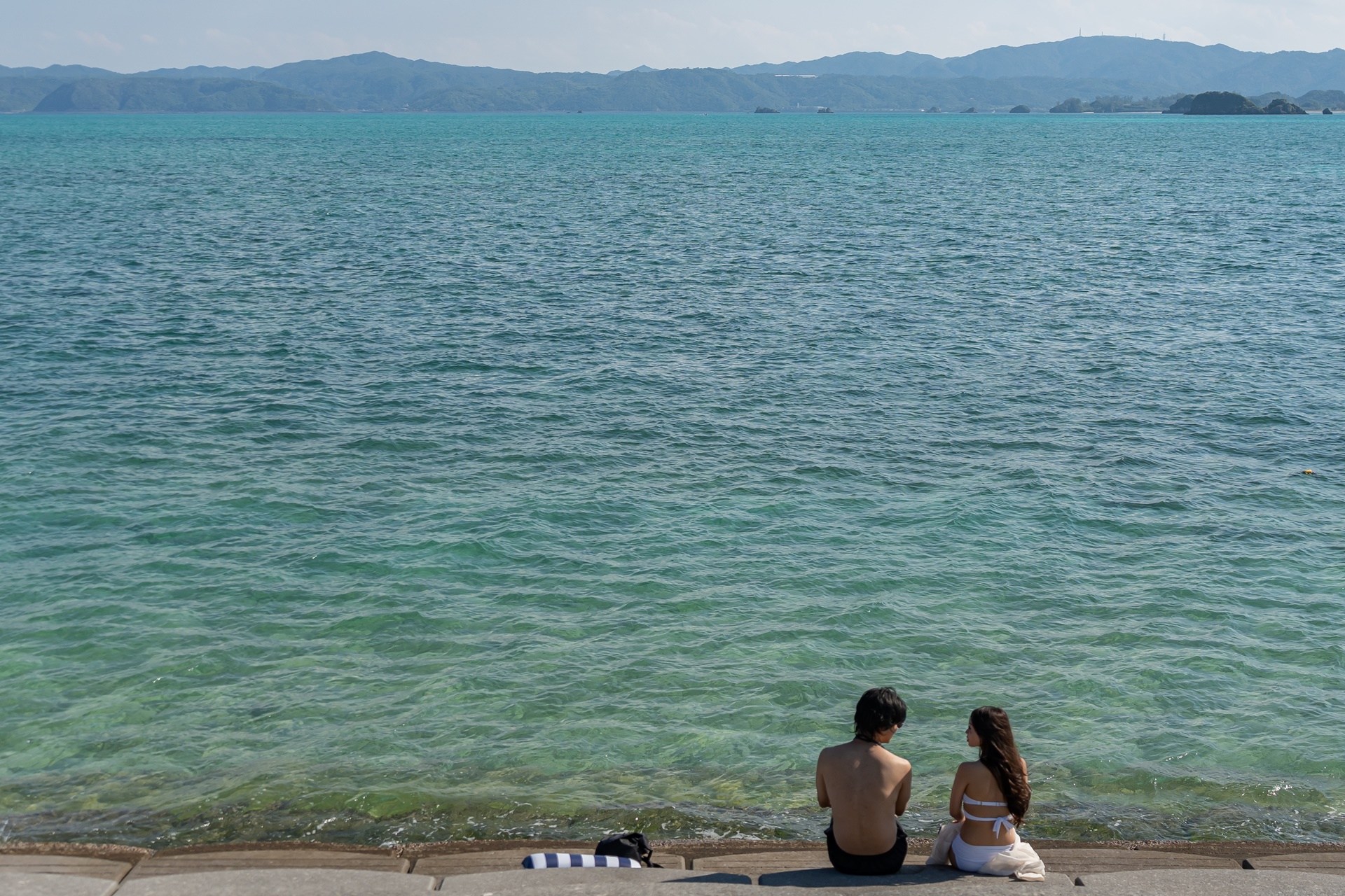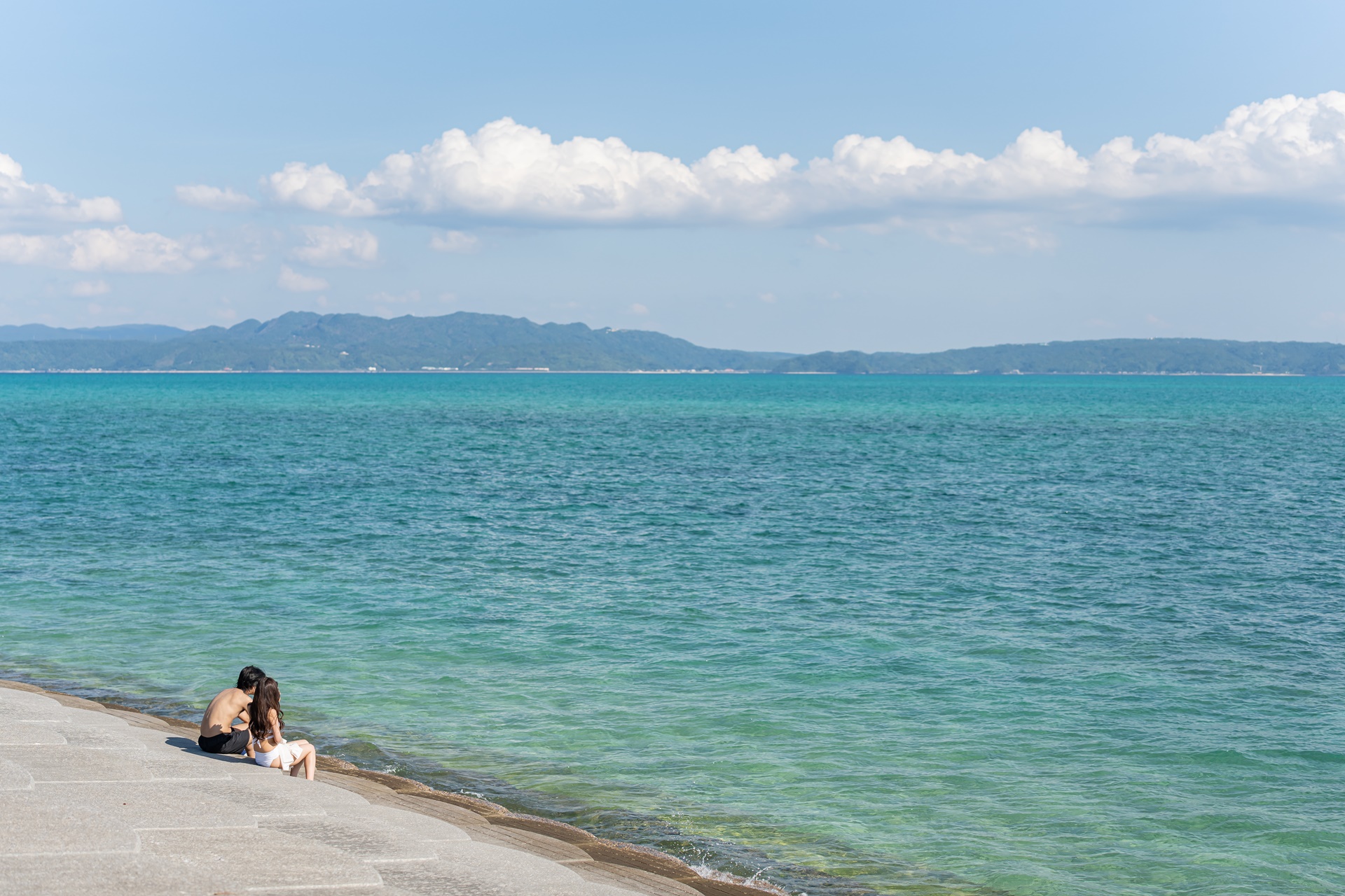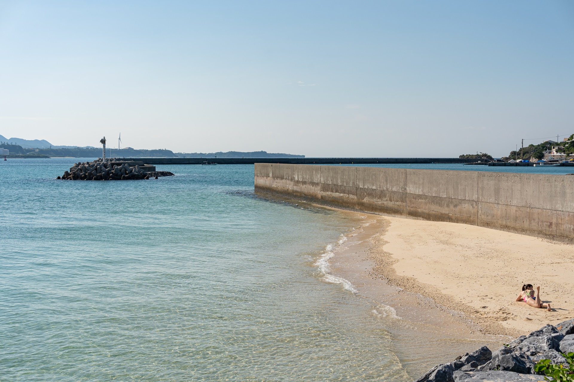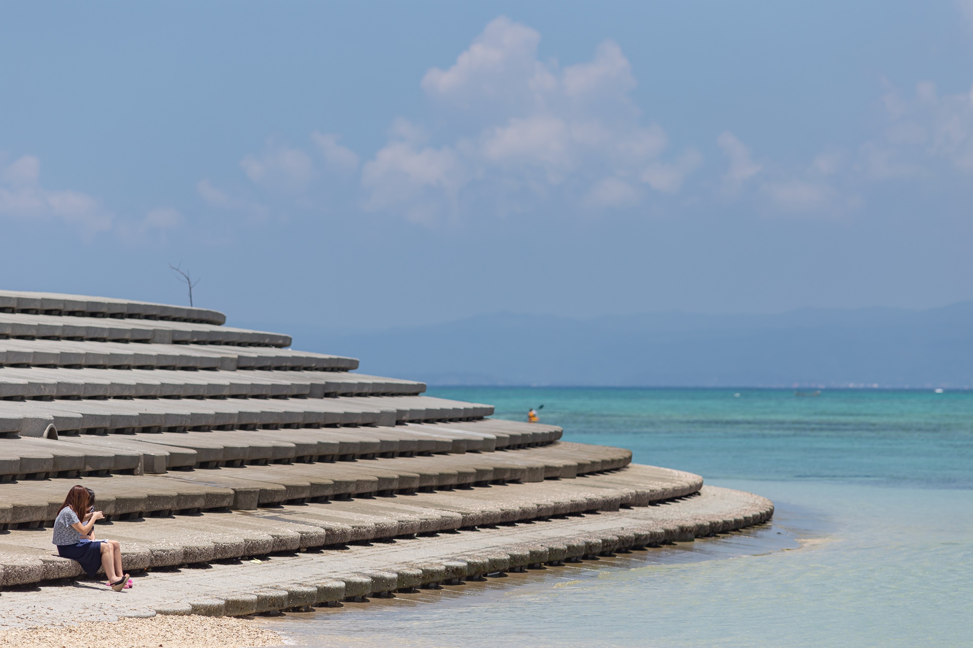 고우리지마 서쪽의 해변은 정비가 되어 있어 앉아서 쉬기에 좋습니다.