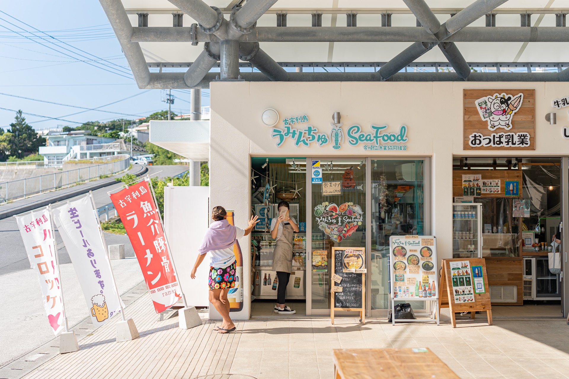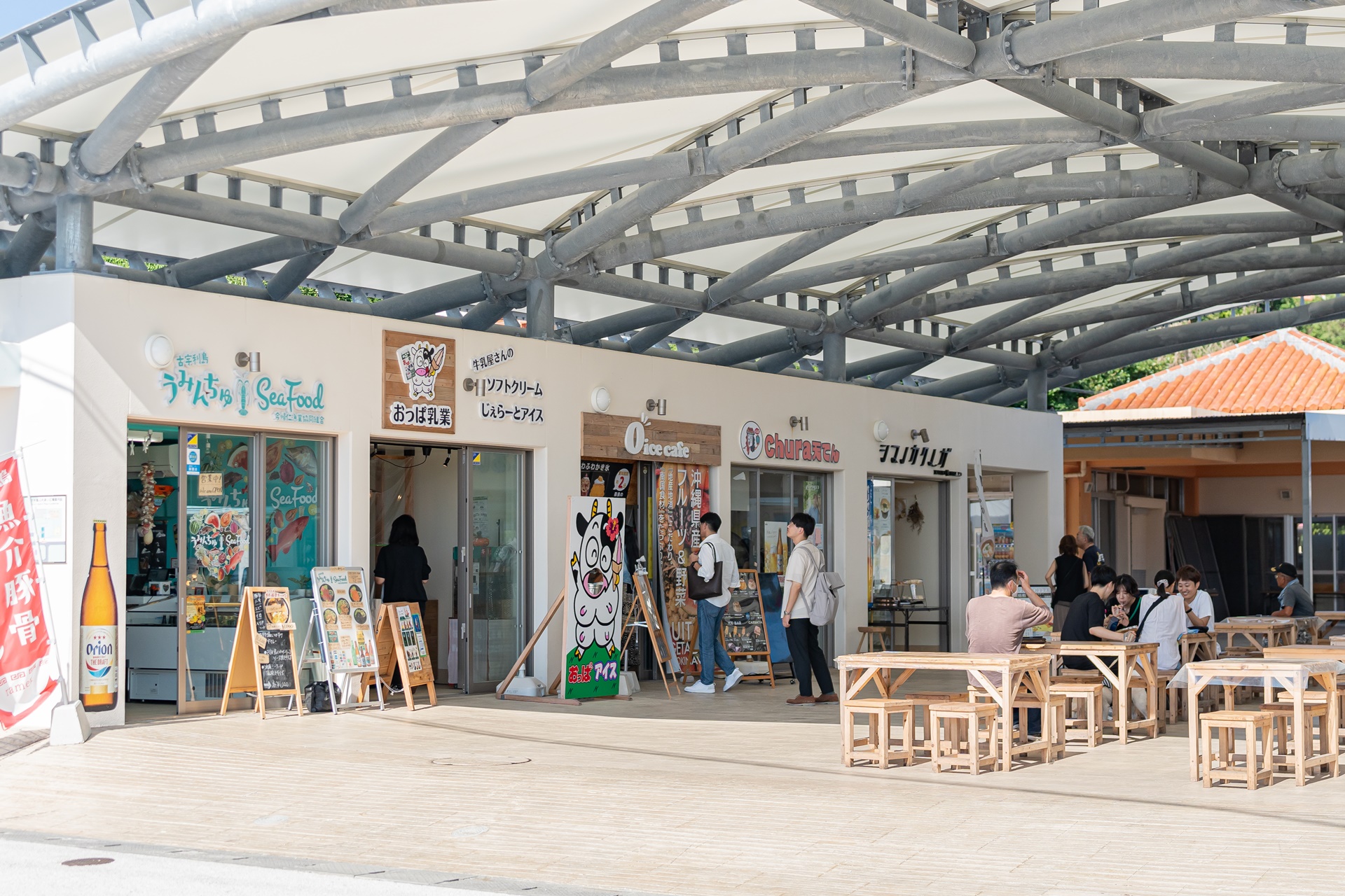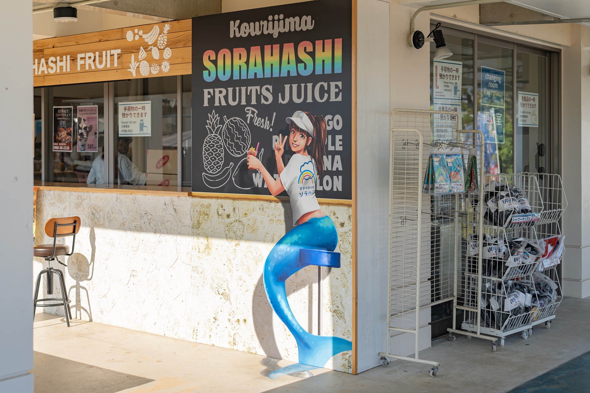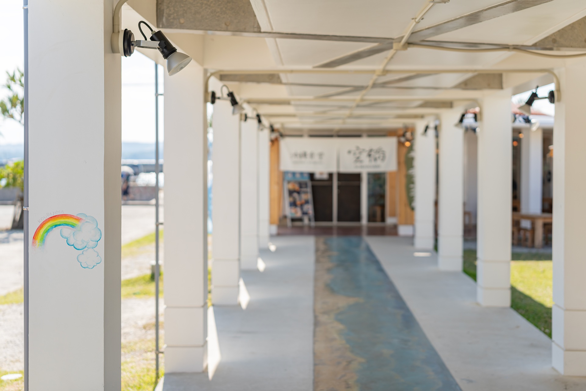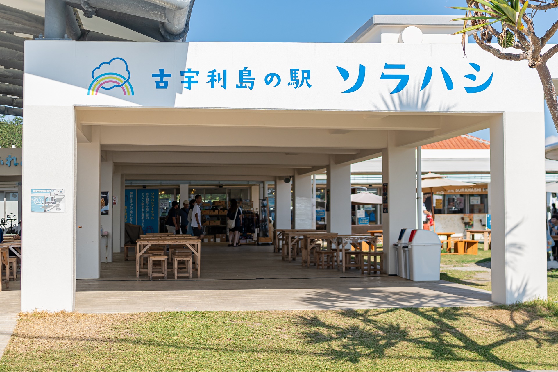 고우리 비치에는 고우리지마의 역 소라하시(ソラハシ) 소라하시는 하늘다리라는 의미로 로고를 보면 무지개와 그림이 그려져 있습니다. 이곳은 미치노에키(道の駅) 라고 불리는 일본의 휴개소로 주차장, 편의시설, 상점등이 모여 있습니다.