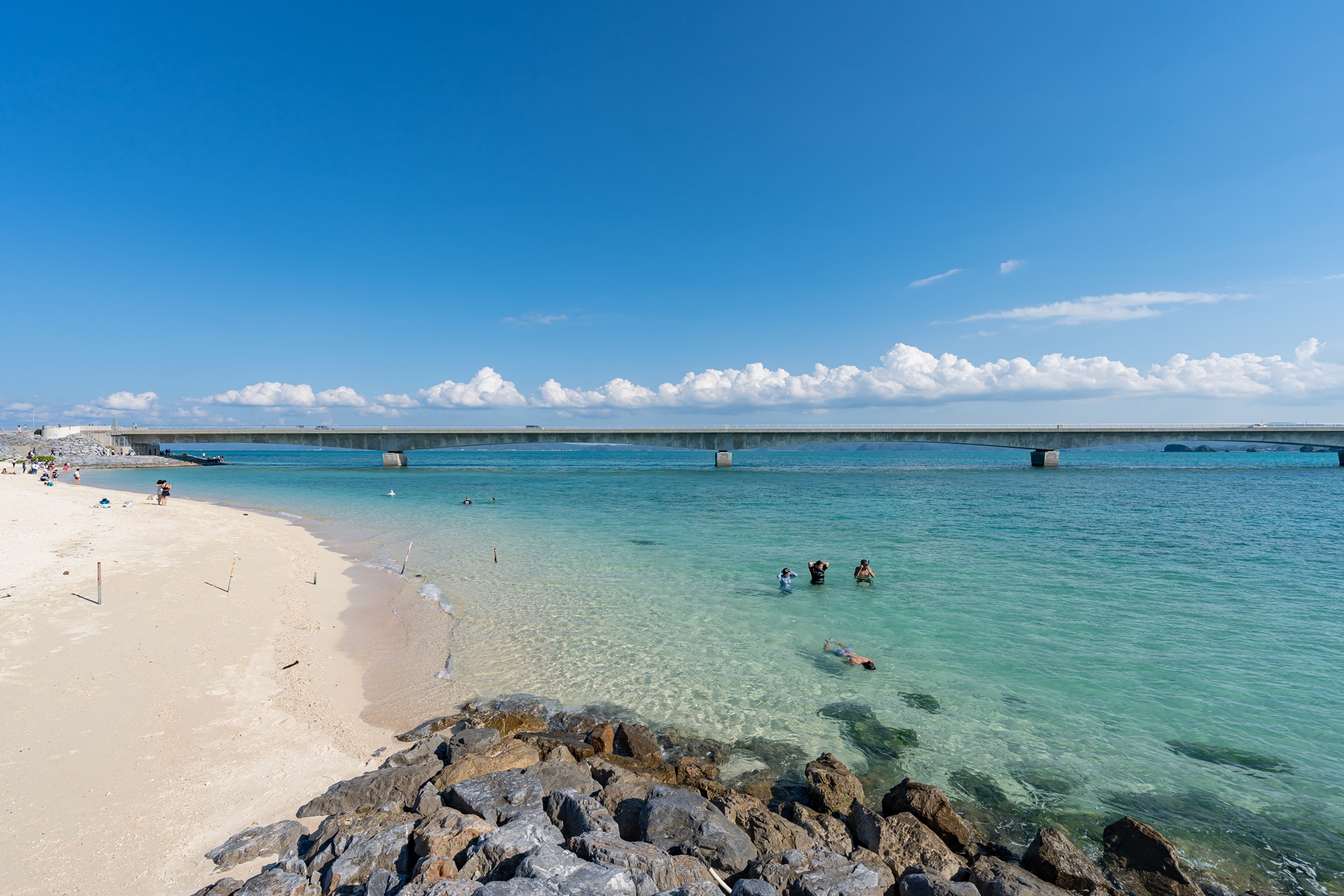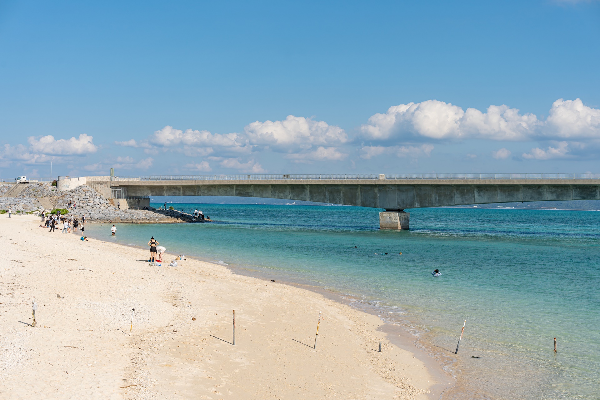 고우리지마 비치, 해변은 다리를 중심으로 좌우로 나뉘며 해변의 분위기가 조금 다릅니다.