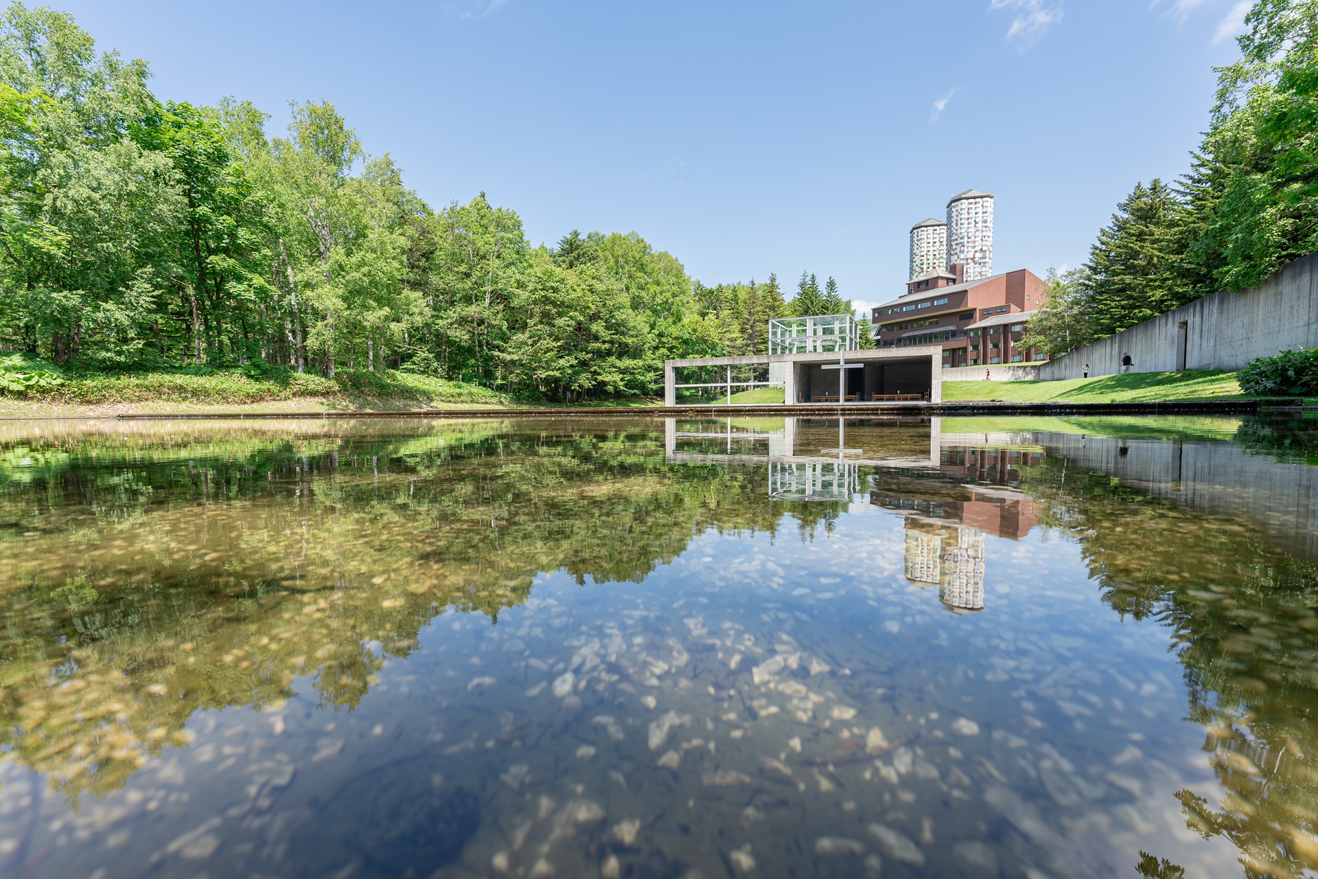 물의 교회 앞의 홋카이도 풍경이 가득 담긴 물위의 반영