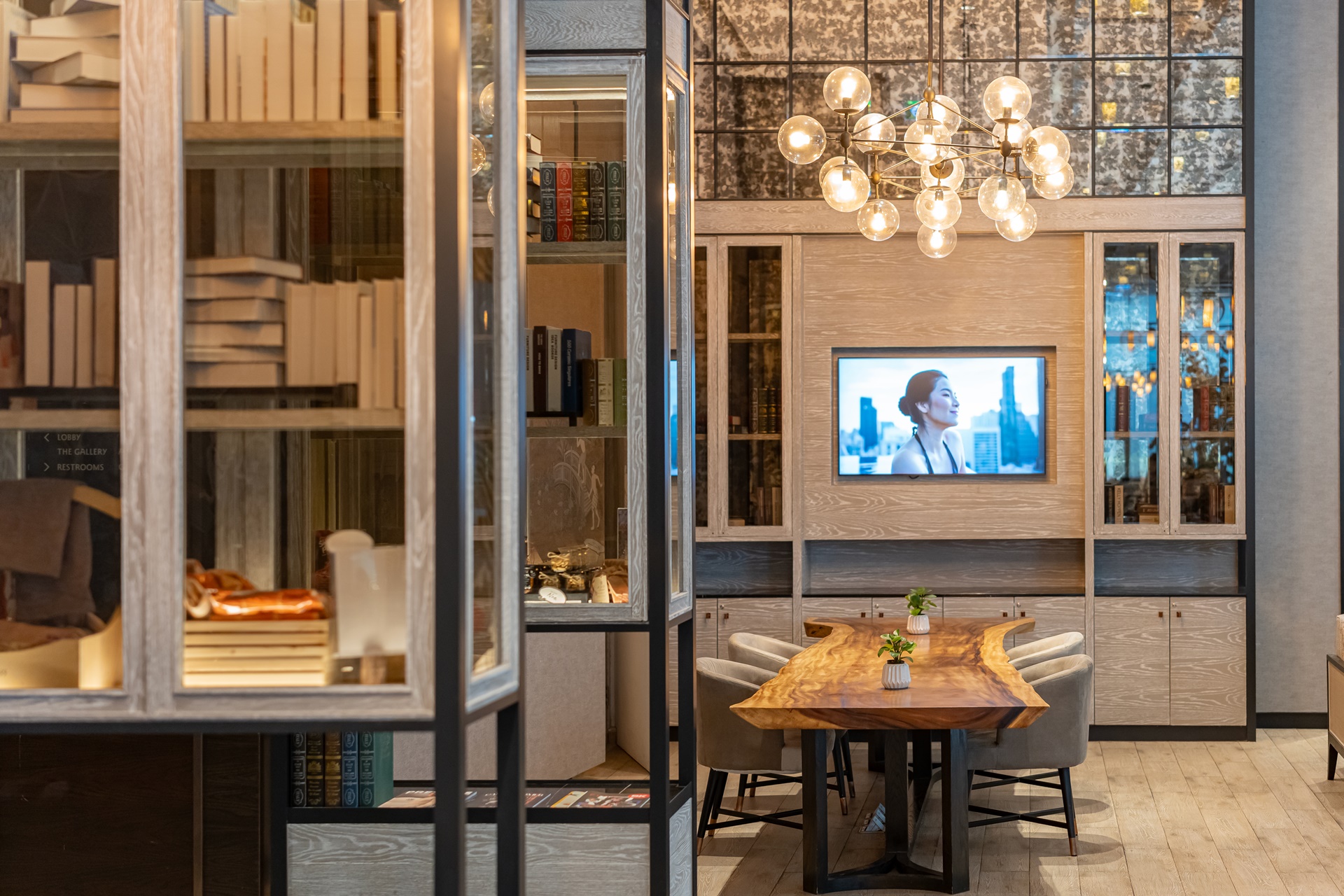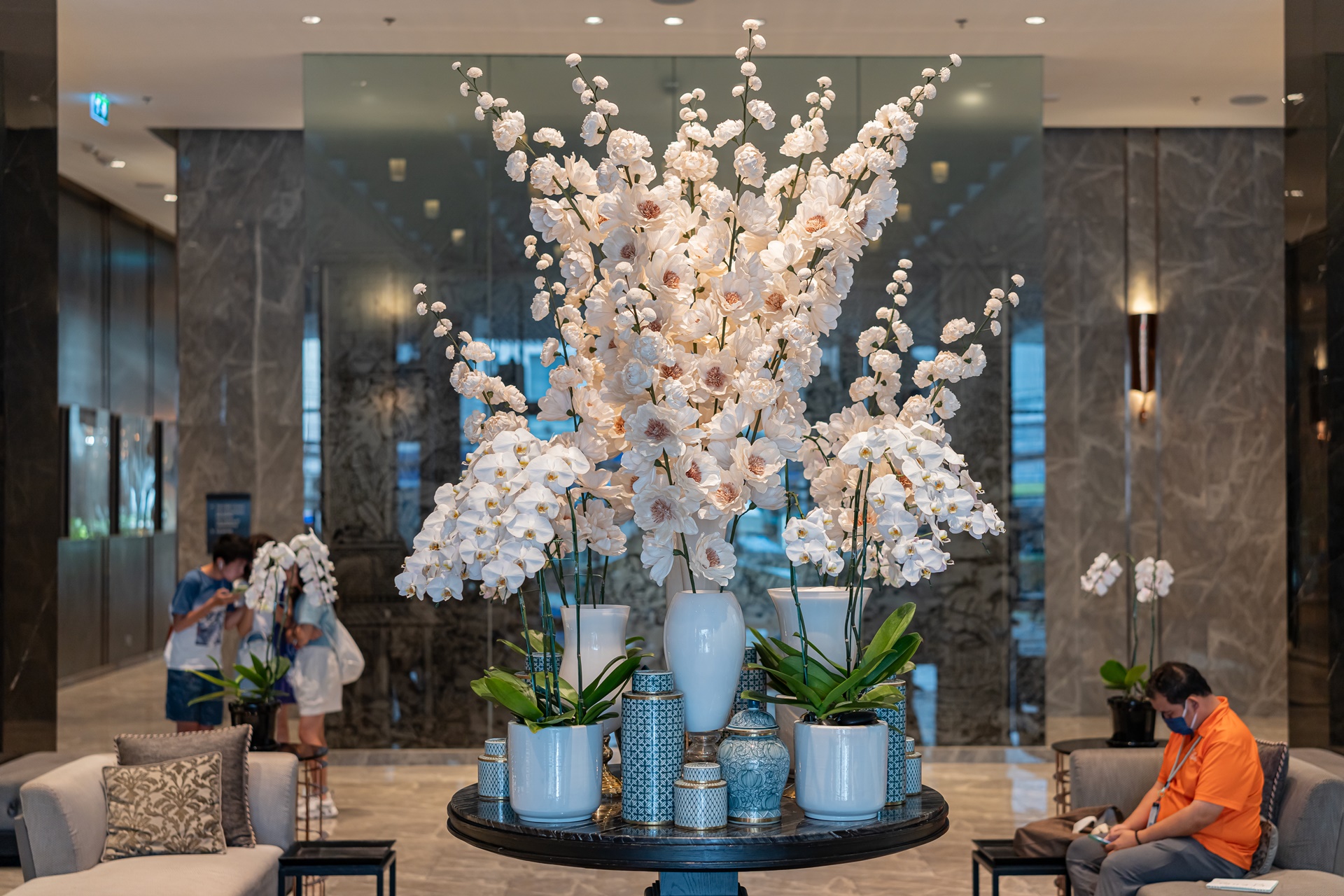 화사한 꽃이 놓여 있는 로비와 맞은편의 카페 공간, 태국 전통 그림이 그려진 엘리베이터 주변의 벽