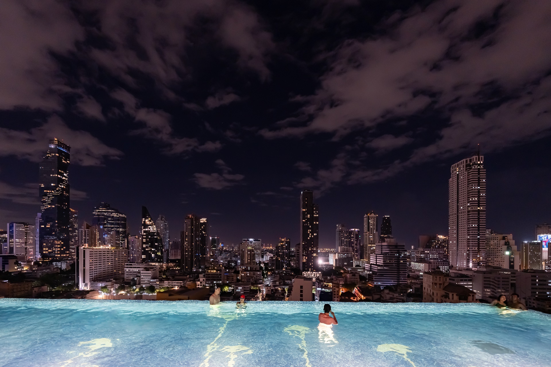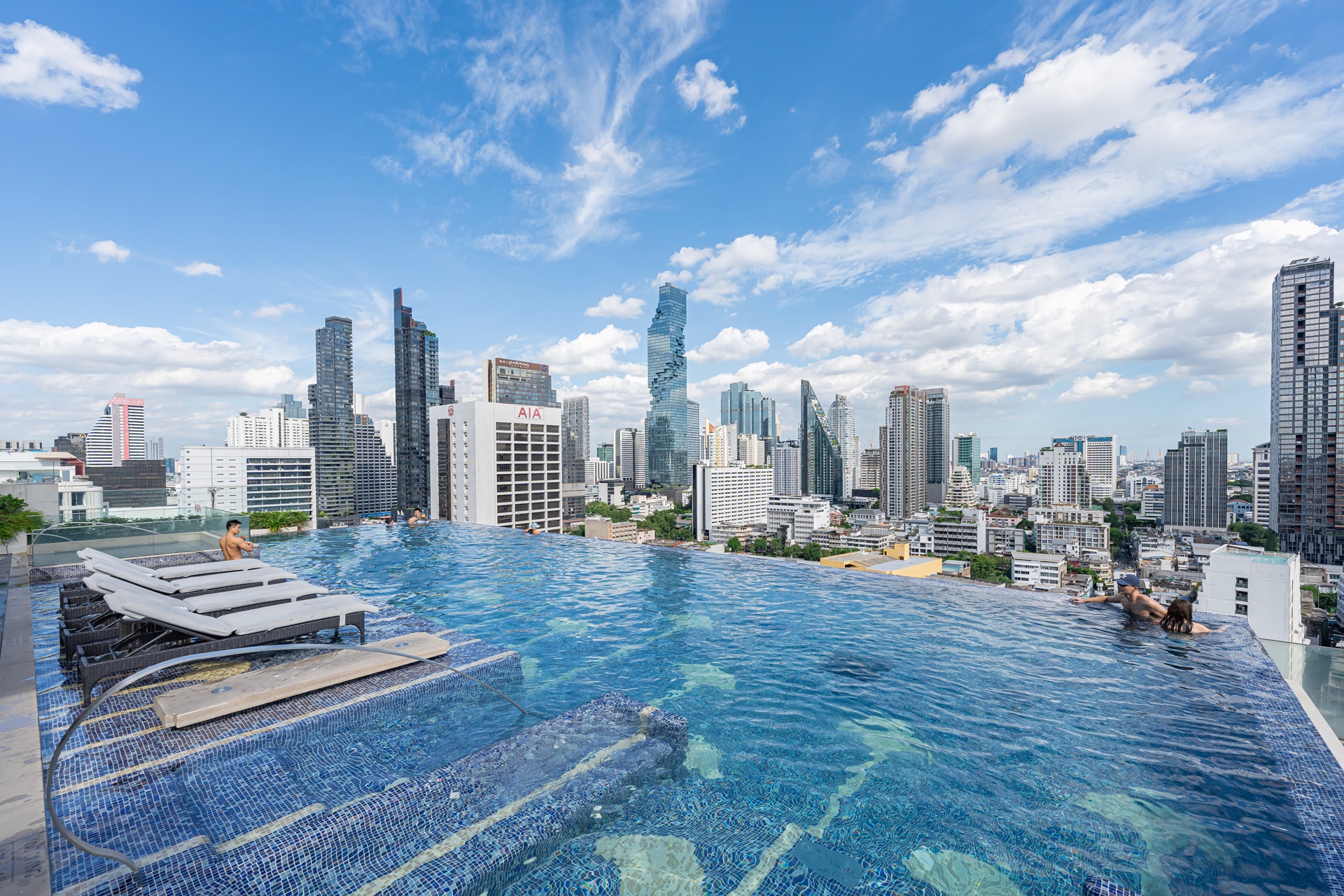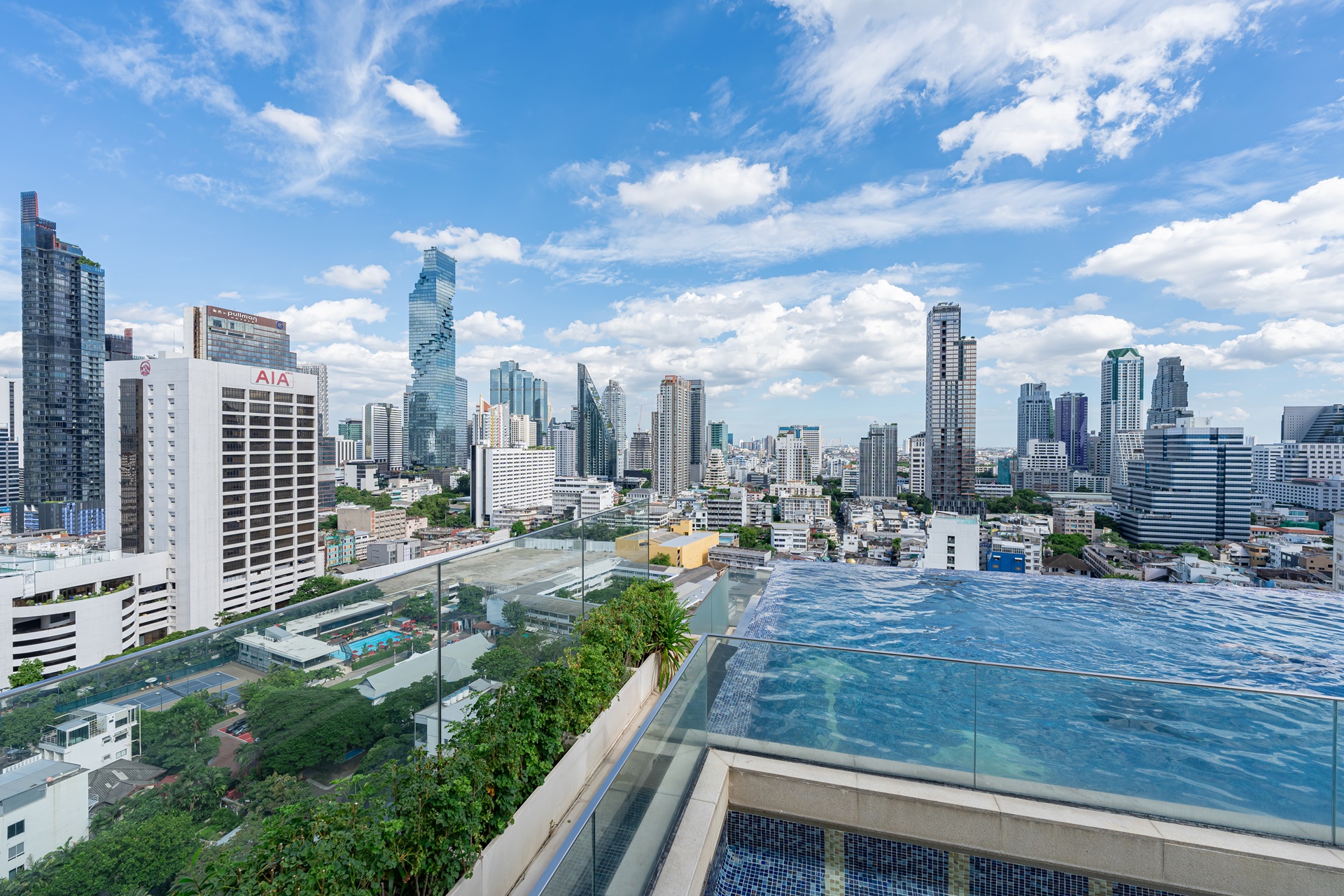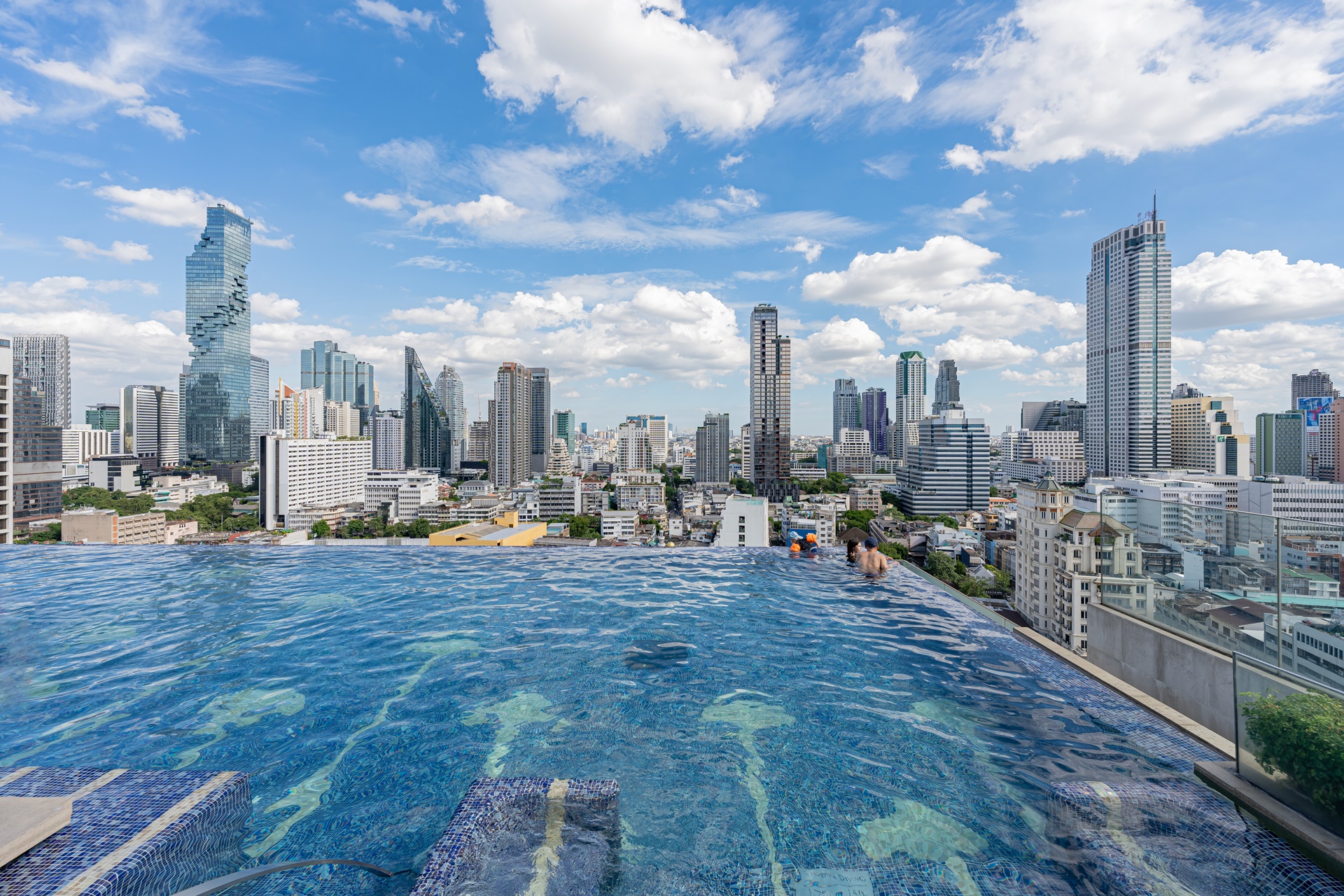 마하나컨을 비롯 방콕 고층 빌딩을 배경으로 풀에서 사진을 찍을 수 있습니다.