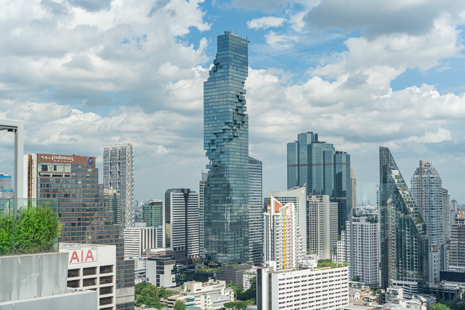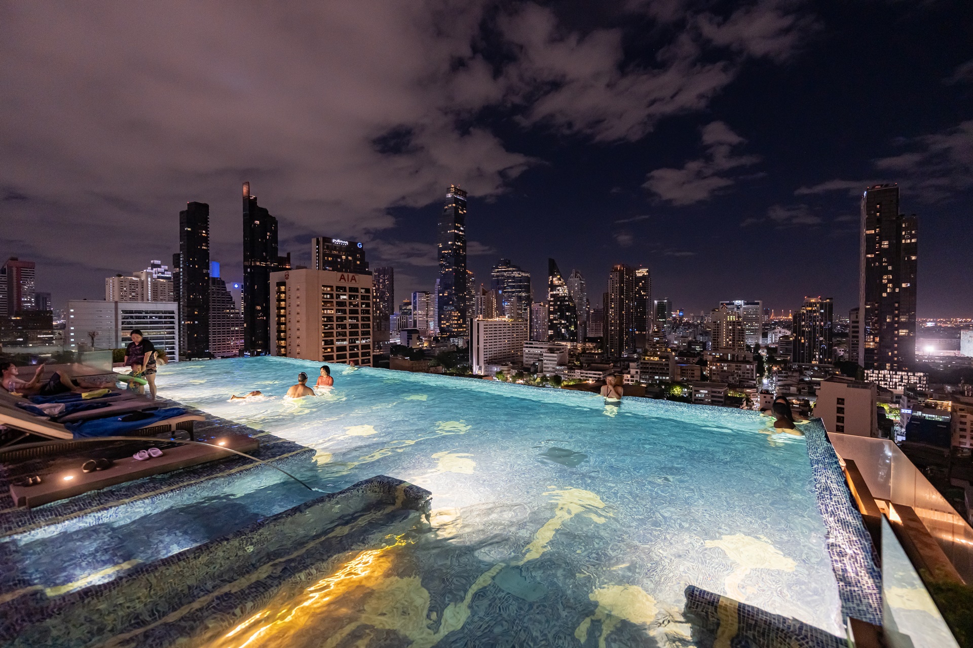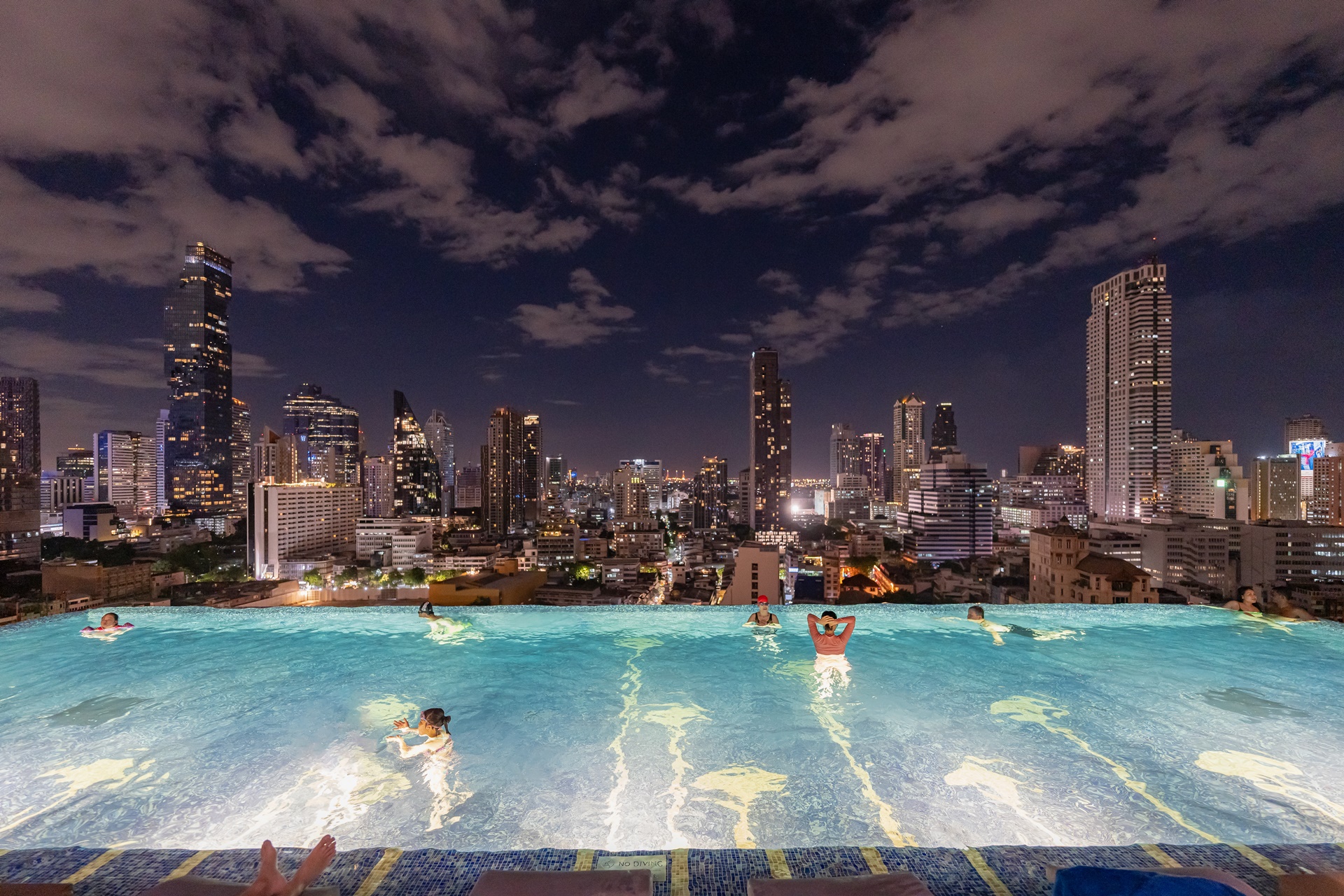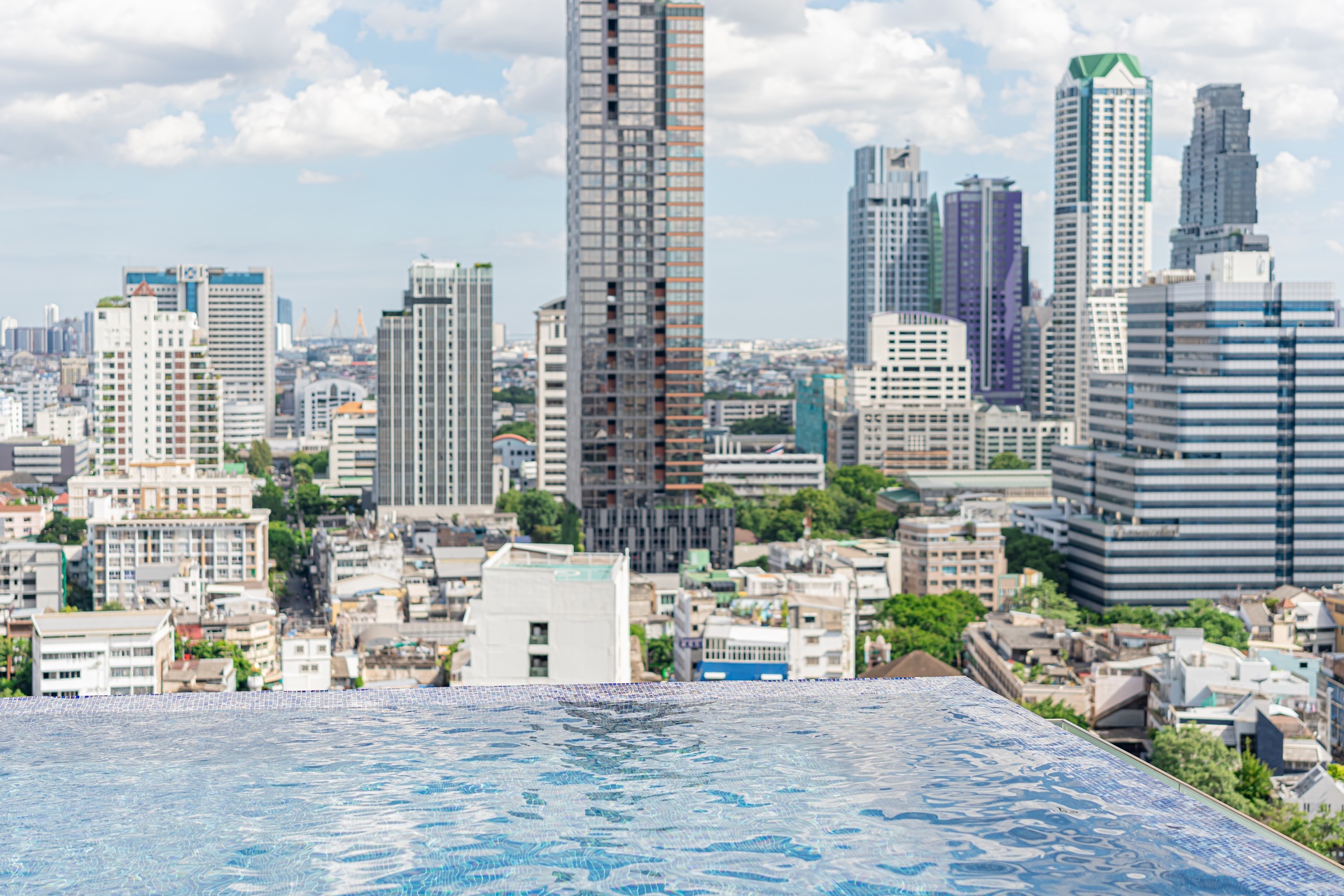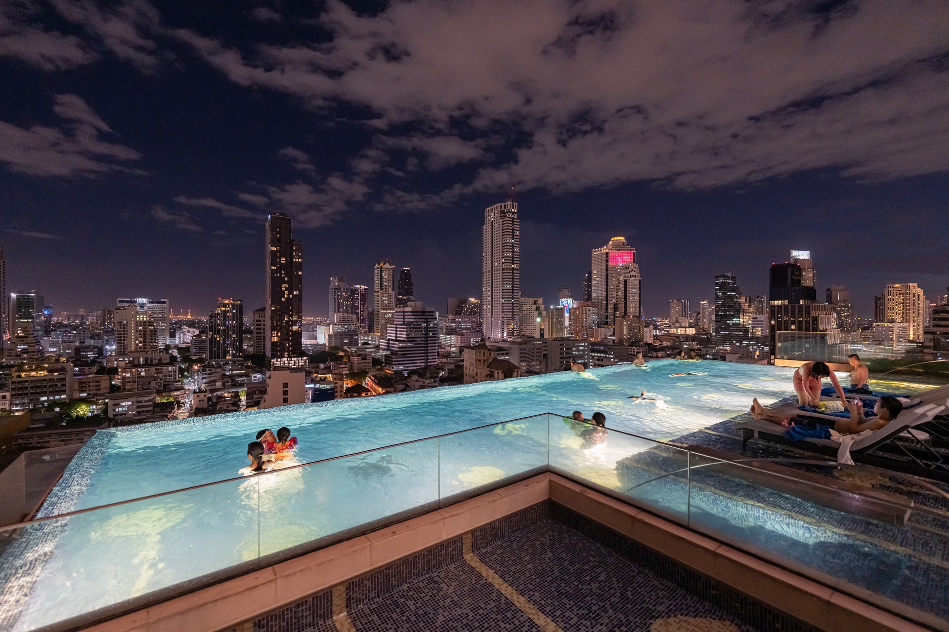 마하나컨을 비롯 방콕 고층 빌딩을 배경으로 풀에서 사진을 찍을 수 있습니다.
