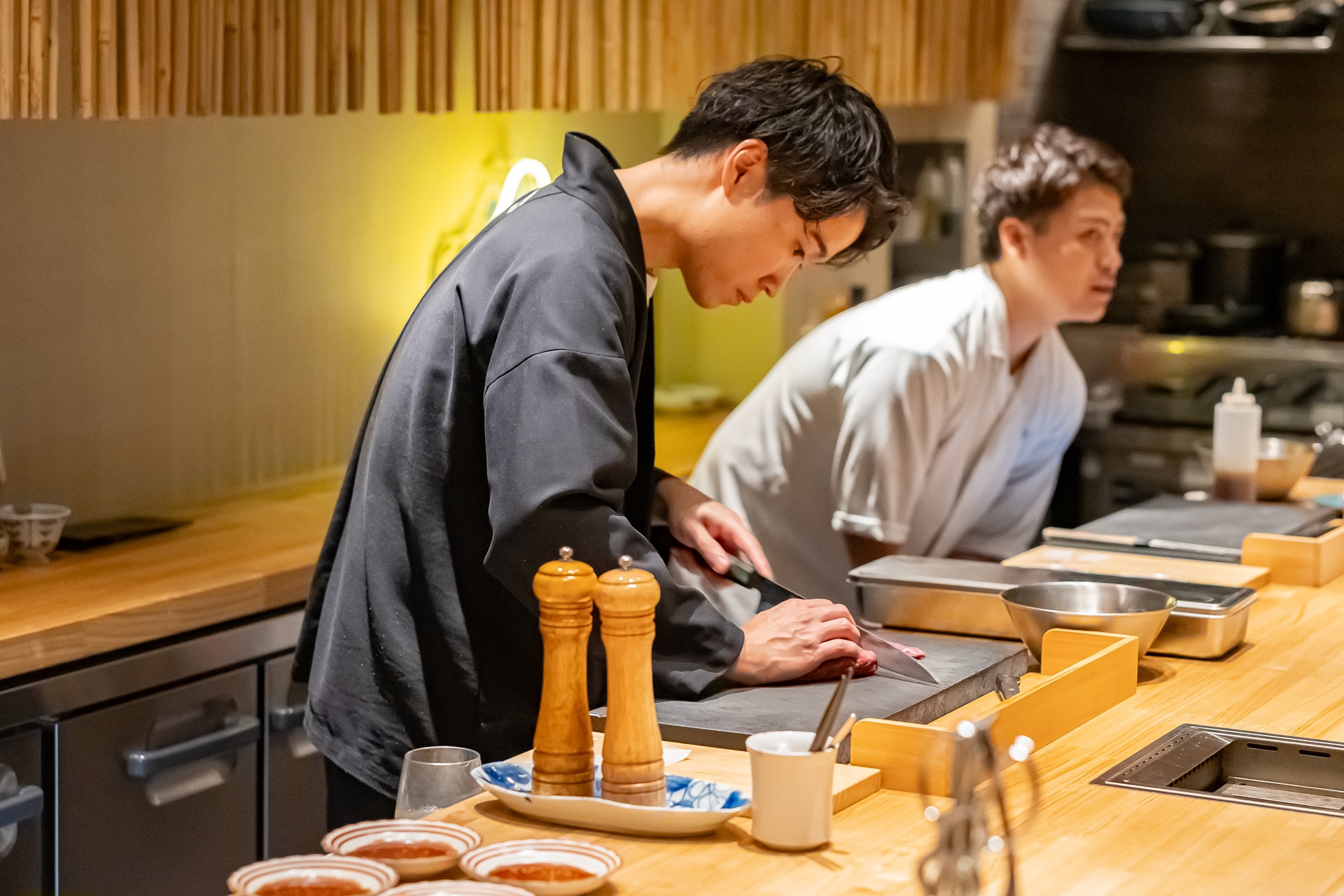 작은 입구를 지나 가게 안으로 들어가면 넓은 테이블이 놓여 있고 입구 쪽은 전부 카운터 석(8석) 입니다. 안쪽에는 따로 테이블이 있는 방이 있으며 좌석이 그렇게 많지 않기 때문에 예약은 필 수 일 것 같습니다. 저희는 구글에서 보고 5시 50분쯤 아무 생각없이 들어 갔는데 마침 카운터 2 자리가 남아 있어 이용할 수 있습니다. 전화로도 예약이 가능하며 일본 예약 사이트인 다베로그에서도 예약이 가능합니다.