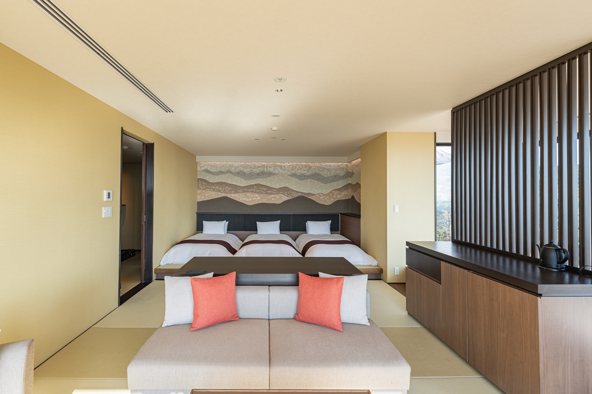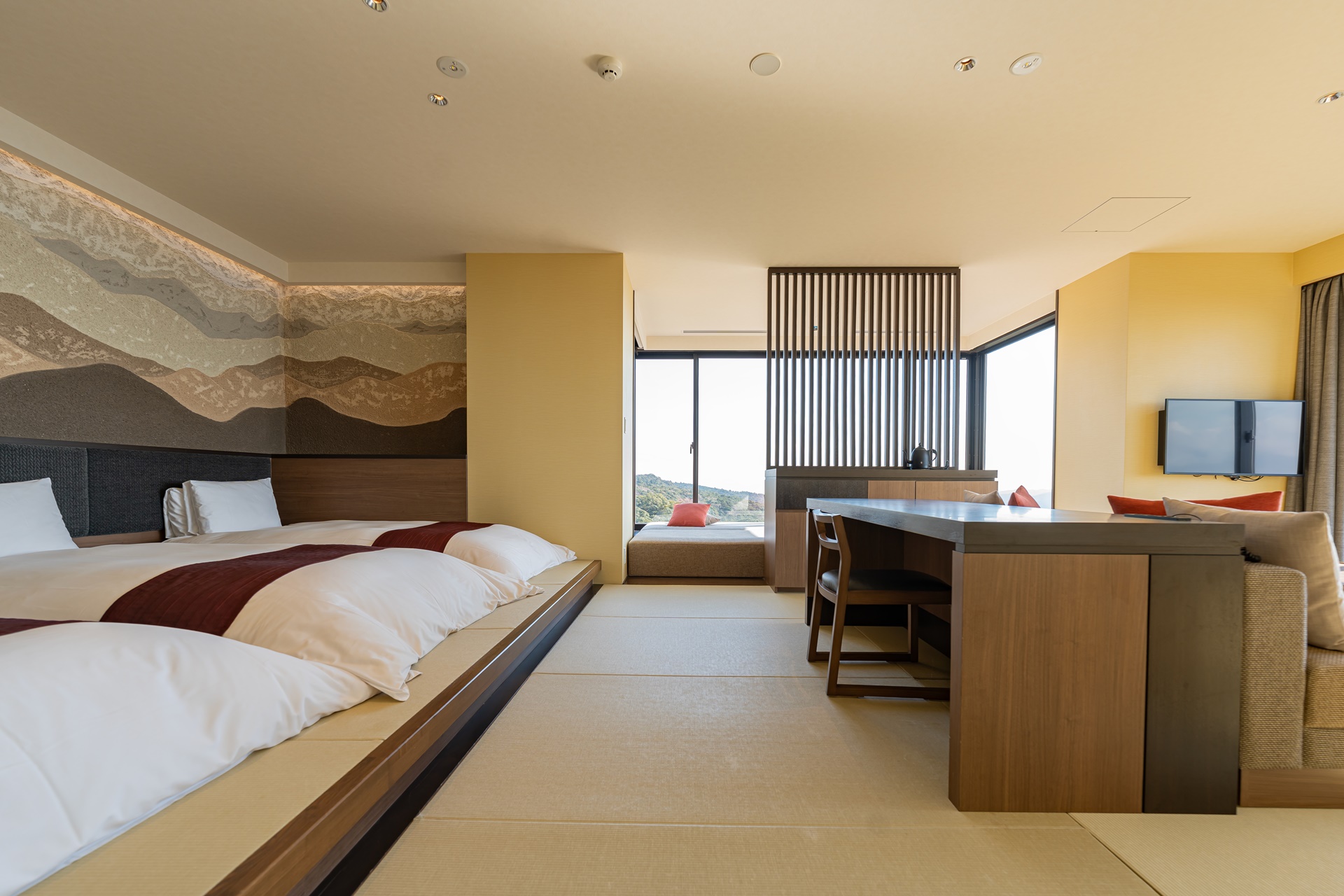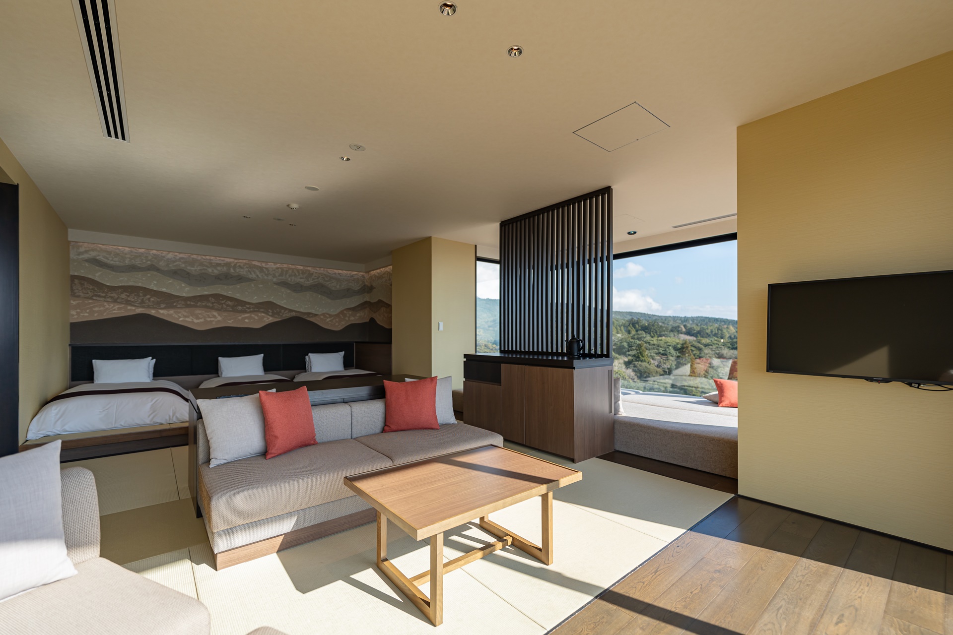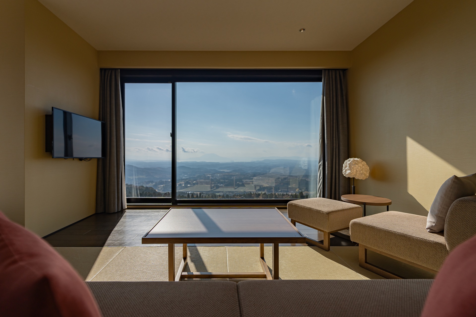 로비에서 방으로 이동합니다. 방은 기리시마의 멋진 뷰를 두 방향에서 볼 수 있는 코너 룸