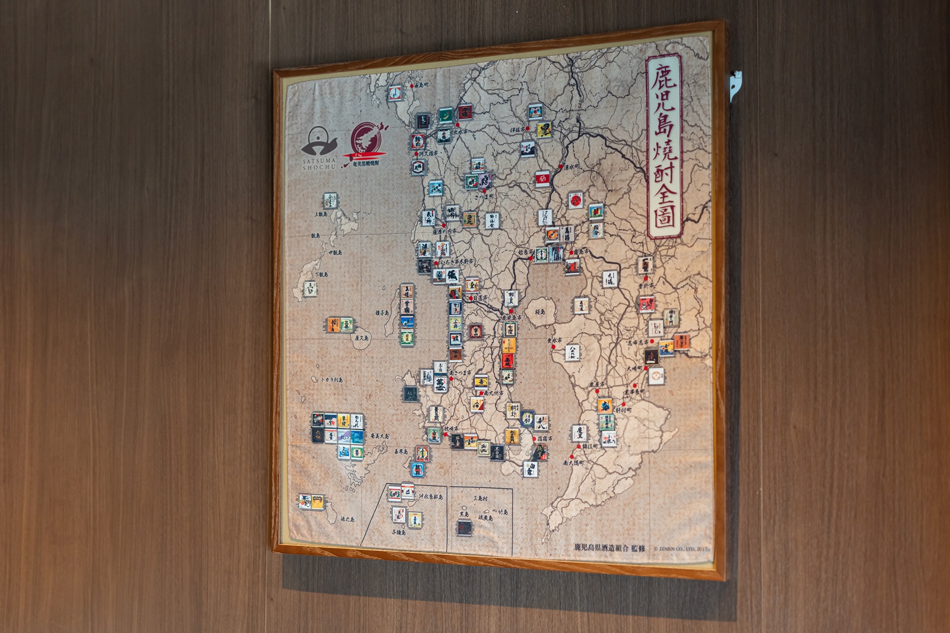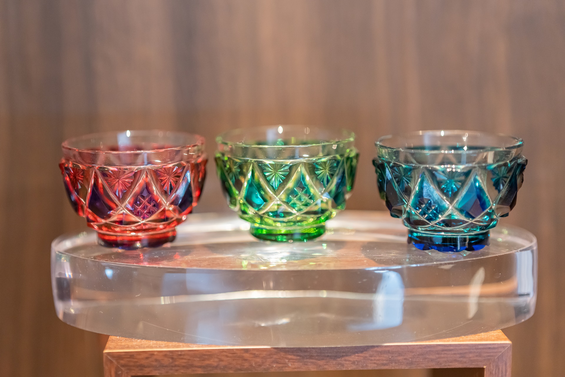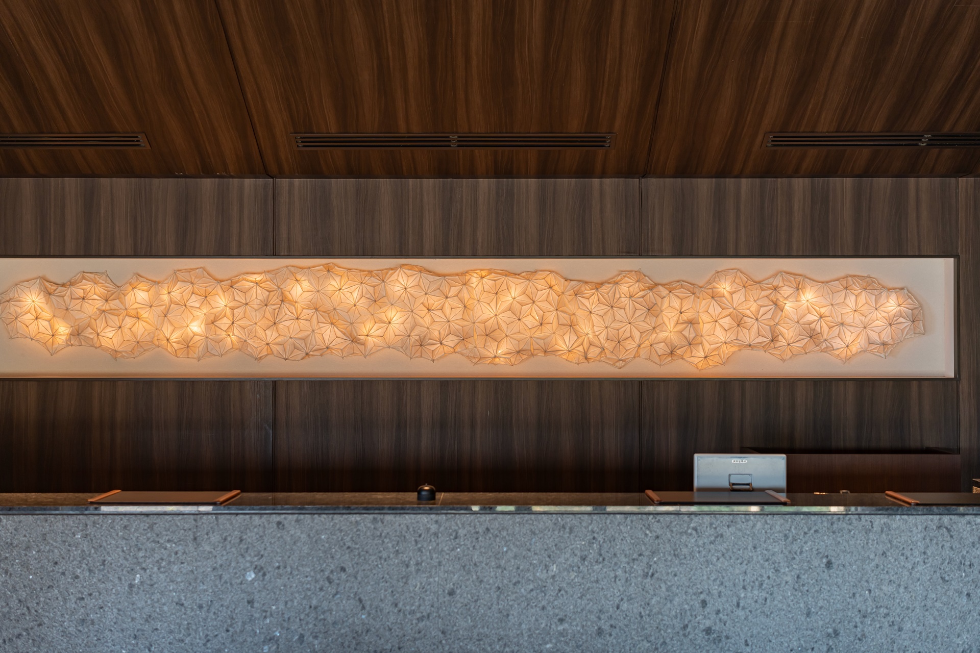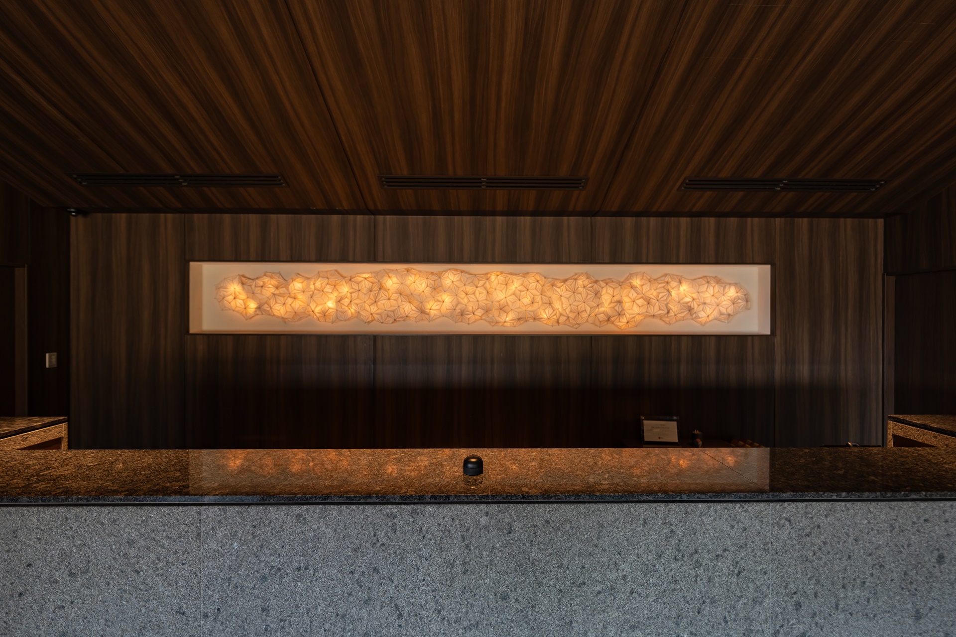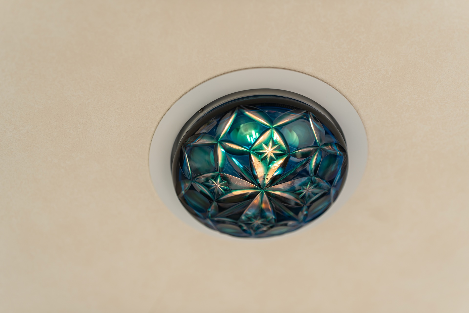 천장의 조명은 사쓰마키리코, 사쓰마키리코는 가고시마의 유리 공예로 유리에 색을 입히는 기법과 유럽의 컷팅 기술을 이용하여 독특한 유리 공예품을 만들어 내고 있습니다. 투명한 크리스탈 유리 표면에 1mm 이상의 두께로 색유리를 씌우고 깊게 컷팅하여 연마하는 것이 특징입니다.