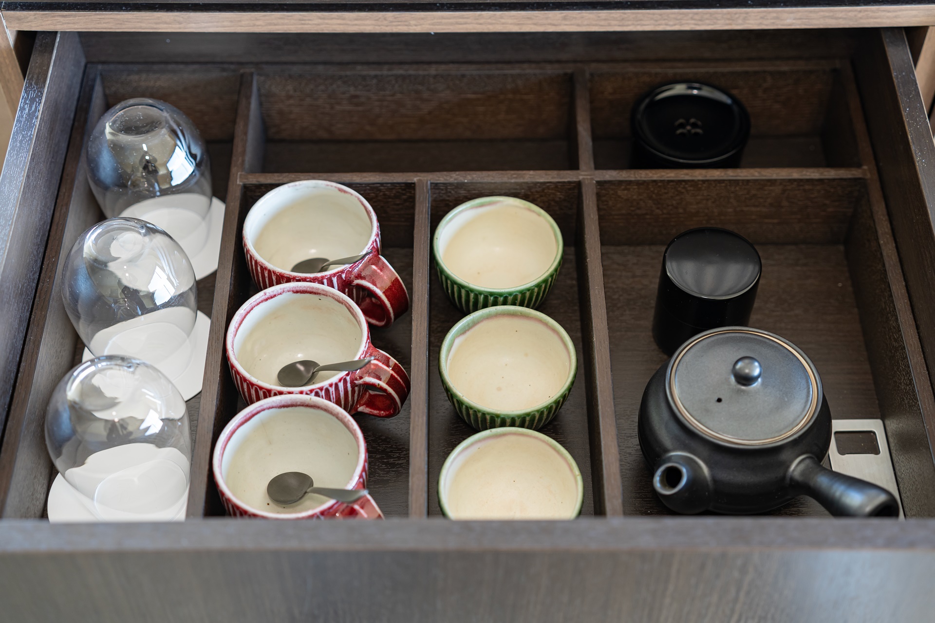 가고시마는 생산량으로는 일본에서 시즈오카와 함께 1~2위를 다툴 정도로 녹차가 많이 재배되는 지역입니다. 그래서 인지 카이 기리시마에서도 다양한 녹차 티백이 준비되어 있었으며 미리 내려놓은 녹차도 있었습니다. 그 옆에는 물과 커피