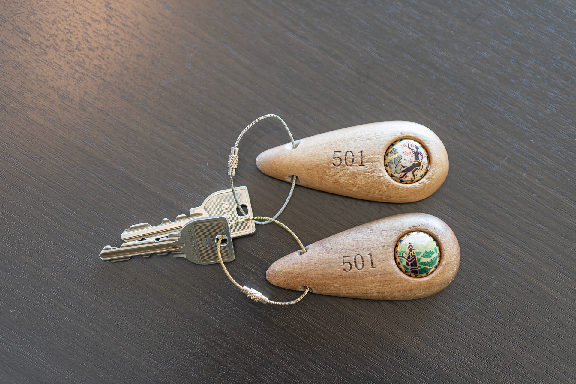 가고시마의 녹차를 마시며 체크인을 합니다. 이날 받은 방은 501호 열쇠의 나무 조각안에 가고시마의 공예품이 들어가 있었습니다.