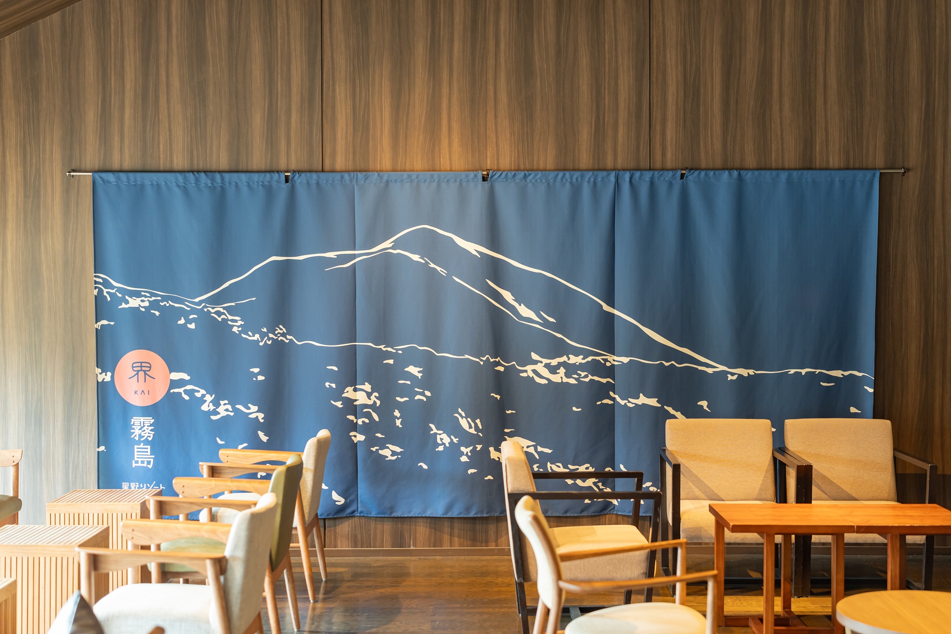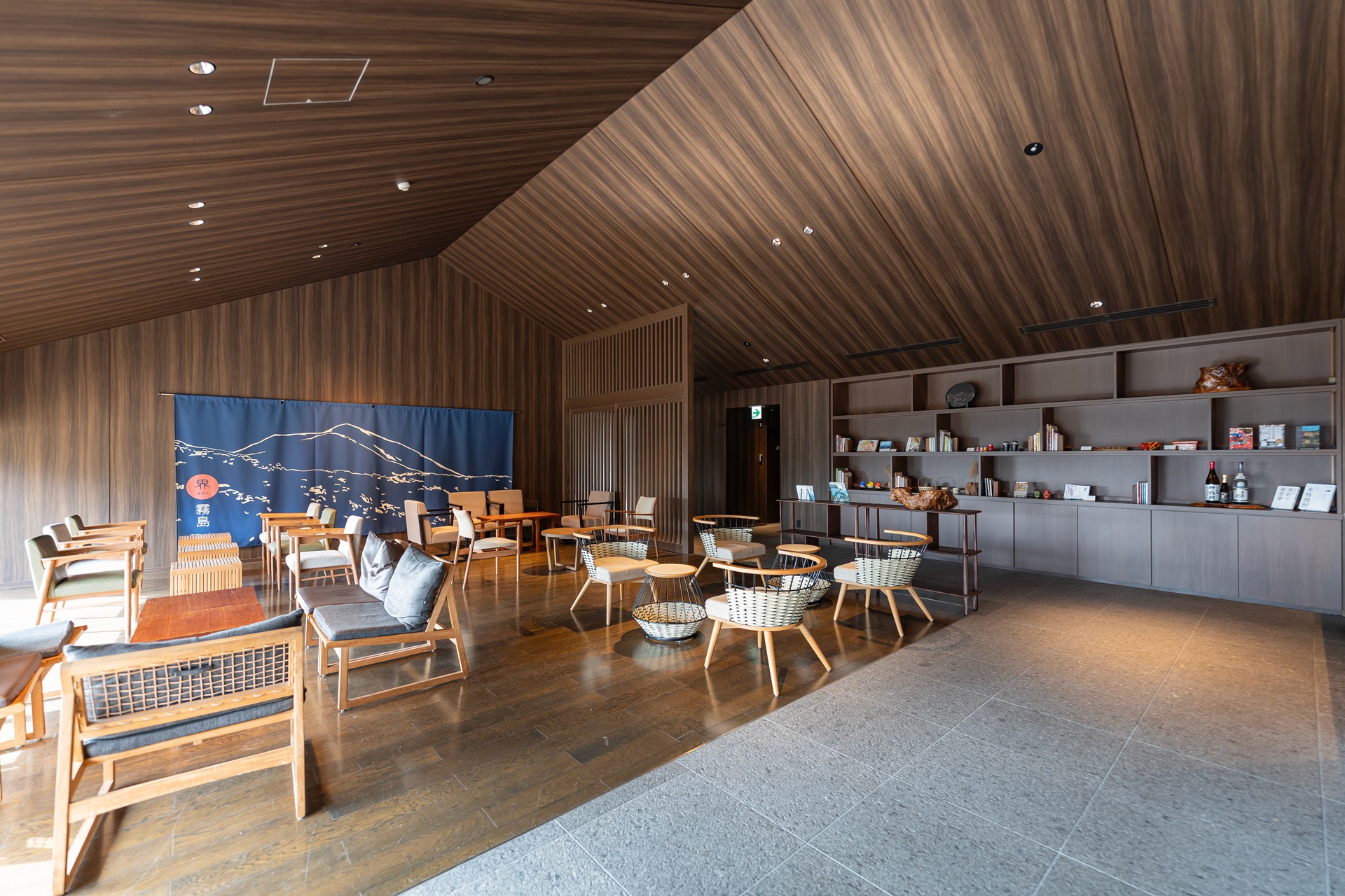 로비의 모습입니다. 로비는 숙박을 하면서 자유롭게 이용할 수 있으며 한 편에는 커피와 차 등의 음료가 준비되어 있습니다. 카이 기리시마의 노렌이 걸려 있었으며 노렌에 그려져 있는 그림은 이곳에서 보이는 다카치호 미네의 모습입니다.