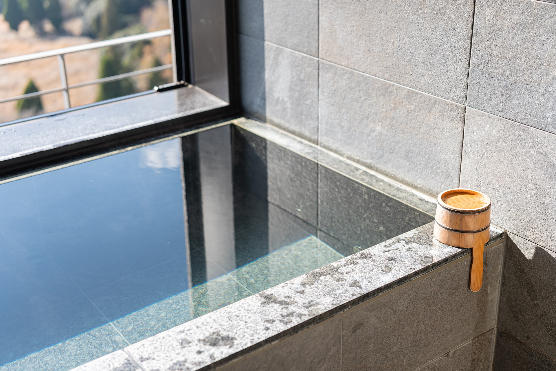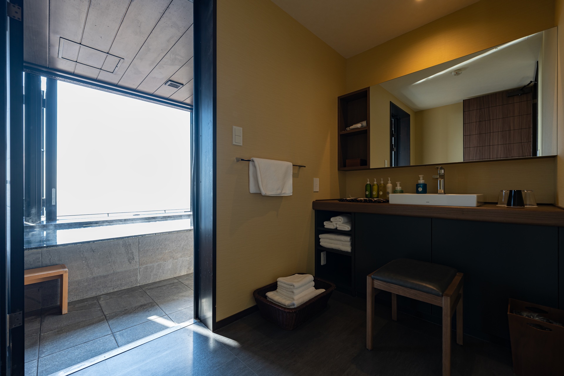 창문을 활짝 열으면 멋진 풍경을 감상하며 따뜻한 온천을 즐길 수 있는 노천 온천탕이 완성됩니다.