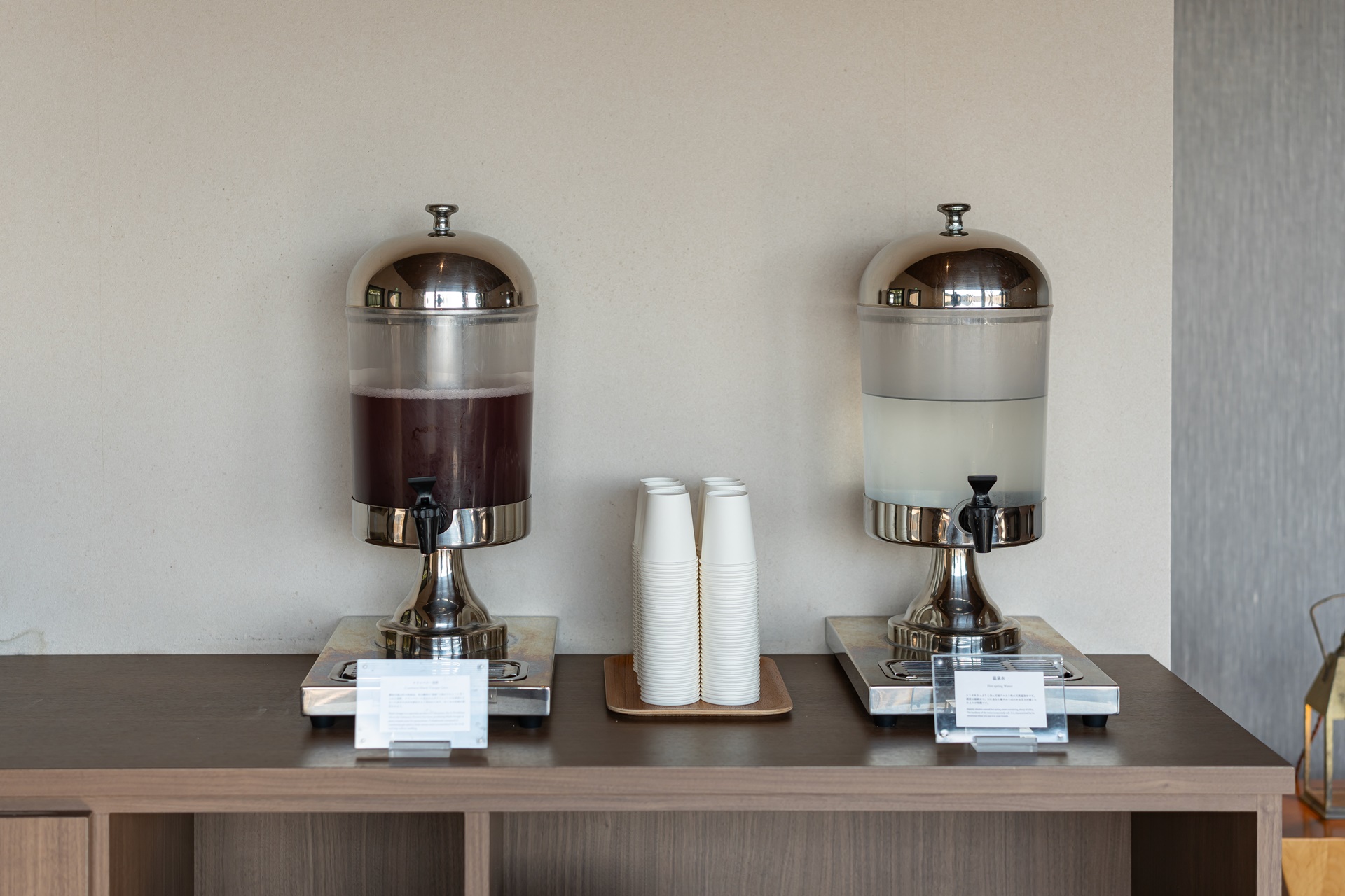 온천을 하기 전후에는 수분 보충이 필요하기 때문에, 온천 수와 사과 초 음료 등이 휴게실에 준비되어 있었습니다.