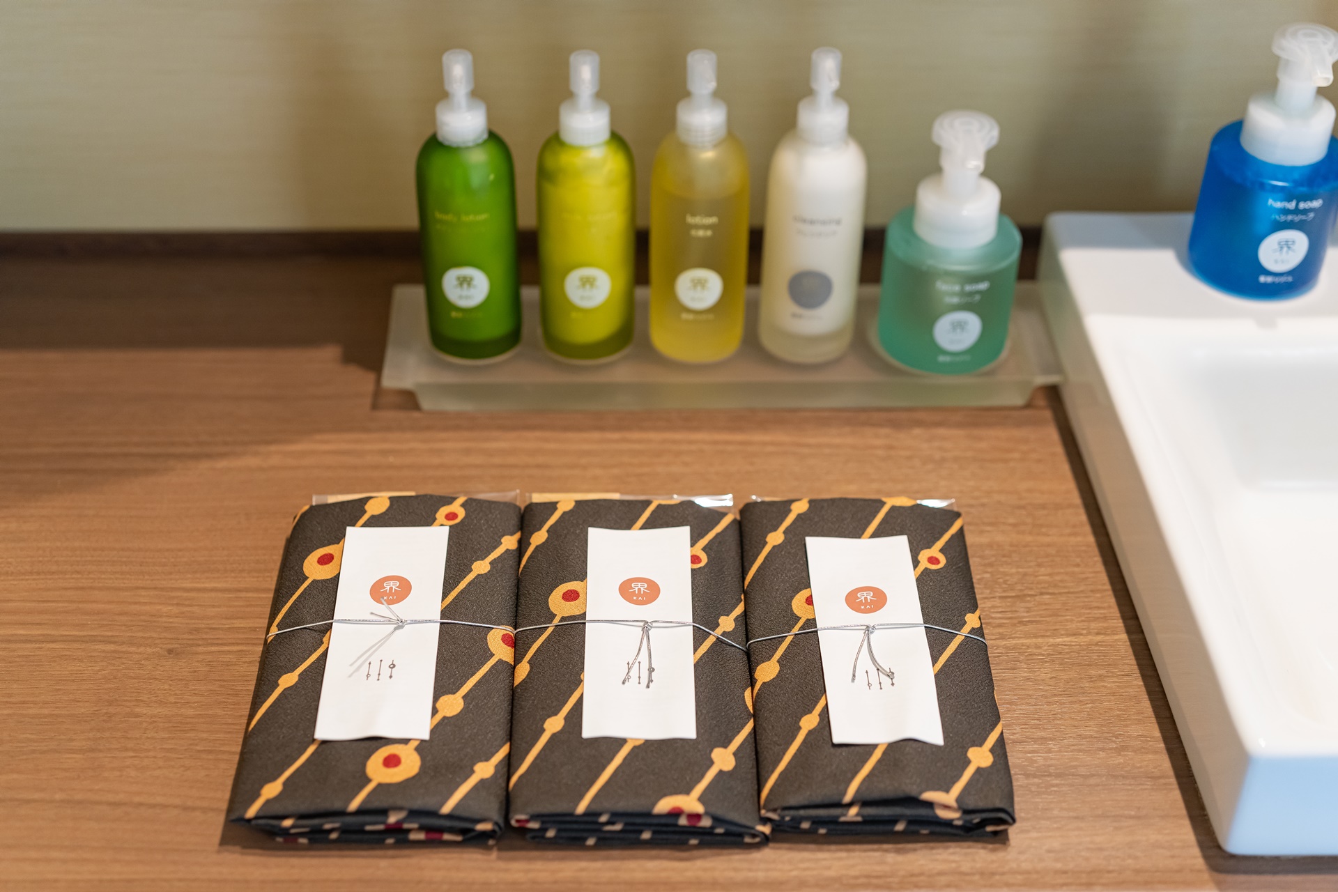 호시노 리조트 카이 브랜드에는 세면대에 일본 보자기인 데누구이가 놓여 있으며 이 안에 칫솔 등의 어메니티가 들어 있고 보자키는 기념으로 가져가도 됩니다. 샴푸, 로션 등의 어메니티는 전부 카이 오리지널 브랜드 입니다.