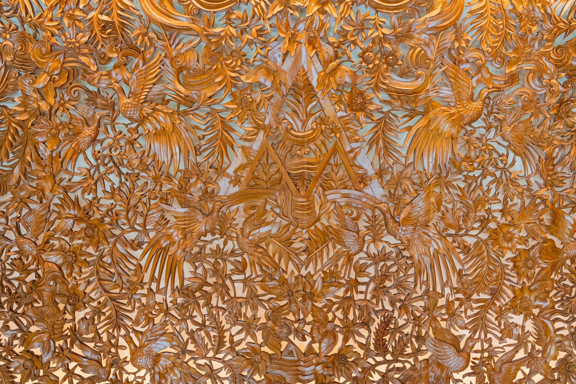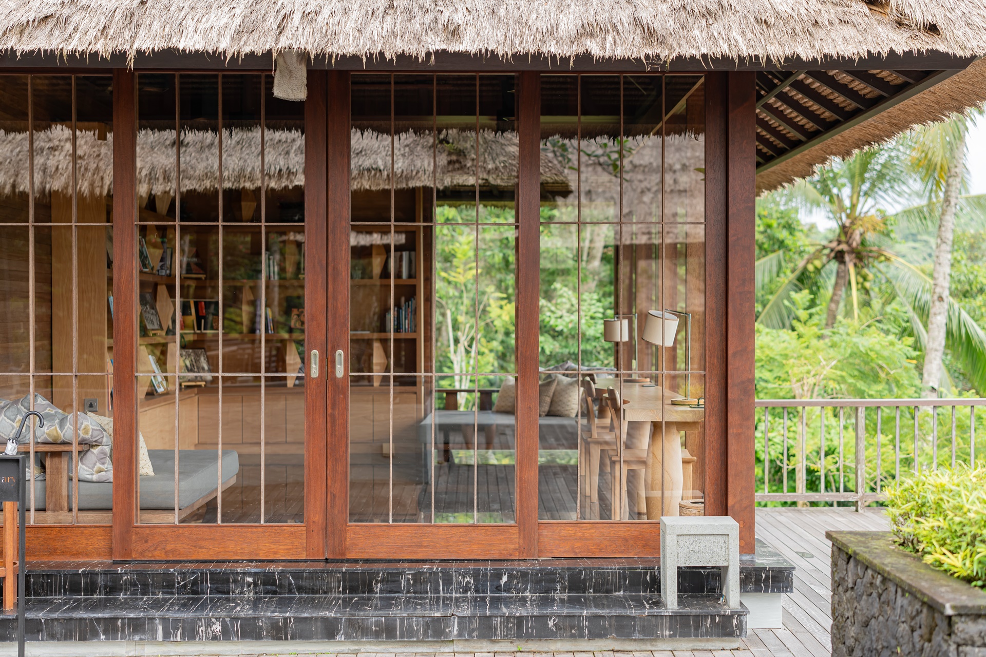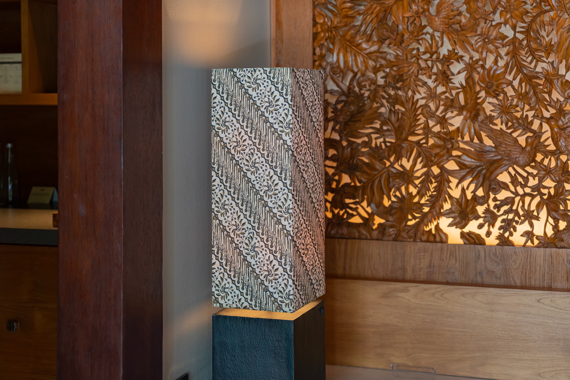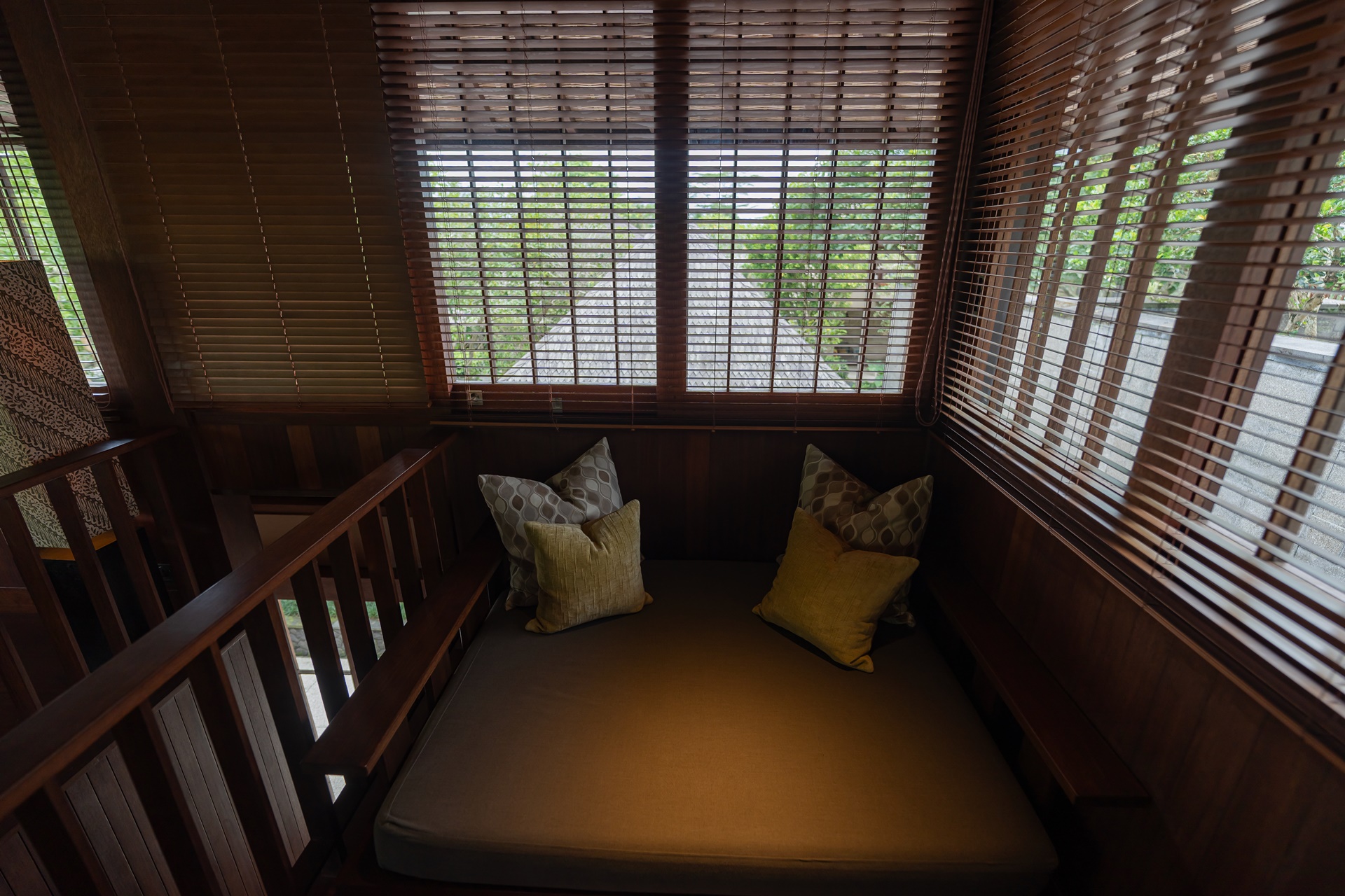 객실은 복층 빌라로 1층은 거실, 2층은 침실이며 1층 거실은 편안한 소파와 쿠션이 많이 놓여 있었습니다. 벽면에는 카빙이라는 우붓의 나무조각으로 꾸며져 있는데 발리 사람들의 섬세함을 느낄 수 있는 작품이었습니다.