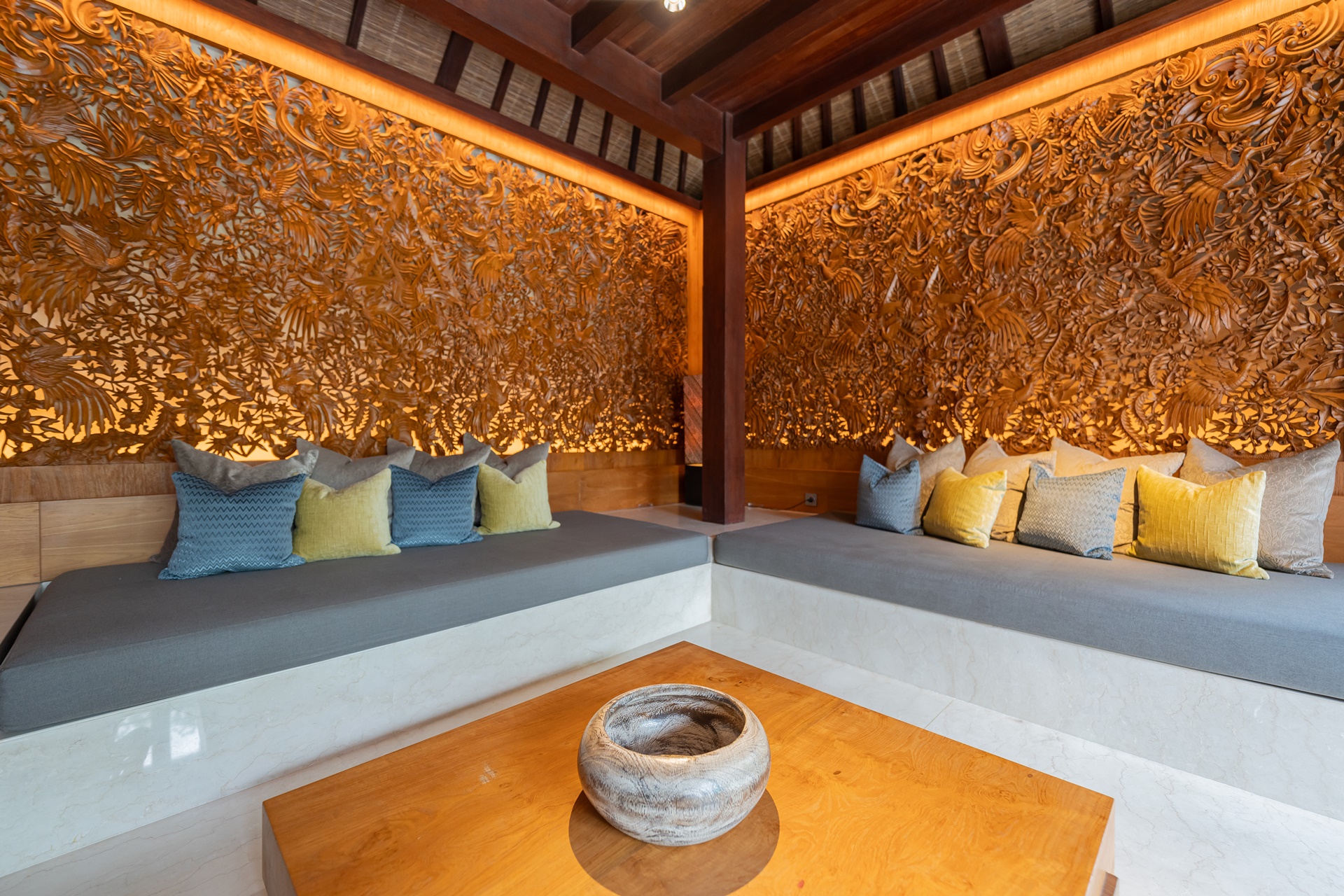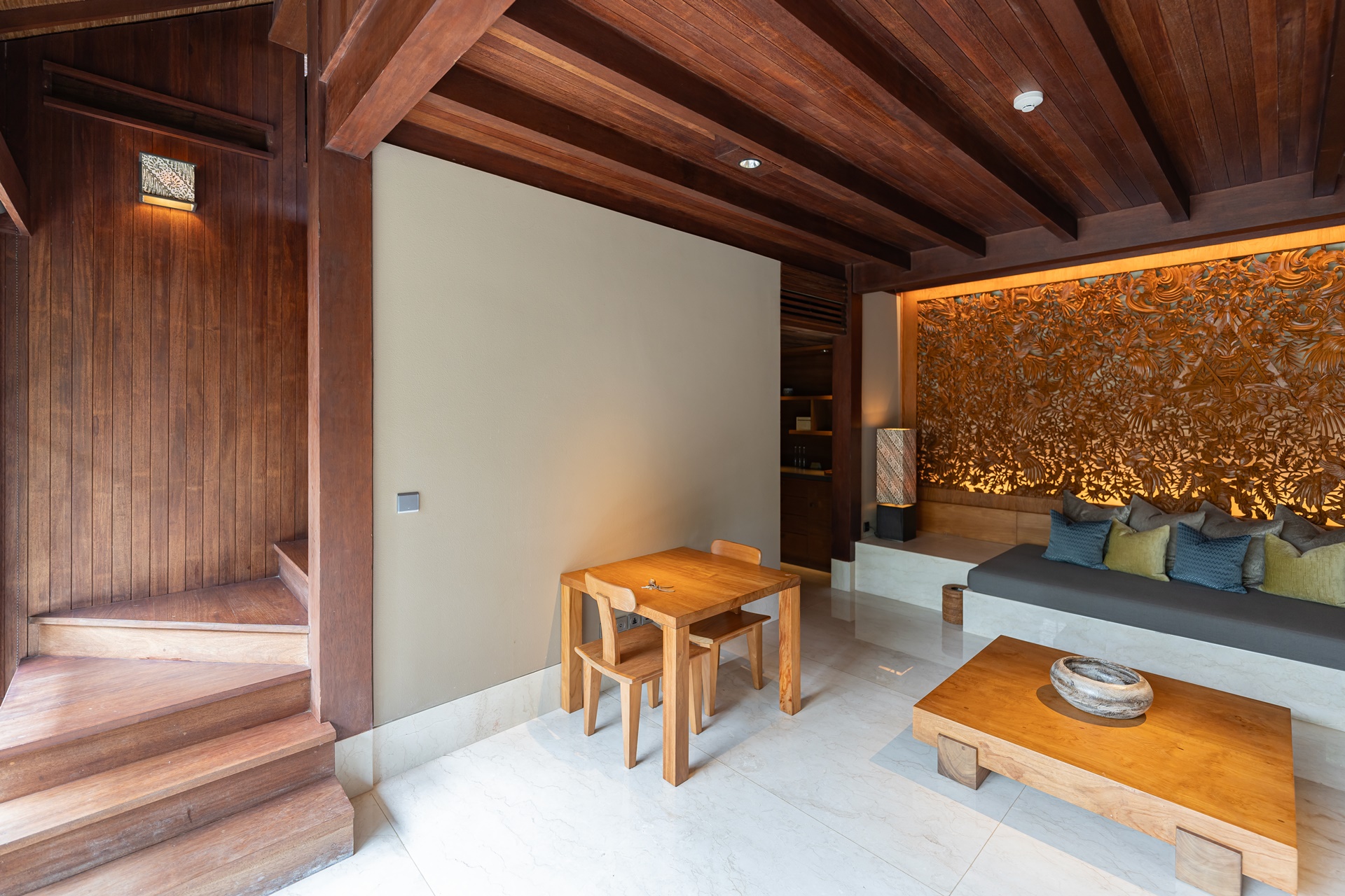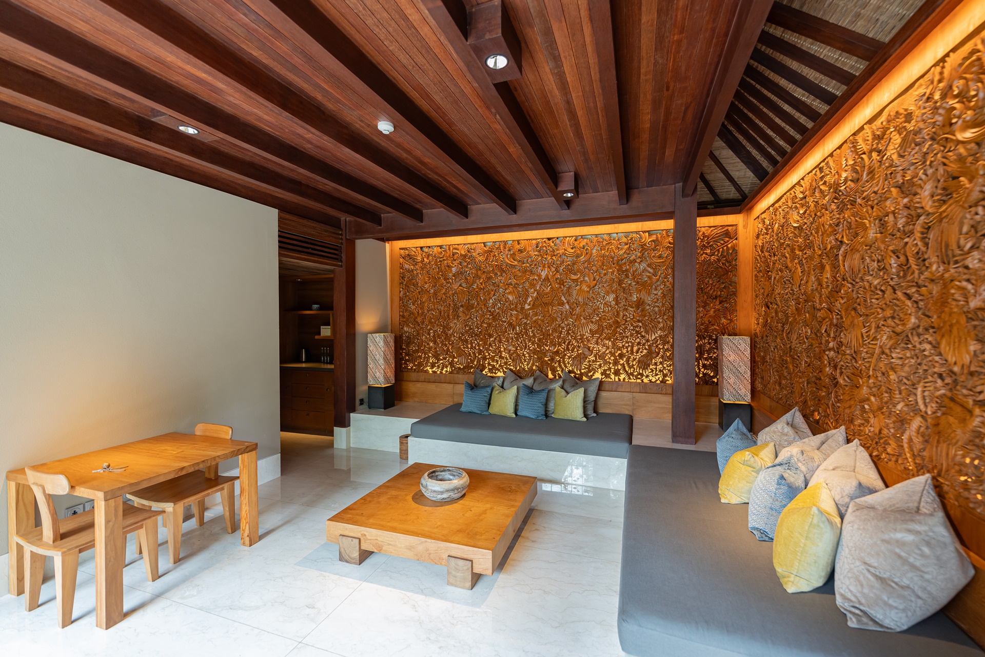 객실은 복층 빌라로 1층은 거실, 2층은 침실이며 1층 거실은 편안한 소파와 쿠션이 많이 놓여 있었습니다. 벽면에는 카빙이라는 우붓의 나무조각으로 꾸며져 있는데 발리 사람들의 섬세함을 느낄 수 있는 작품이었습니다.