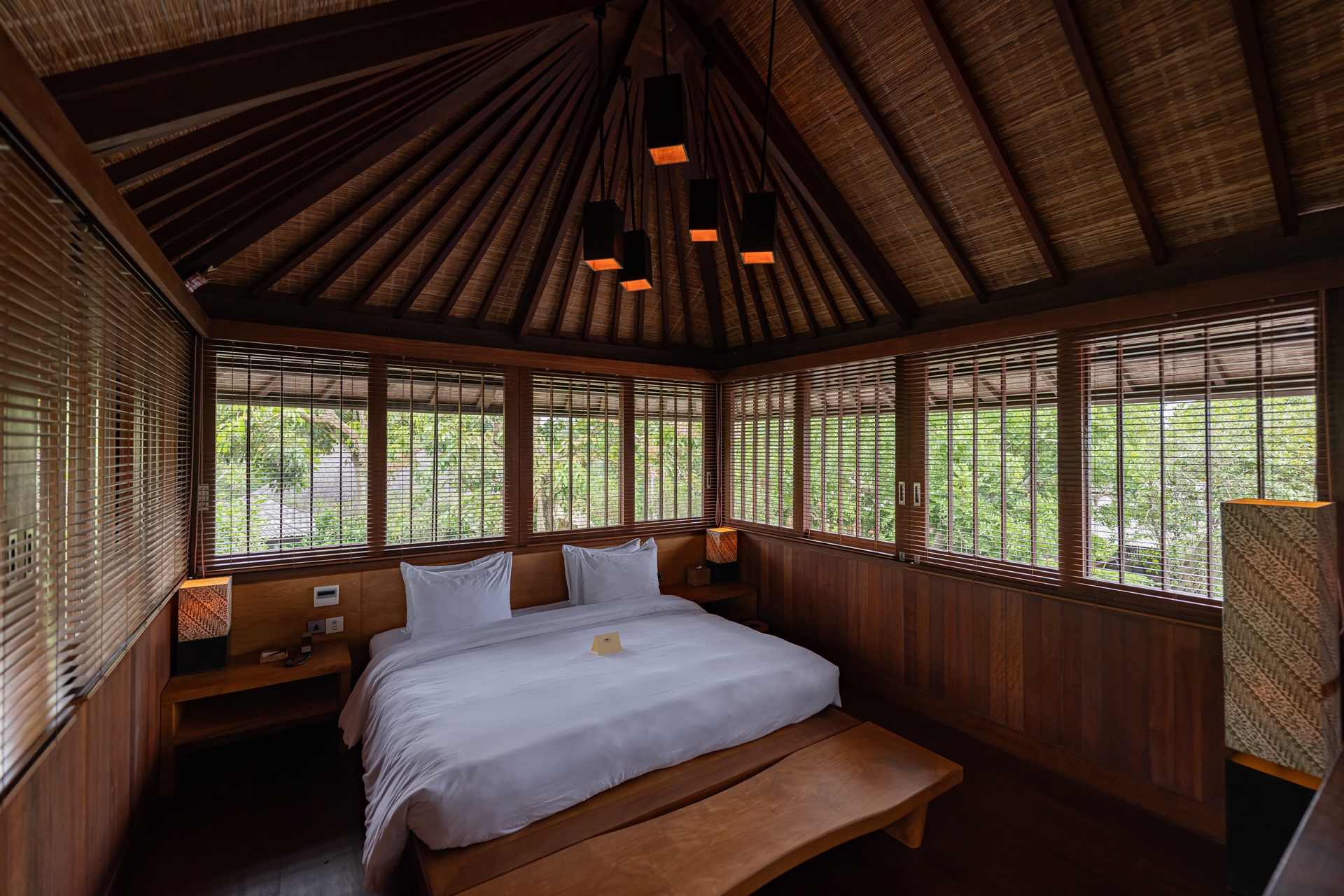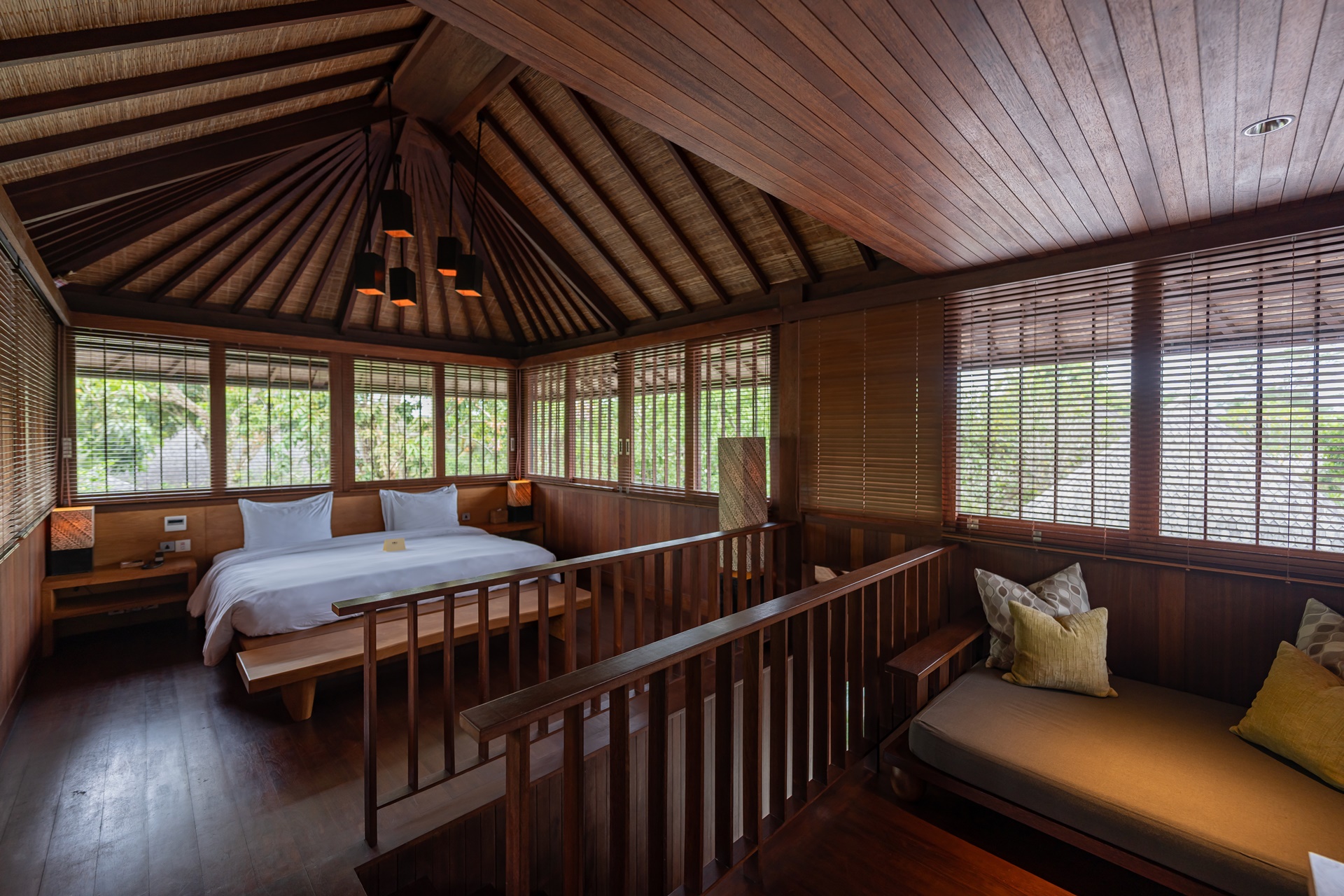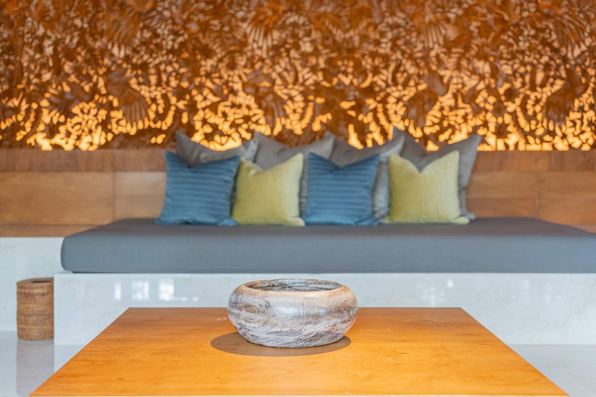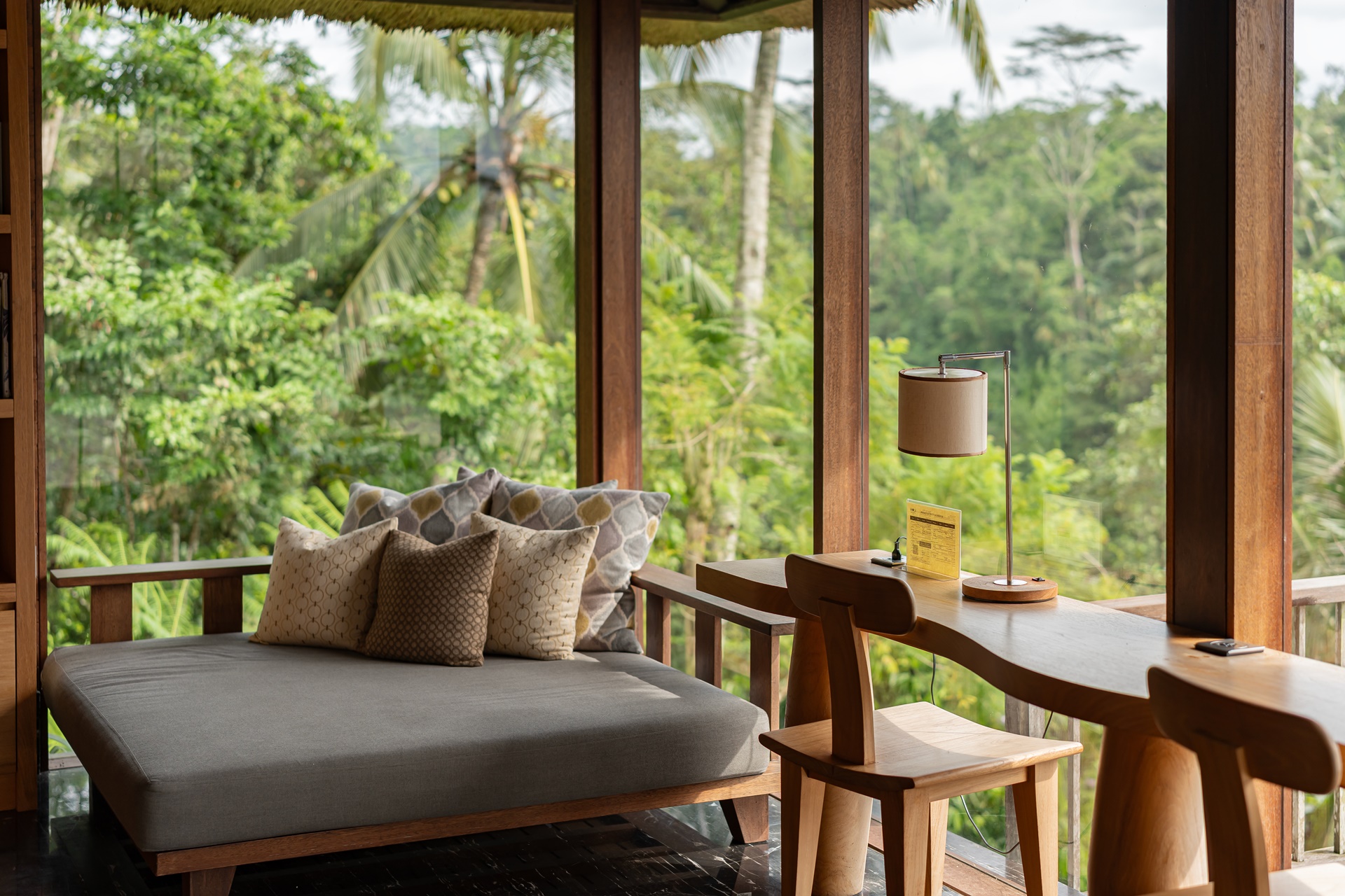 객실은 복층 빌라로 1층은 거실, 2층은 침실이며 1층 거실은 편안한 소파와 쿠션이 많이 놓여 있었습니다. 벽면에는 카빙이라는 우붓의 나무조각으로 꾸며져 있는데 발리 사람들의 섬세함을 느낄 수 있는 작품이었습니다.