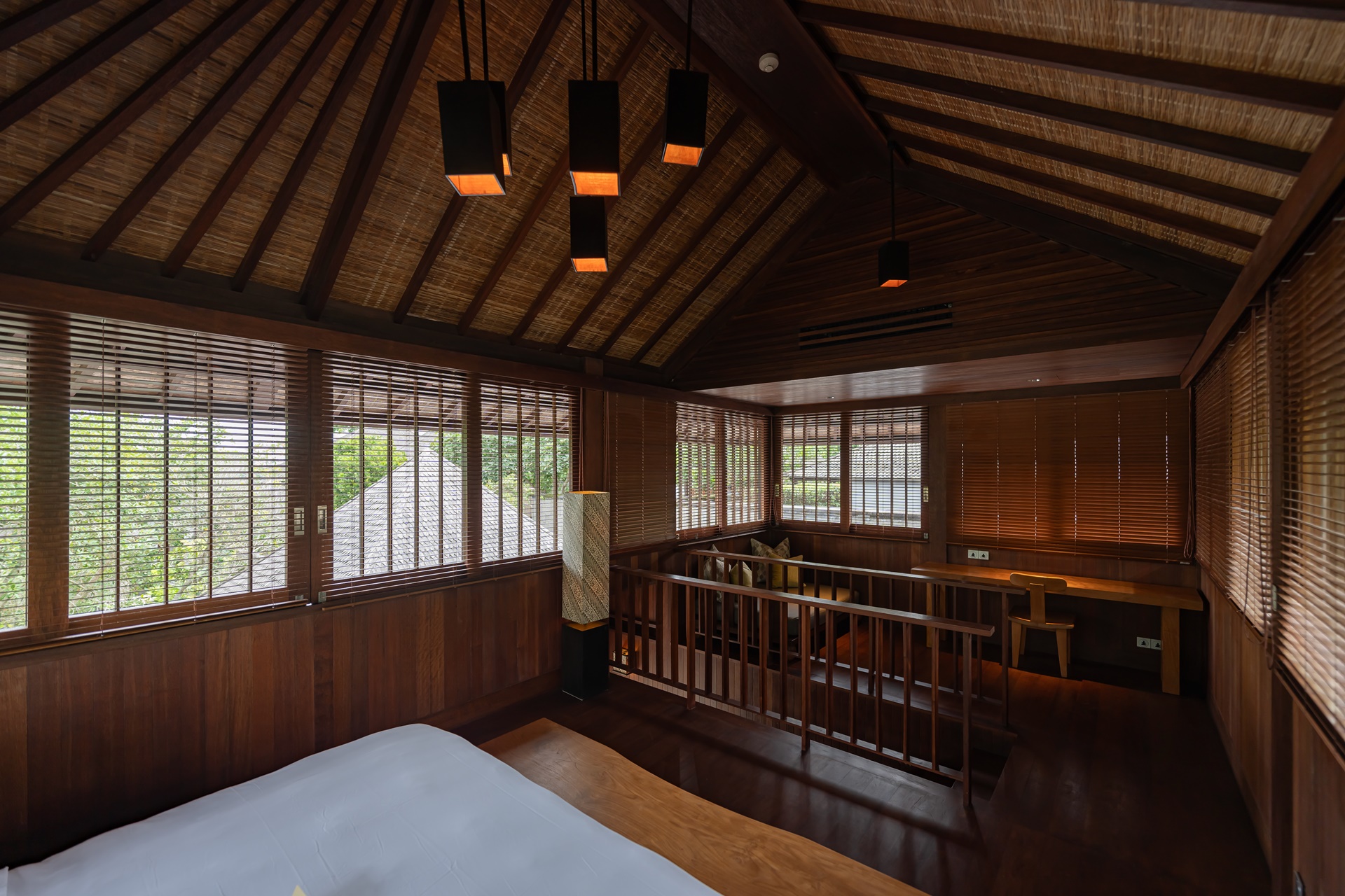 넓은 파노라마 뷰 침실, 계단을 중심으로 침실과 책상과 소파가 놓여 있는 장소로 나뉩니다.