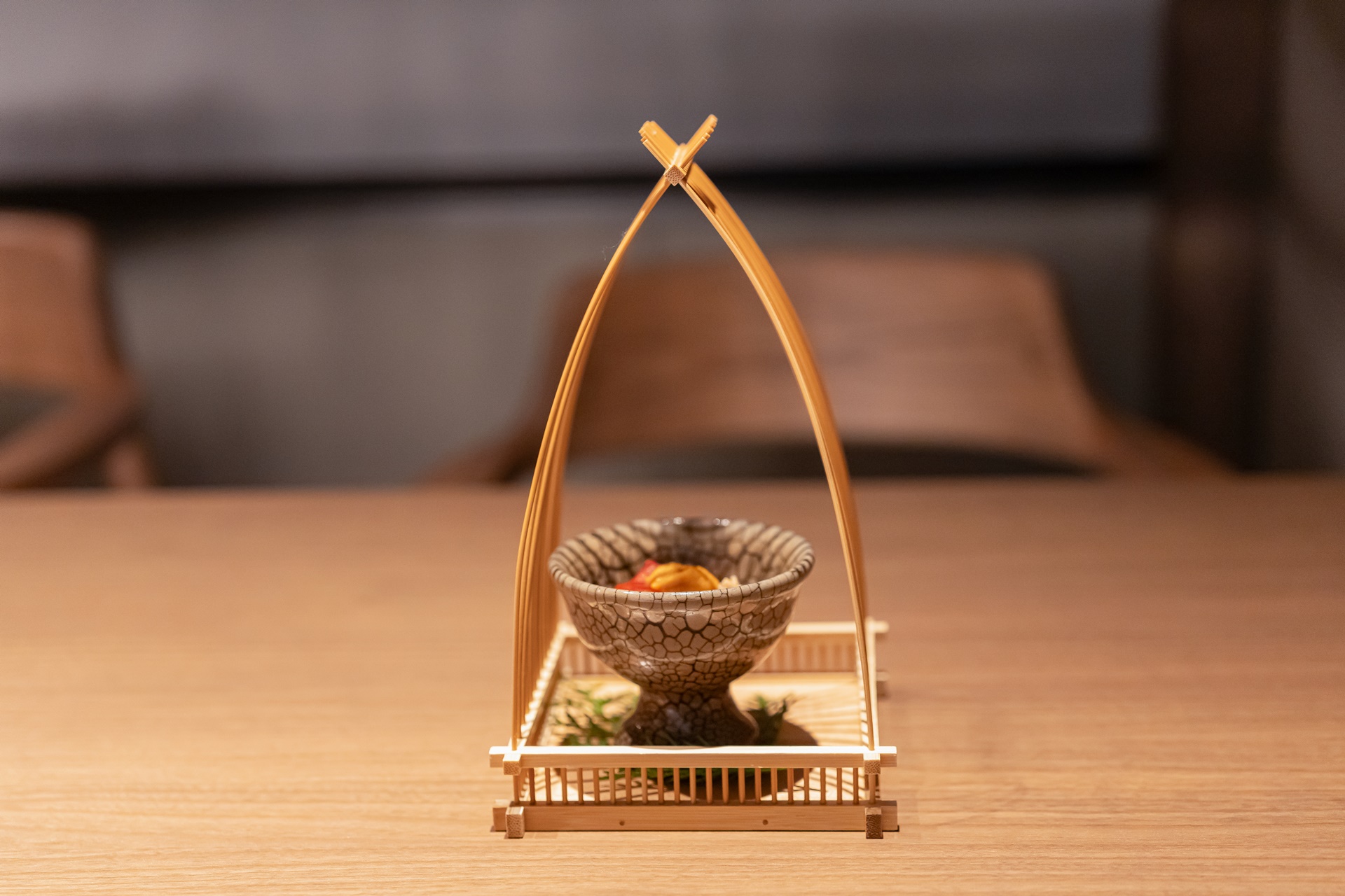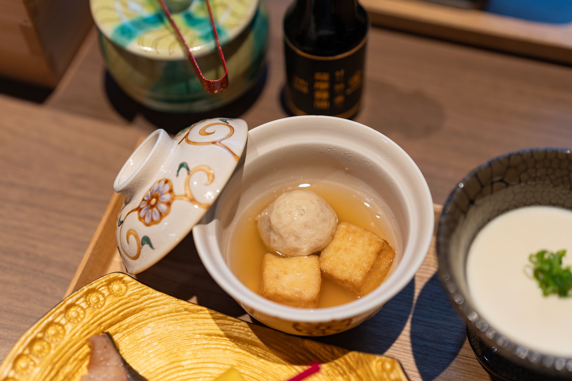 에피타이져는 아쿠마키(あくまき) 라는 규슈 남부(가고시마, 미야자키, 구마모토)의 전통 과자로 치마키(ちまき) 라고도 하는 찹쌀을 나무나 대나무를 태운 재에서 나온 재즙( あく) 에 담근 다음 그 찹쌀을 대나무의 껍질로 감싸 삶아 만든 요리를콩고물 같은 것을 입혀 튀겨낸 요리에 우니가 올려져 있었습니다.