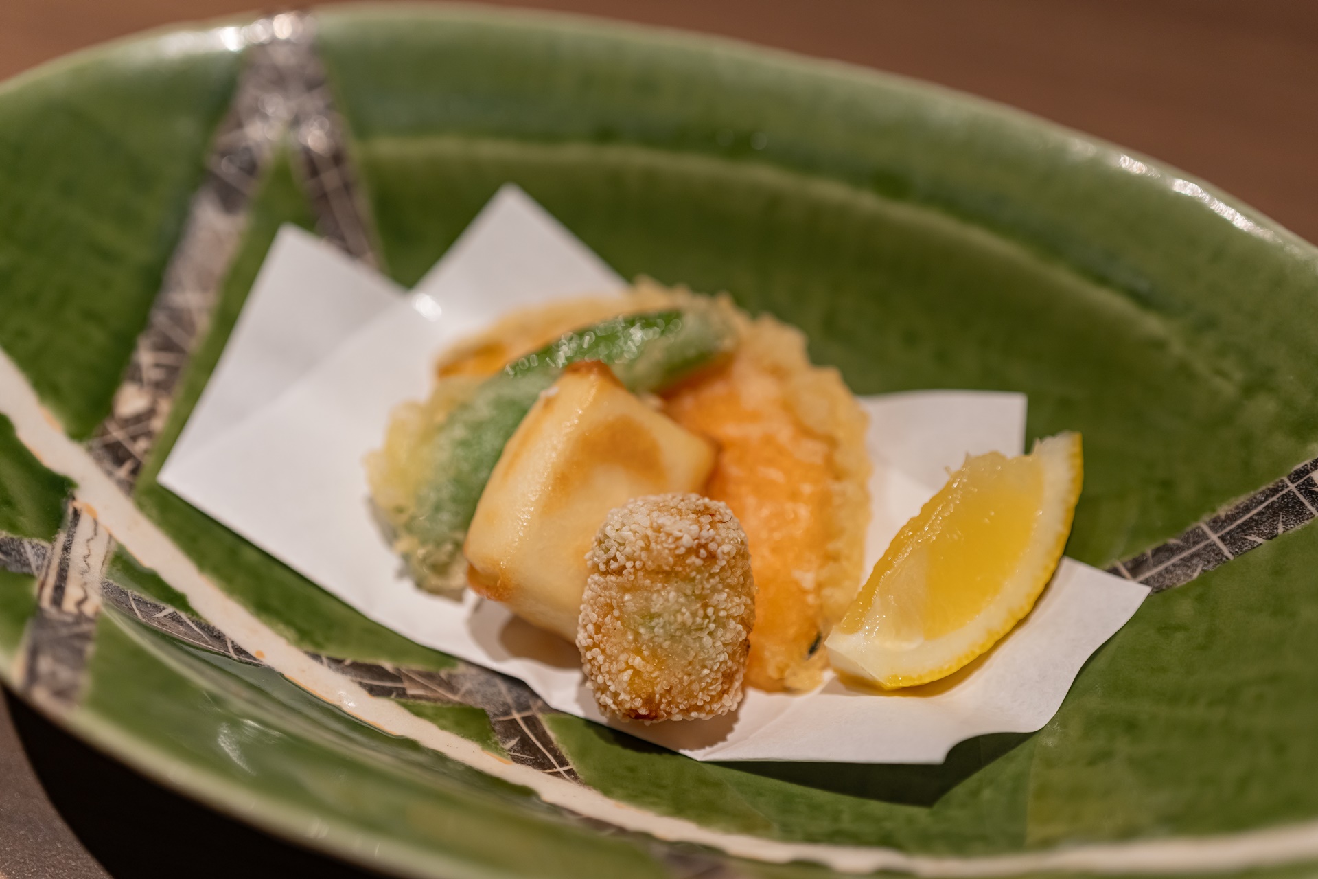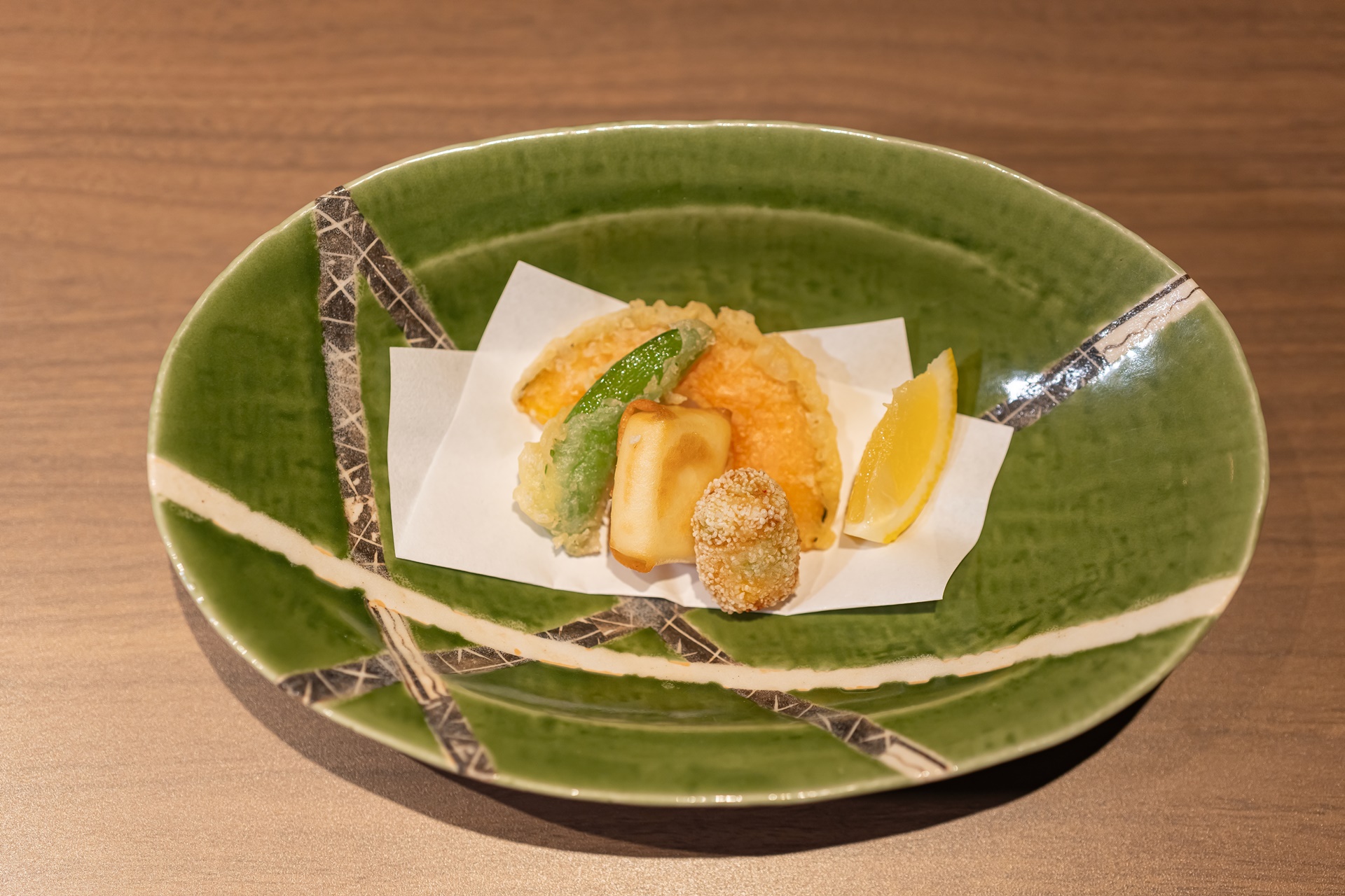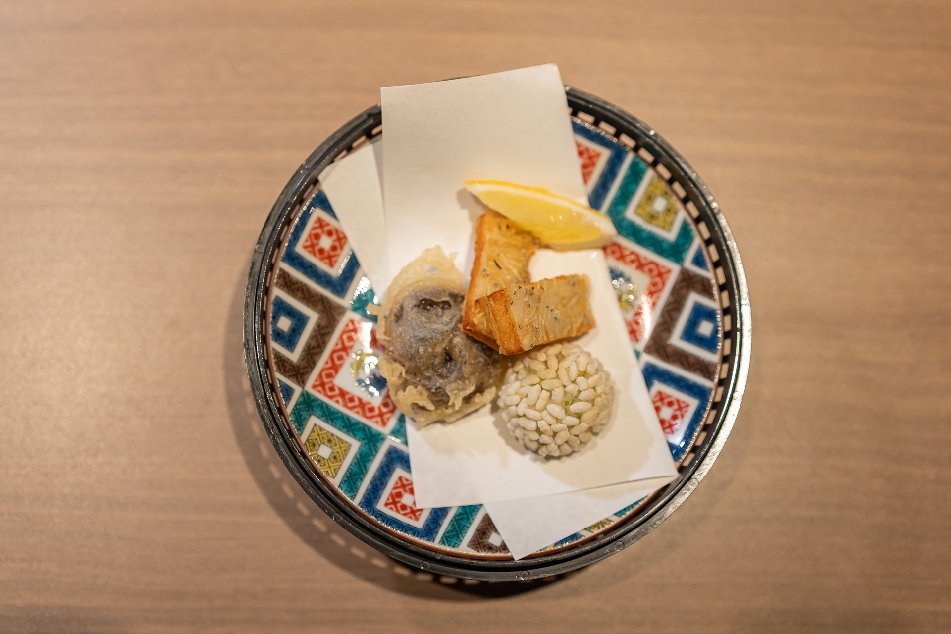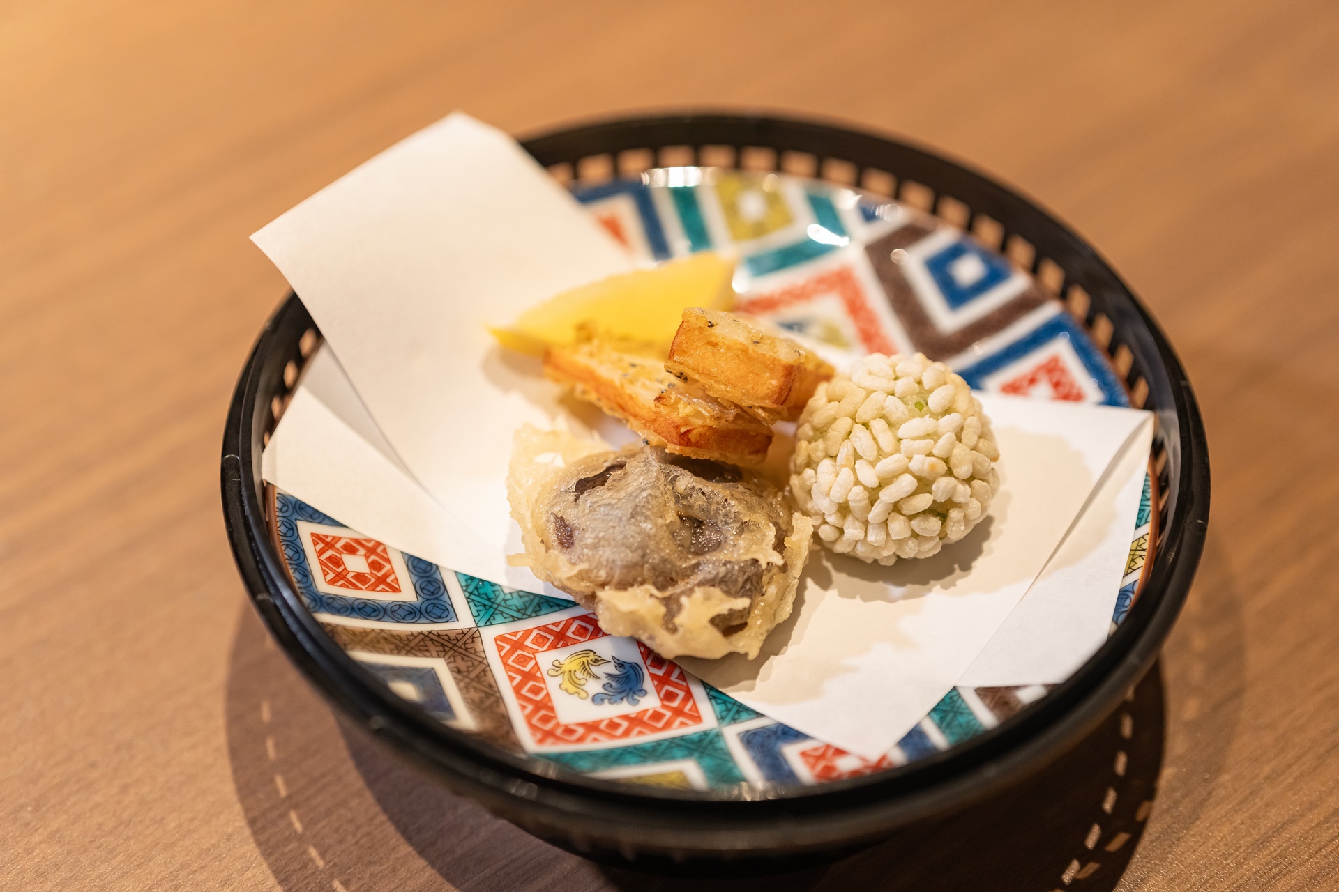 가고시마의 이쁜 도자기에 담겨 나온 튀김 요리