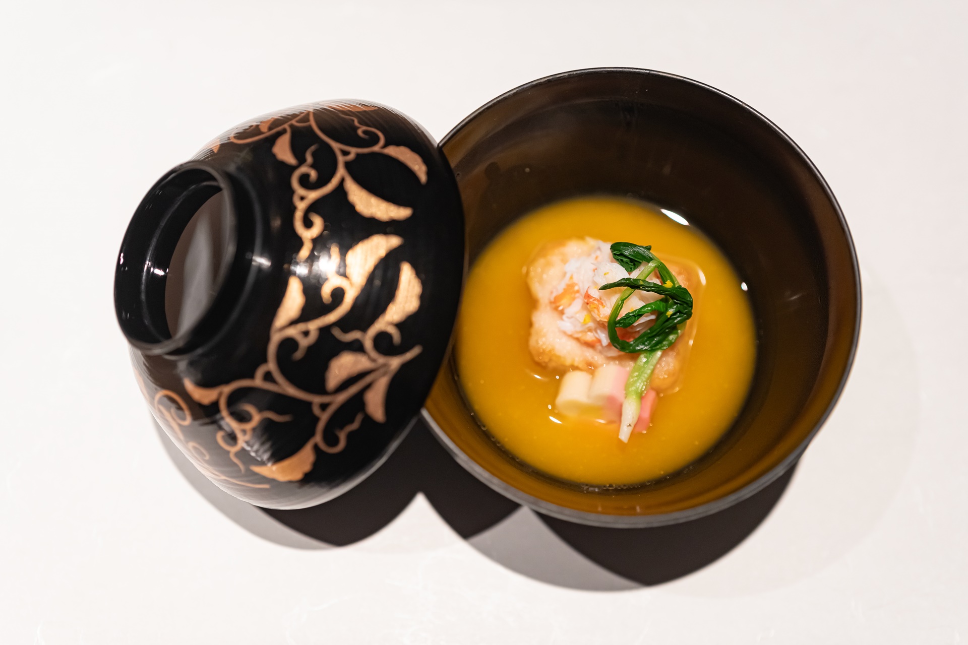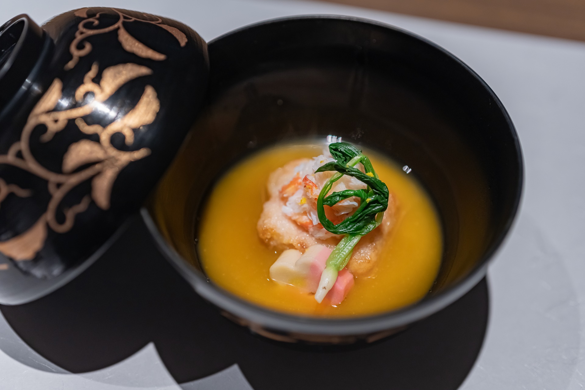 다음은 무떡, 다이콩모찌에 게살을 올린 스프요리가 나왔습니다.