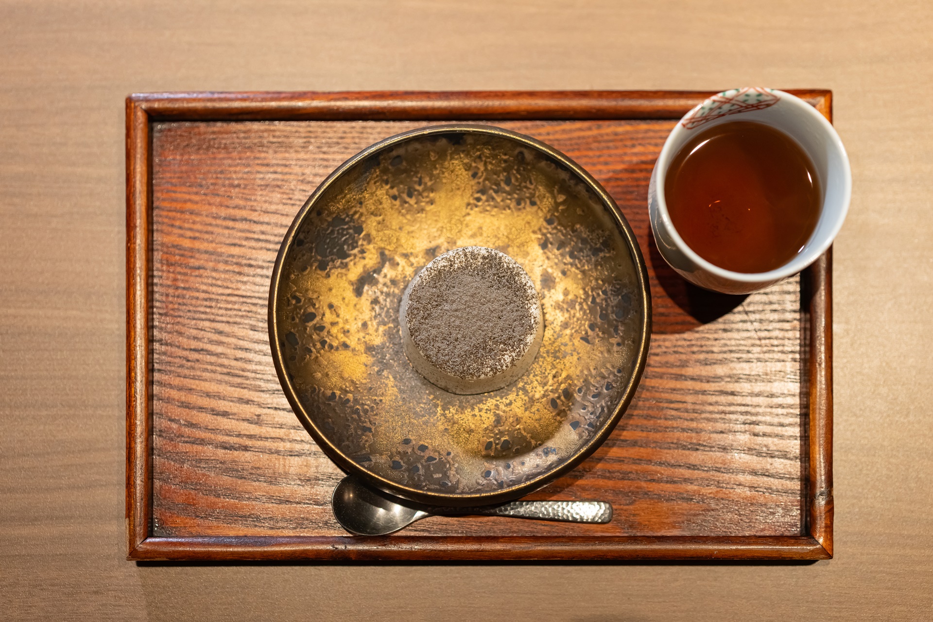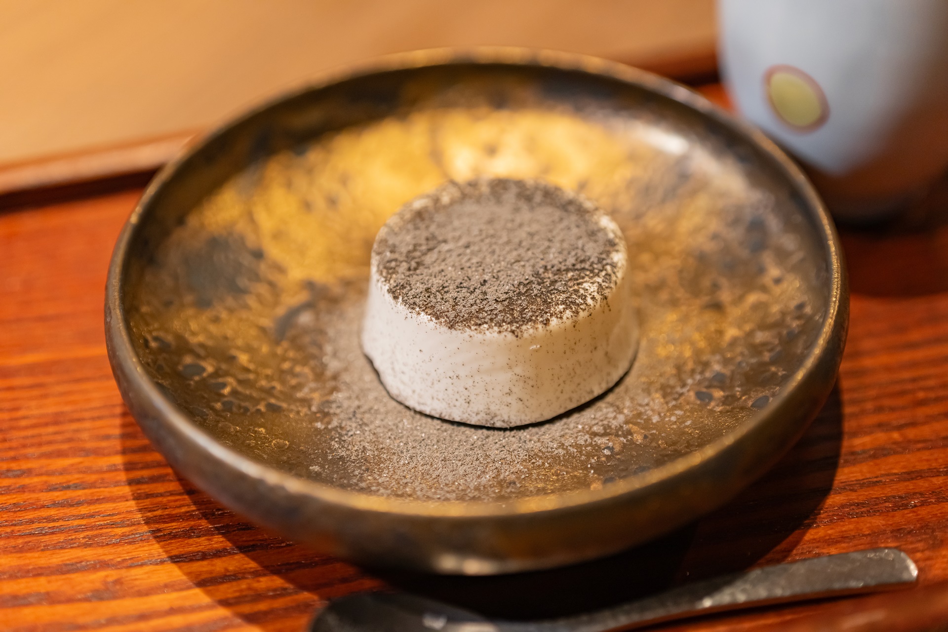 검은깨가 듬뿍 뿌려진 크림 무스와 가고시마의 호우지차 입니다.