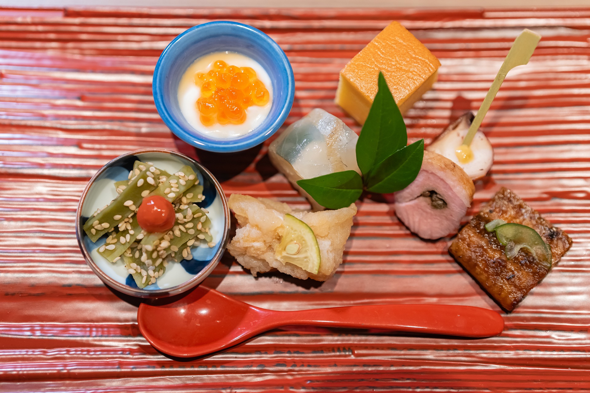 장어구이, 오리구이꼬치, 상추줄기, 연어알, 초밥 등의 다양한 요리가 이쁘게 모여 있었습니다.