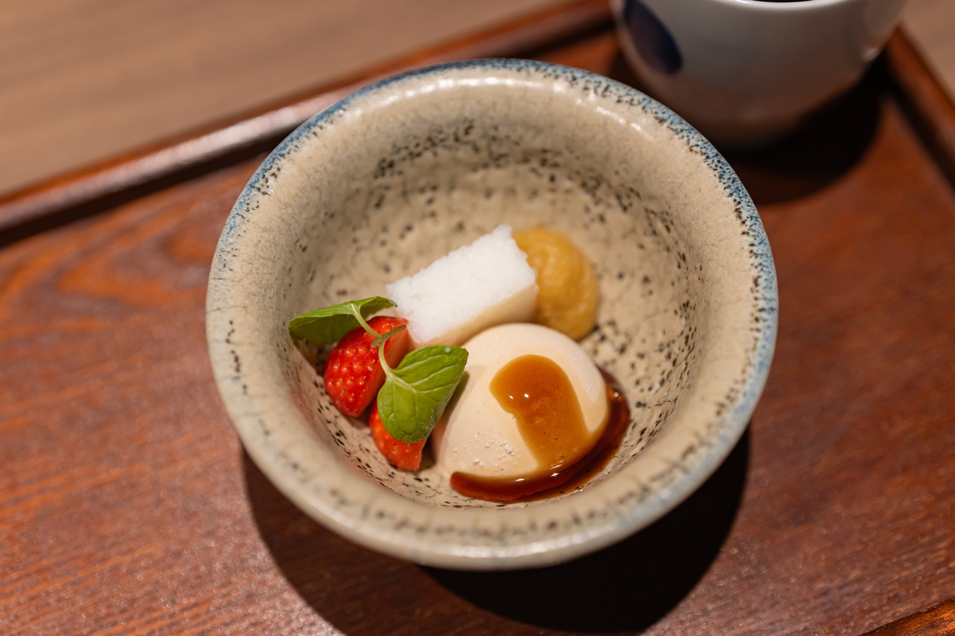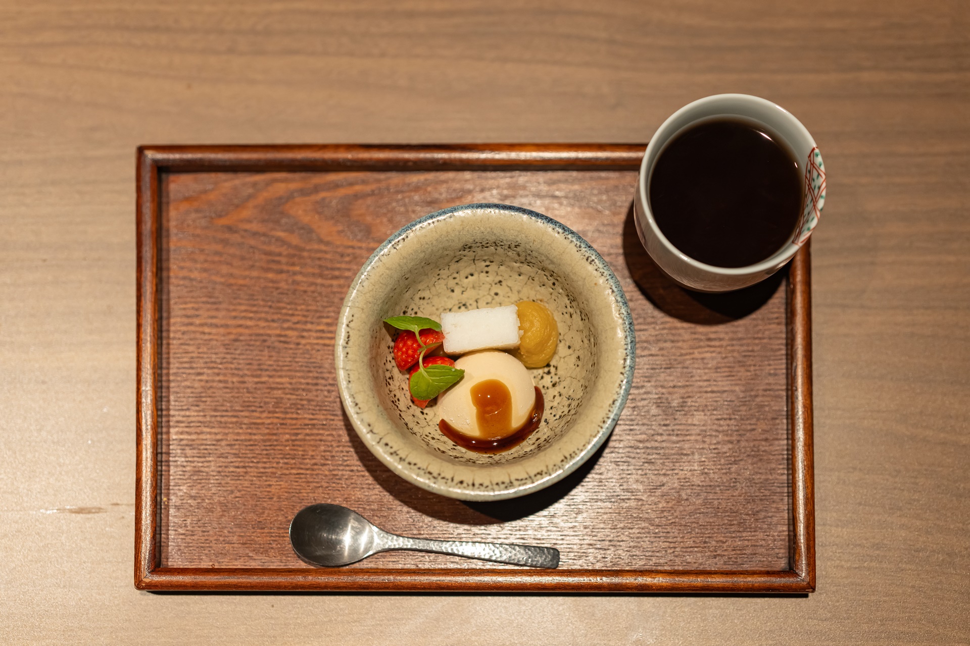 마무리는 디저트로, 딸기, 아이스크림, 가루칸(가고시마 특산품, 잣과 설탕을 섞어 양갱 모양으로 만든 과자)