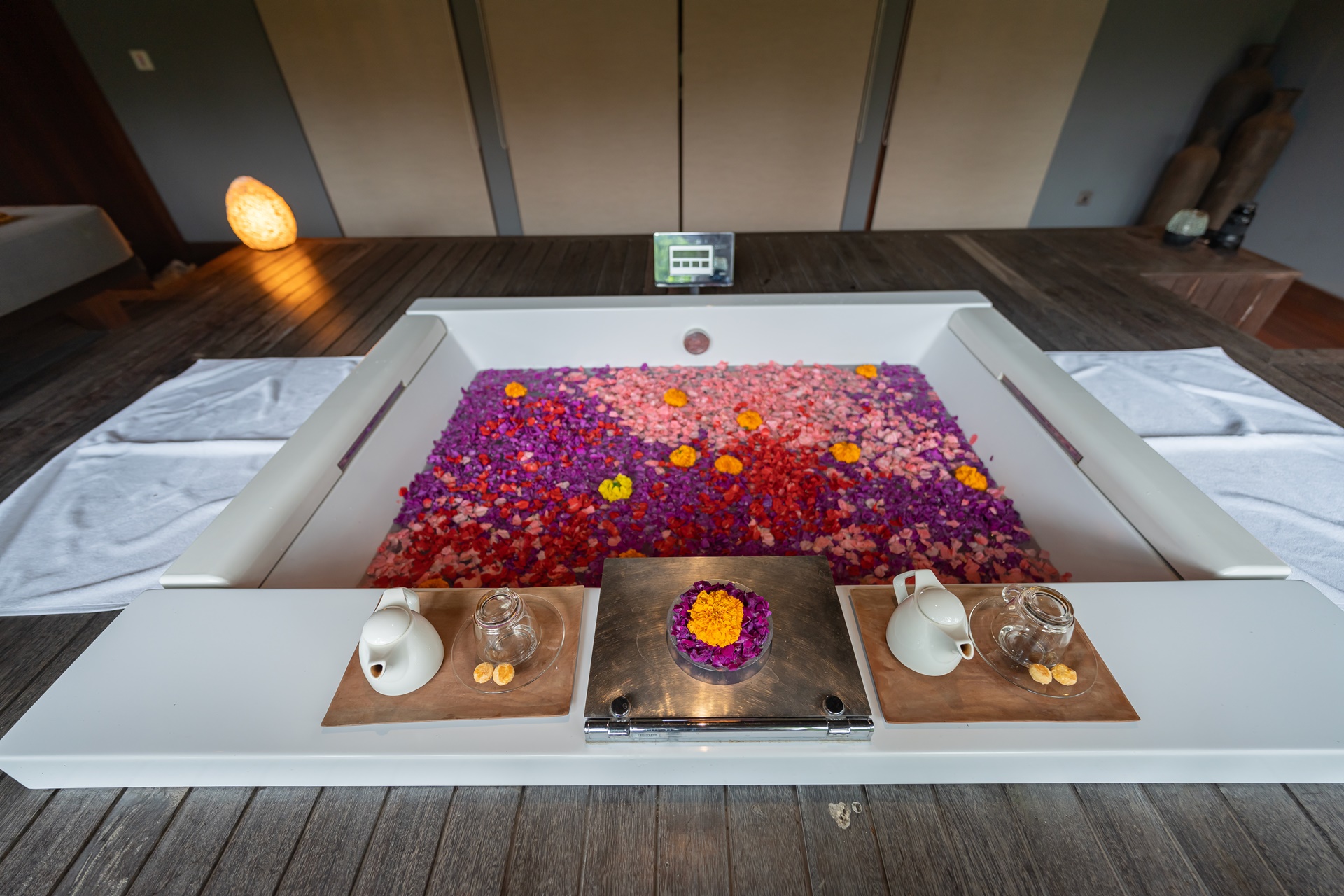 저희를 위해 물을 받고 있는 욕조를 지나 마사지 룸으로