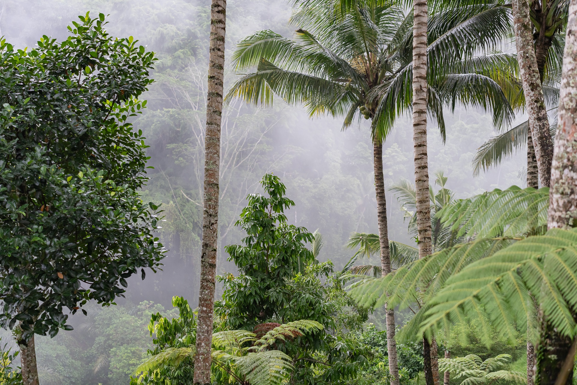 우붓에 비가 내리며 안개가 올라오기 시작합니다.