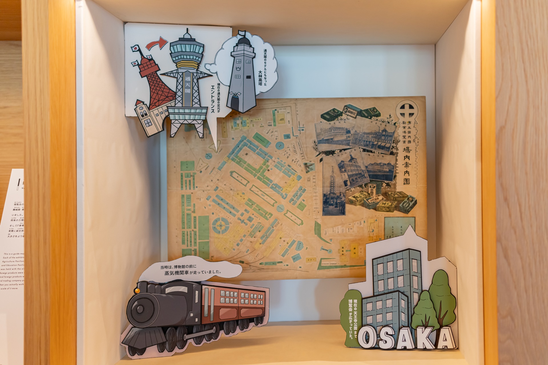 호텔 라이브러리 라운지에서는 122년 전의 소중한 박람회 자료를 미래의 디자이너들이 만든 공간에서 전시합니다. 기존 오사카 박람회와 오사카의 변화들을 알아 볼 수 있습니다.